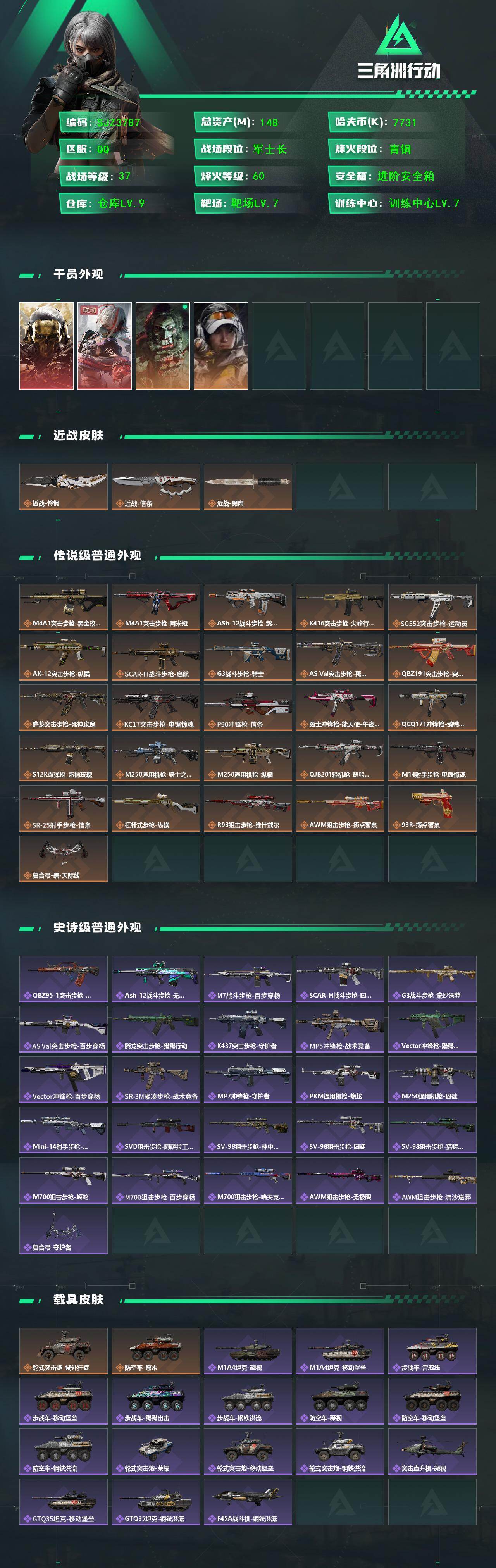 【SJZ3787】总资产(M):148M/哈夫币(K):7731K/哈夫币(K):7731K/传说枪皮数:26/全面战场等级:37_段位:军士长/烽火地带等级:60_段位:青铜/红狼-蚀金玫瑰/骇爪-维什戴尔/红狼-电锯惊魂/露娜-金牌射手/近战-怜悯/近战-信条/近战-黑鹰/M4A1突击步枪-蚀金玫瑰/M4A1突击步枪-阿米娅/ASh-12战斗步枪-鹅鸭杀/K416突击步枪-尖峰行动/SG552突击步枪-运动员/AK-12突击步枪-纵横/SCAR-H战斗步枪-启航/G3战斗步枪-骑士/AS V