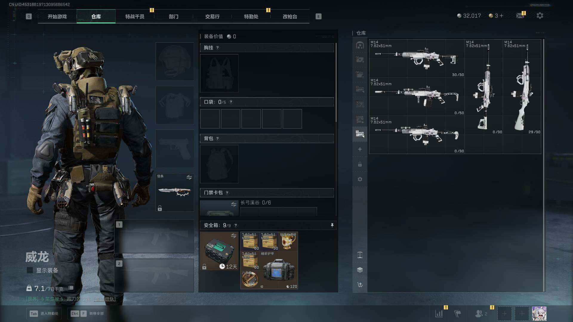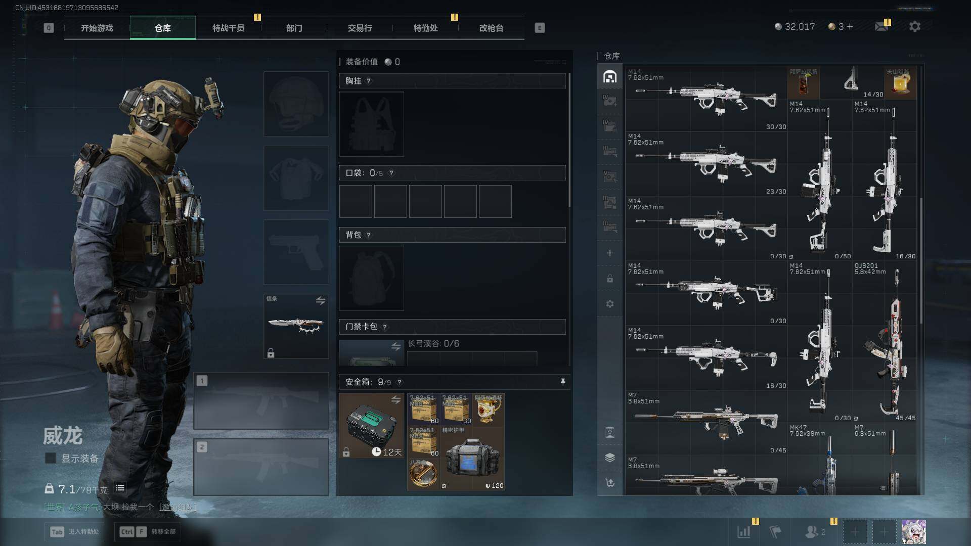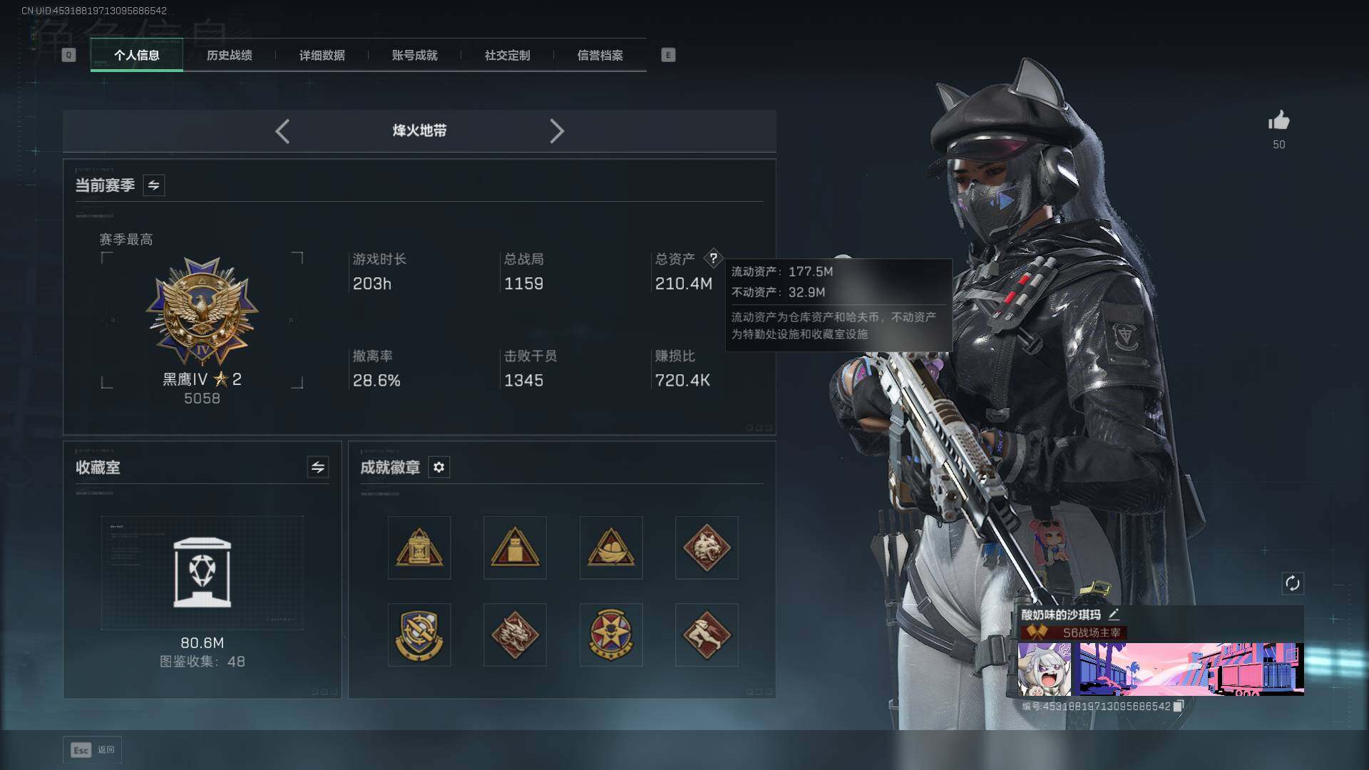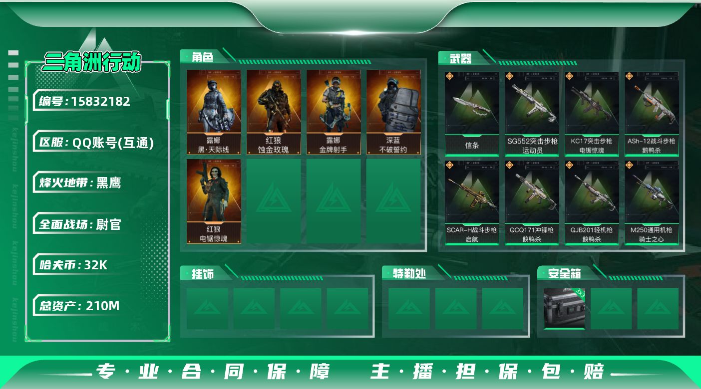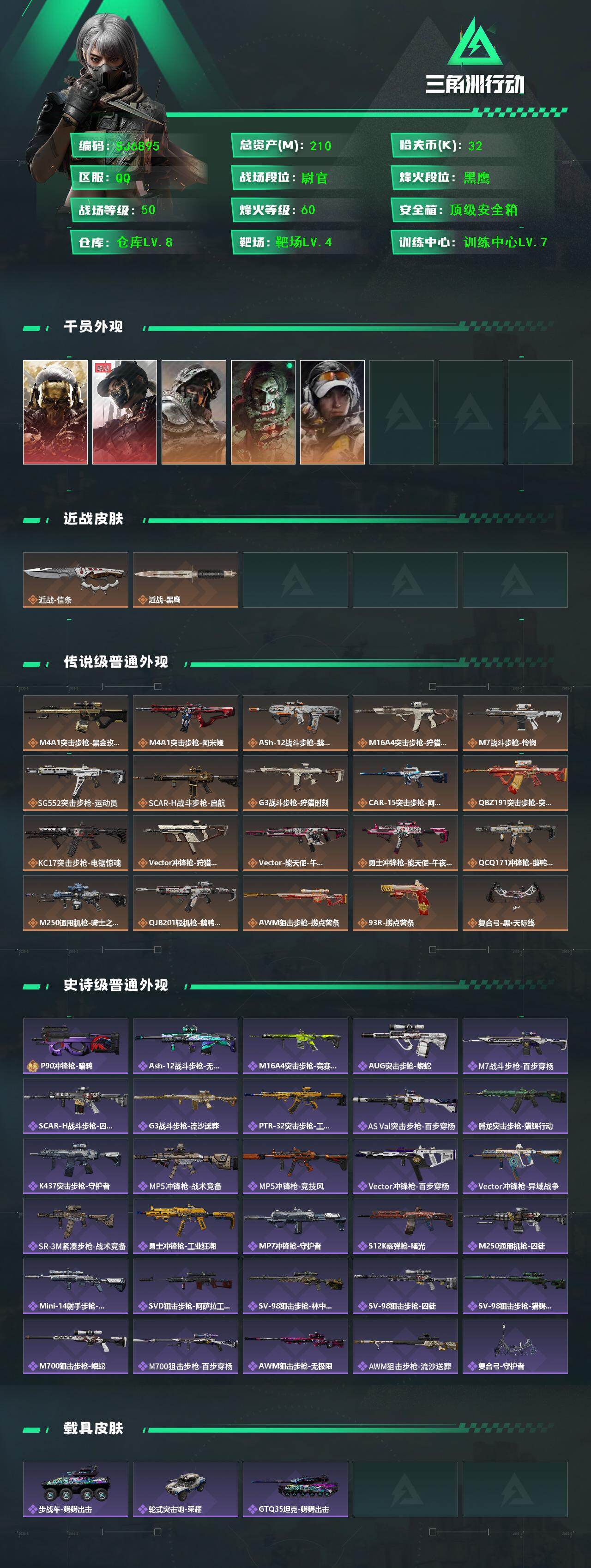 总资产(M):210M/哈夫币(K):32K/哈夫币(K):32K/传说枪皮数:20/全面战场等级: