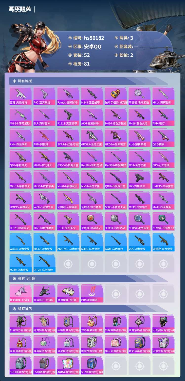 hs56182 安卓手Q-3王牌印记-2特效枪-3载具-26365热力值-52套装-81枪皮【2特效