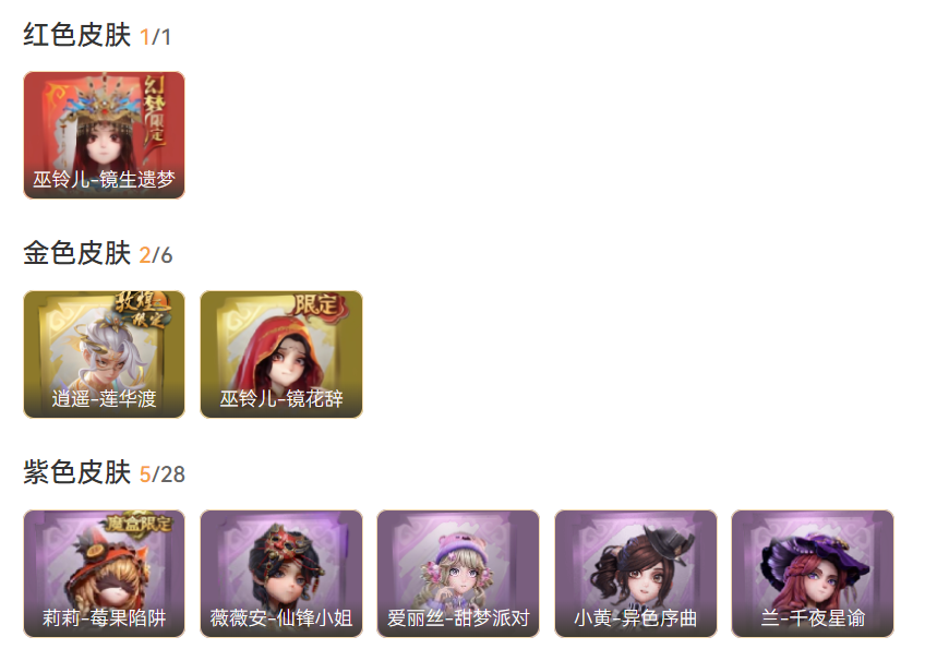 ZR198,红皮:1,金皮:2,紫皮:5,道具皮:17,铲铲币:44w,累充:20800金砖,幻梦皮肤:巫铃儿-镜生遗梦,金色皮肤:逍遥-莲华渡、巫铃儿-镜花辞,紫色皮肤:兰-千夜星谕、薇薇安-仙锋小姐、爱丽丝-甜梦派对、莉莉-莓果陷阱、小黄-异色序曲,员工:小黄、爱丽丝、零、逍遥、薇薇安、巫铃儿、莉莉、爱德华、兰、小满,赛季魔盒:普通魔盒,美妆:暗夜小恶魔,载具:惊奇万圣涂装,头饰:樱桃奶油布丁