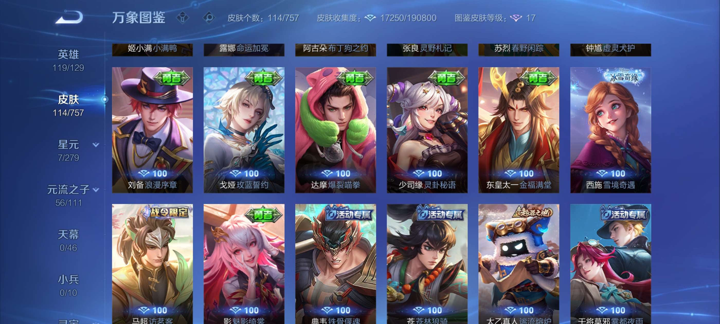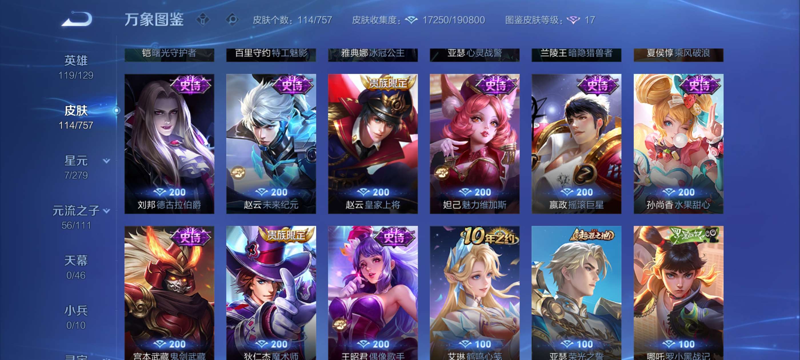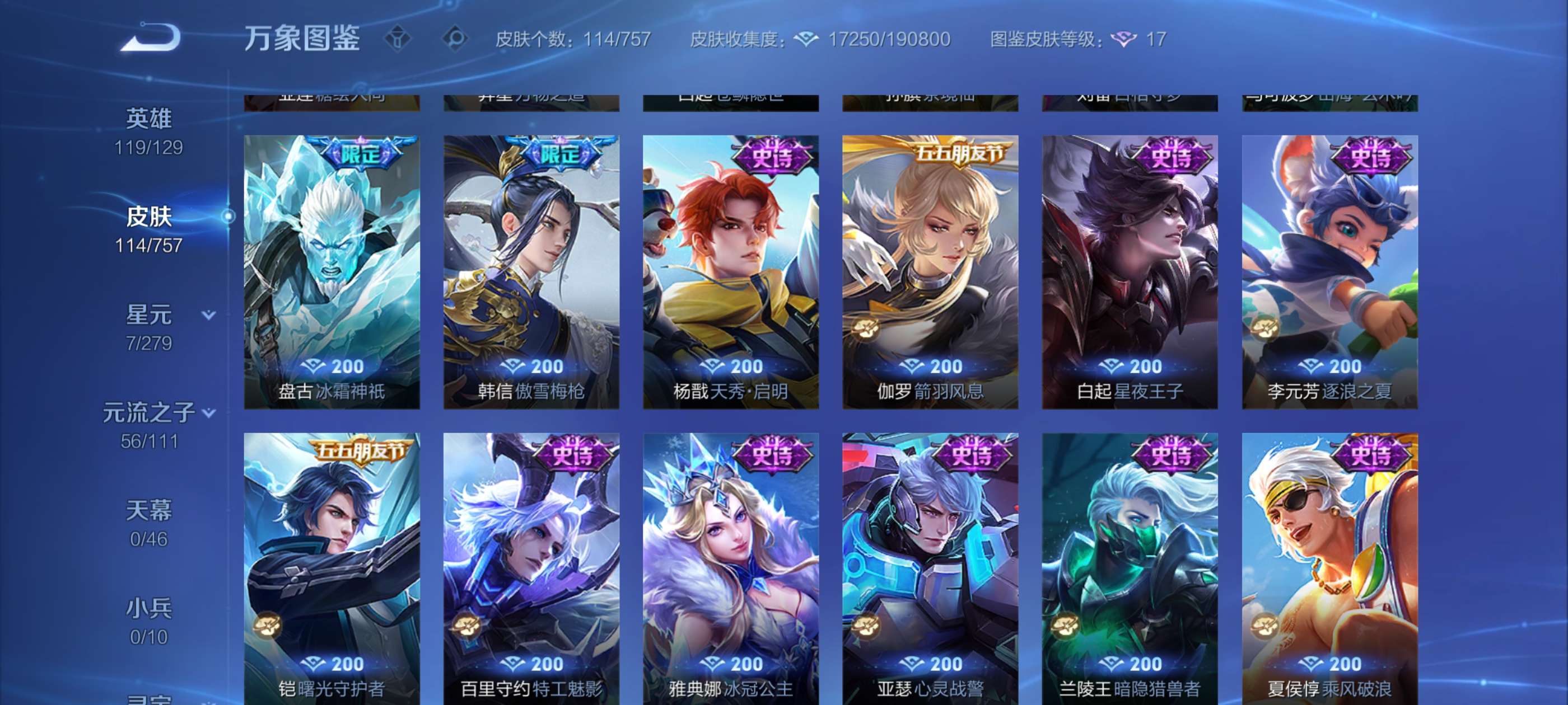 实价不刀超值10多个传说皮肤,荣耀水晶240多快出了,有盘古冰皮,账号贵族七