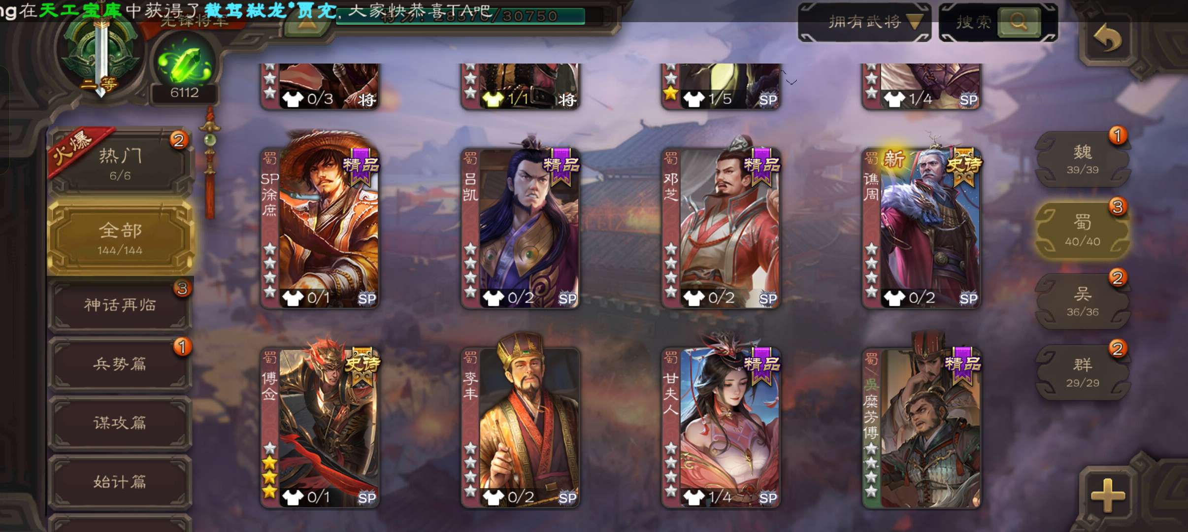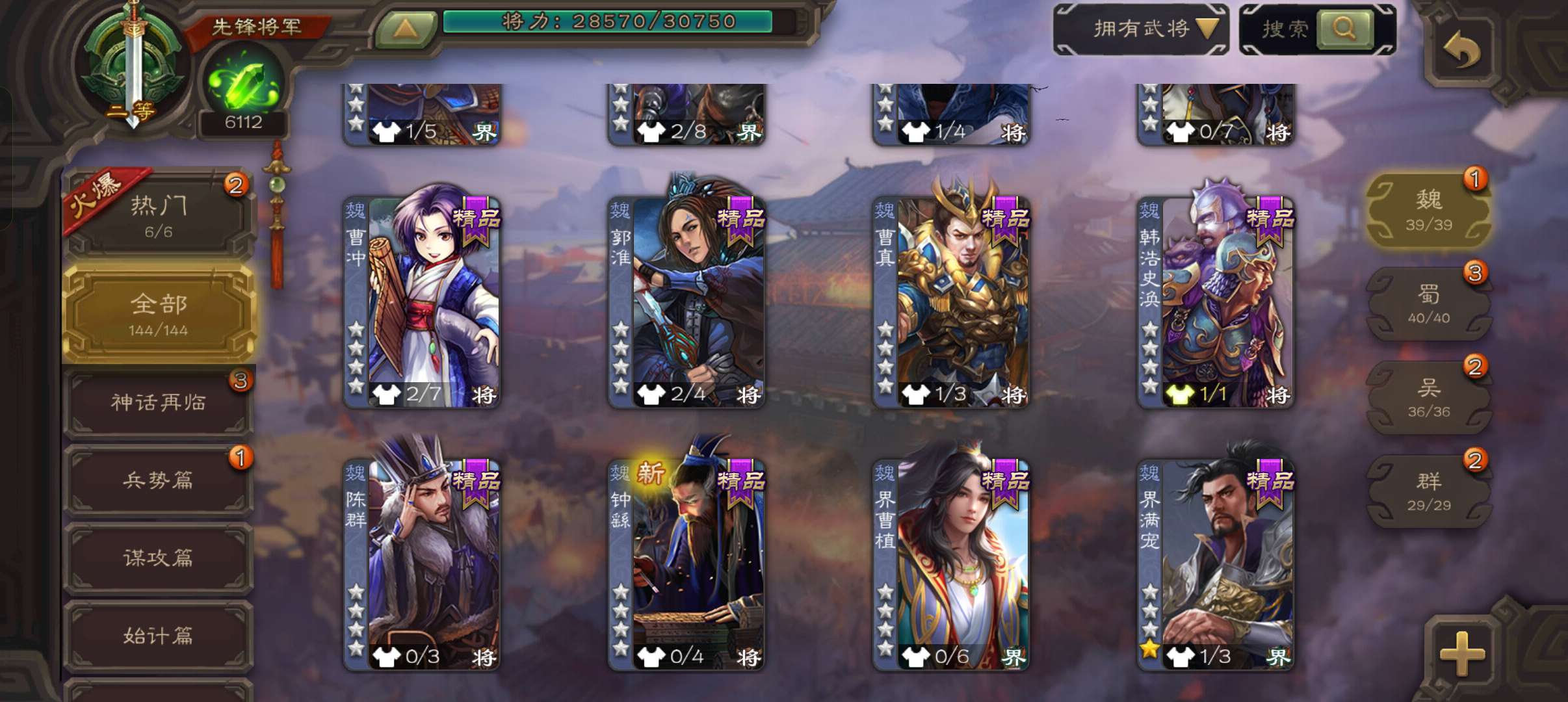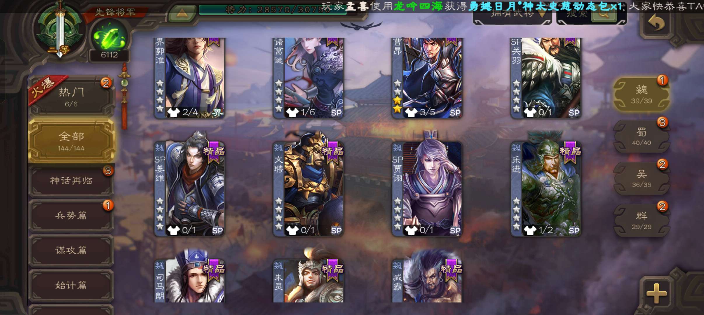 5史诗先锋,6100魂,傅佥回廊动白马回廊神吕布谯周界黄忠,天工杨奉,回廊曹昂甘夫人144将