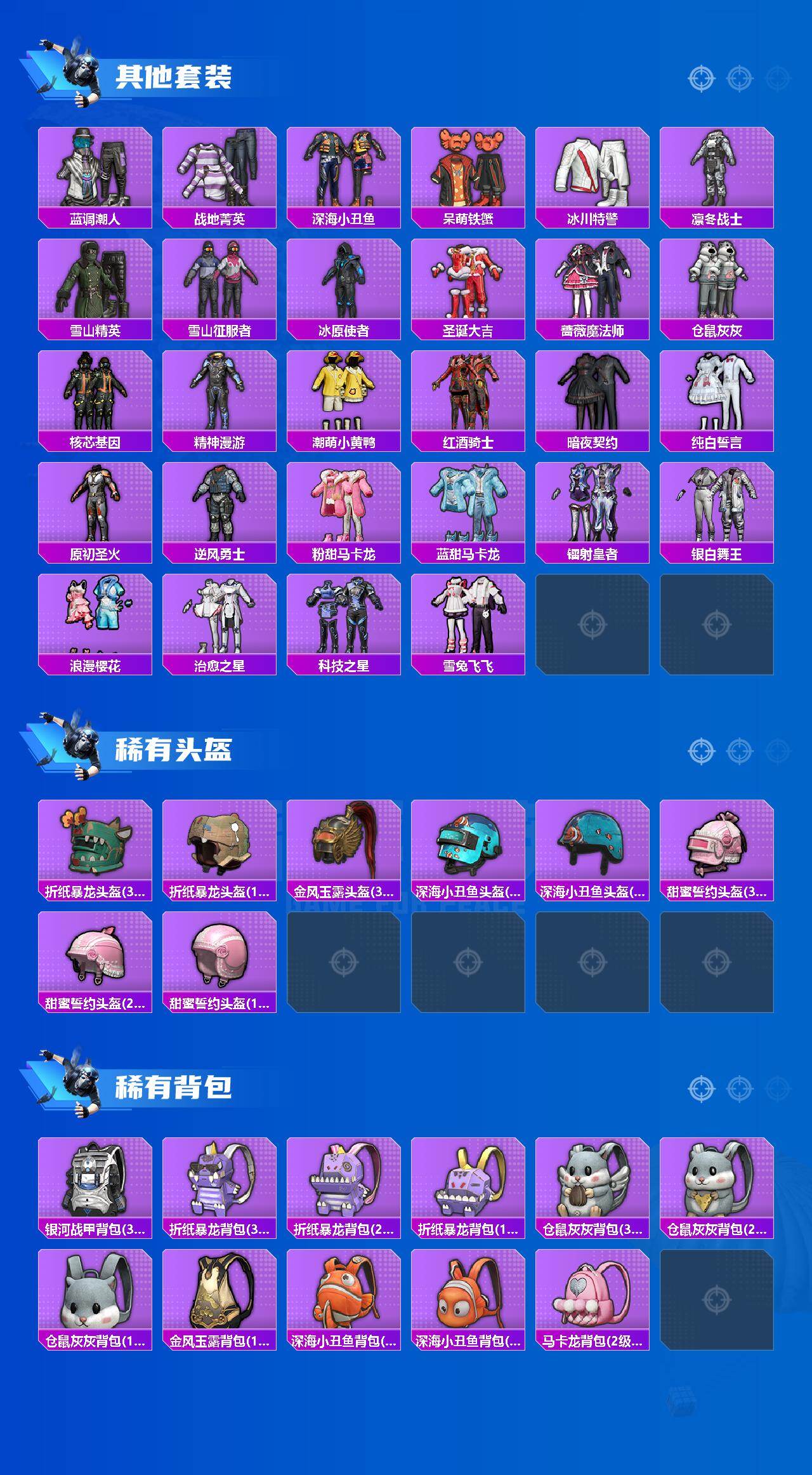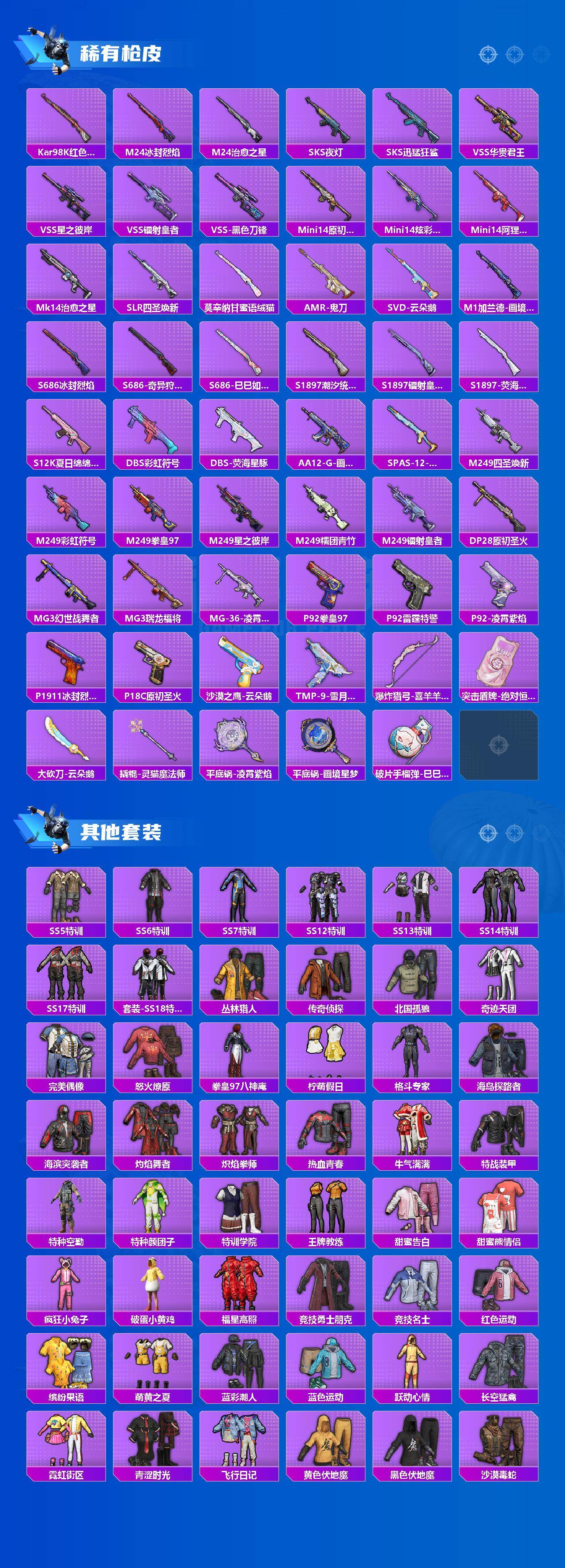 【粉色枪皮等级】:M416-五爪金龙(七级),GROZA-镜光银凌(五级),AUG-暖羊咩咩(五级),Kar98K-巳巳如意(五级),DP-28-豹影疾电(五级)