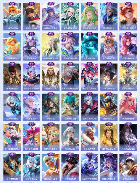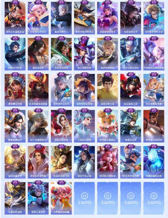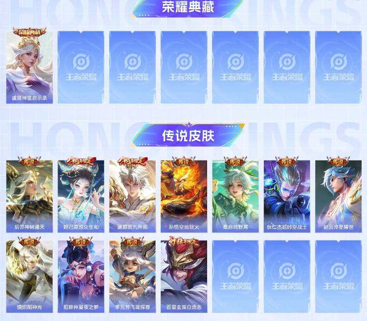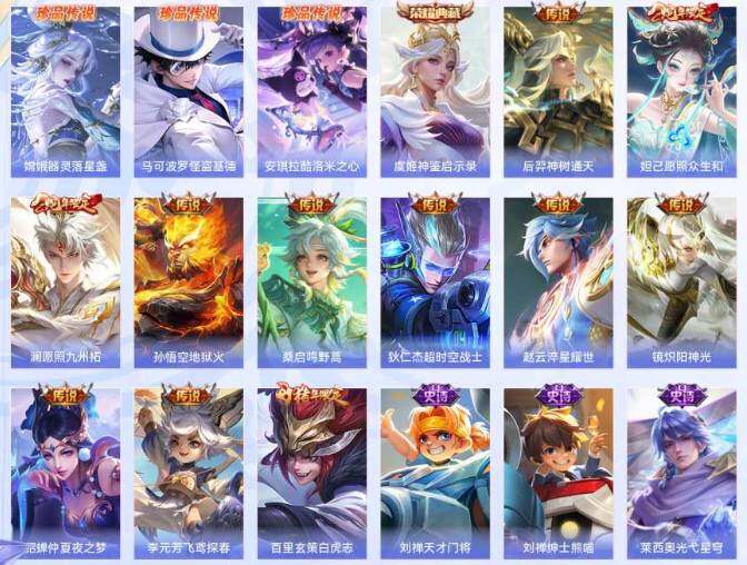 【传说皮肤】:后羿神树通天,妲己愿照众生和,澜愿照九州拓,桑启鸣野蒿,赵云淬星耀世,李元芳飞鸢探春,镜炽阳神光,百里玄策白虎志,貂蝉仲夏夜之
