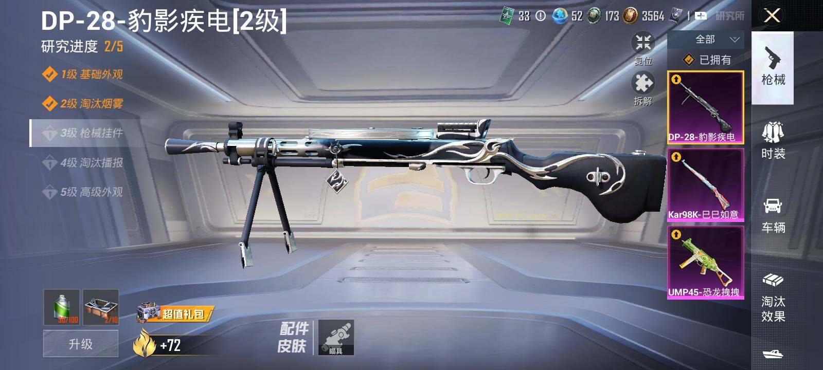 【粉色枪皮等级】:UMP45-恐龙拽拽(七级),Kar98K-巳巳如意(五级),DP-28-豹影疾电(二级)