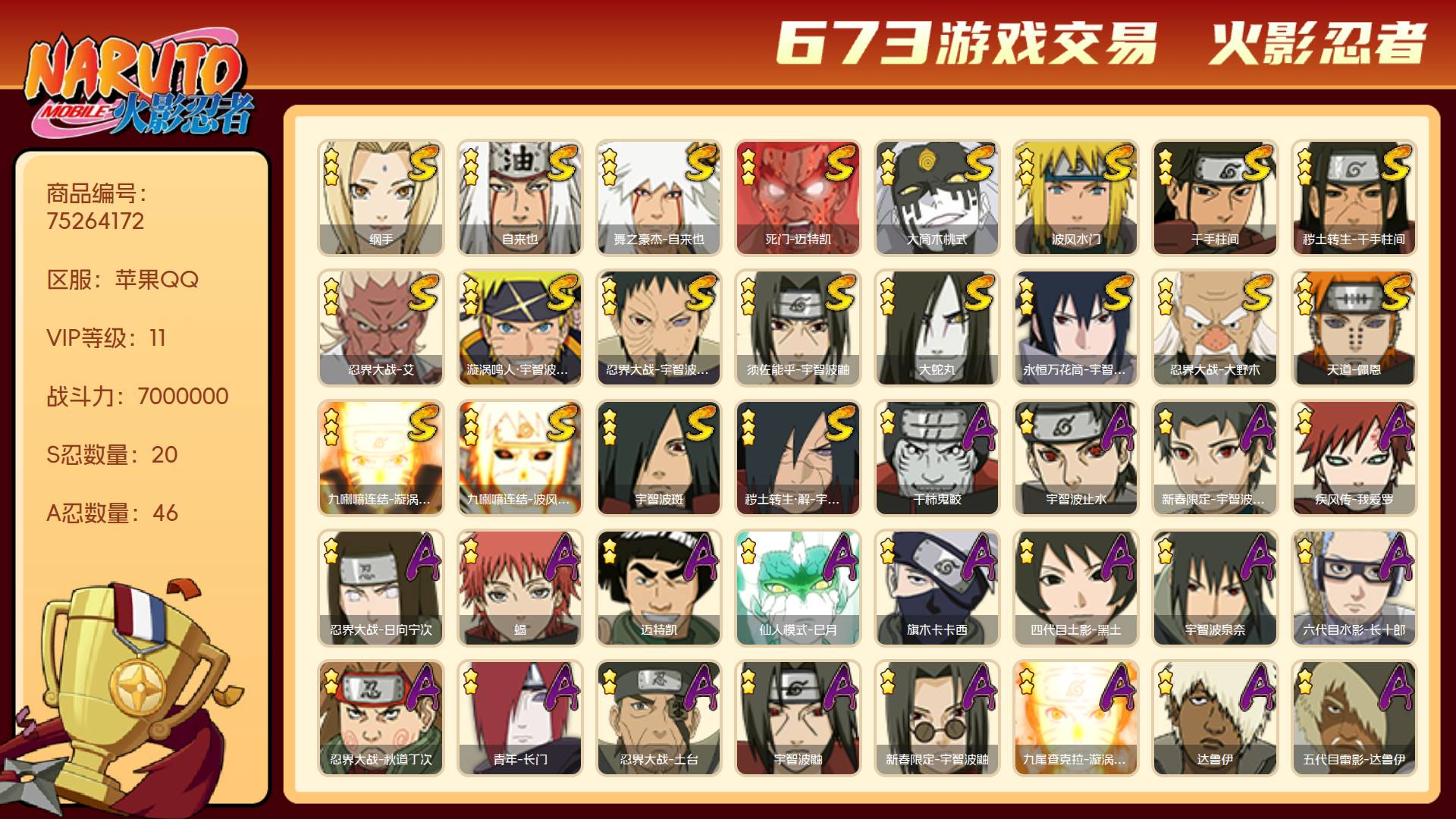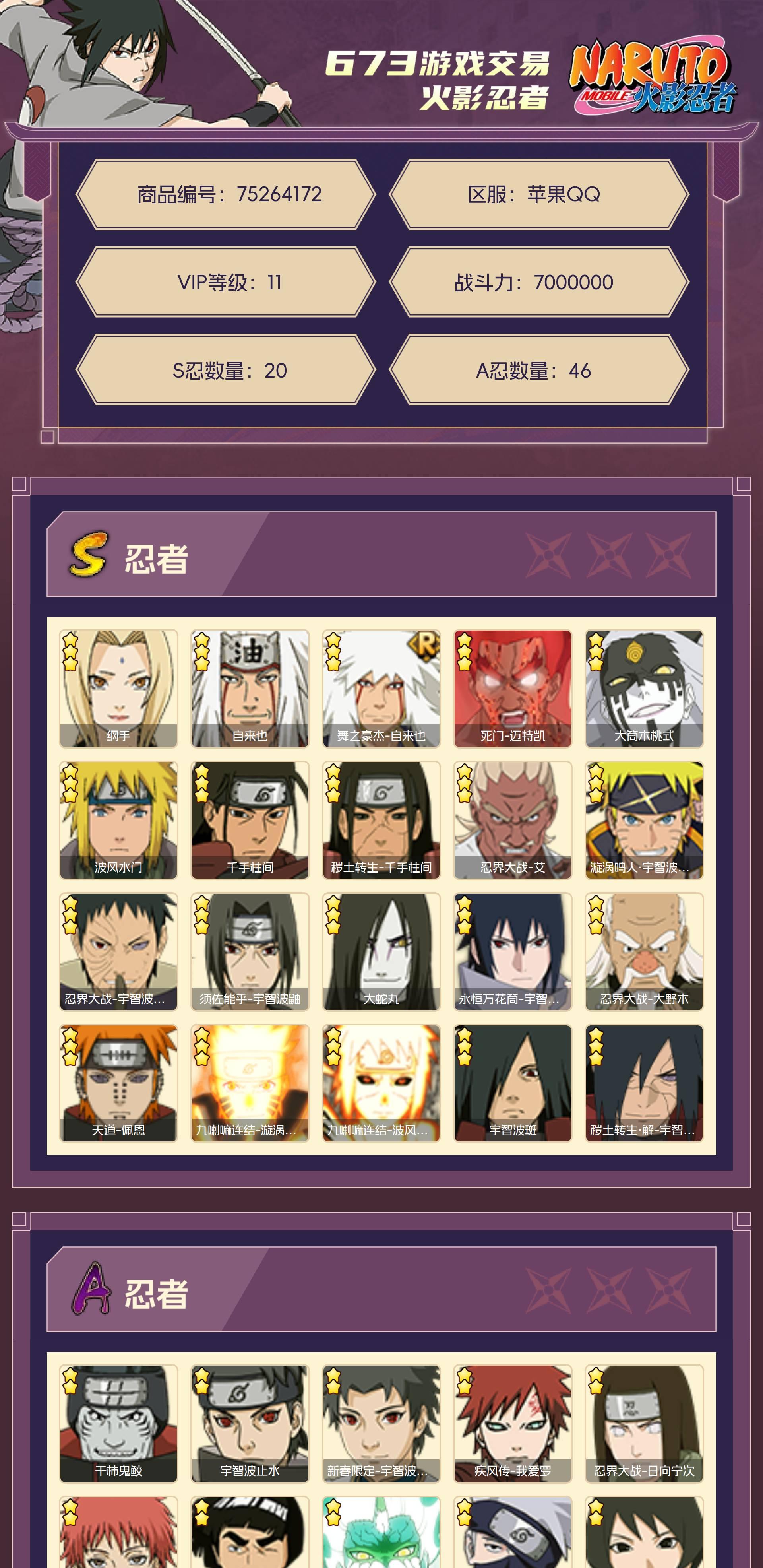 角色等级145 金币20000 战斗力7000000 S忍20 A忍46 11 段位暗部