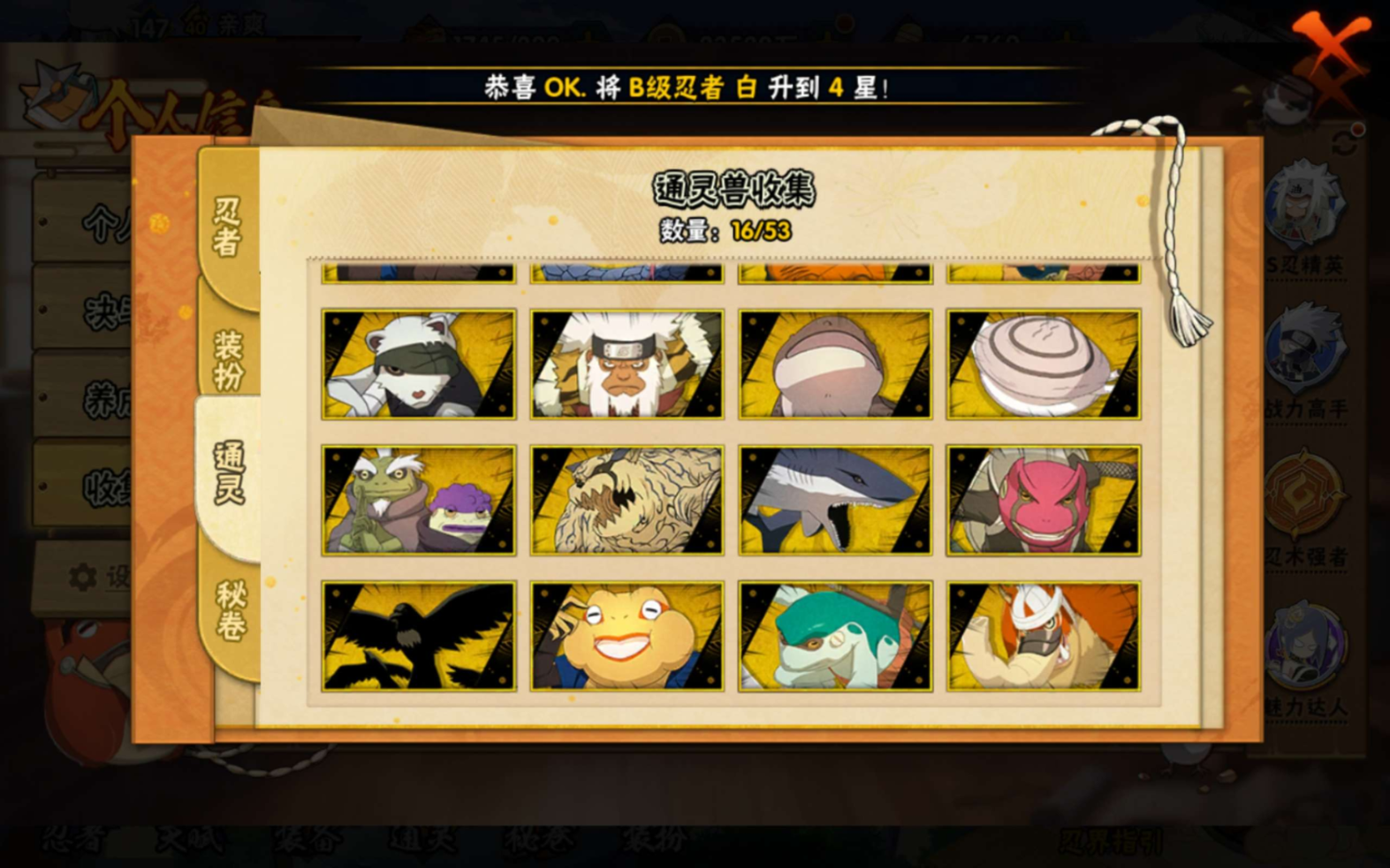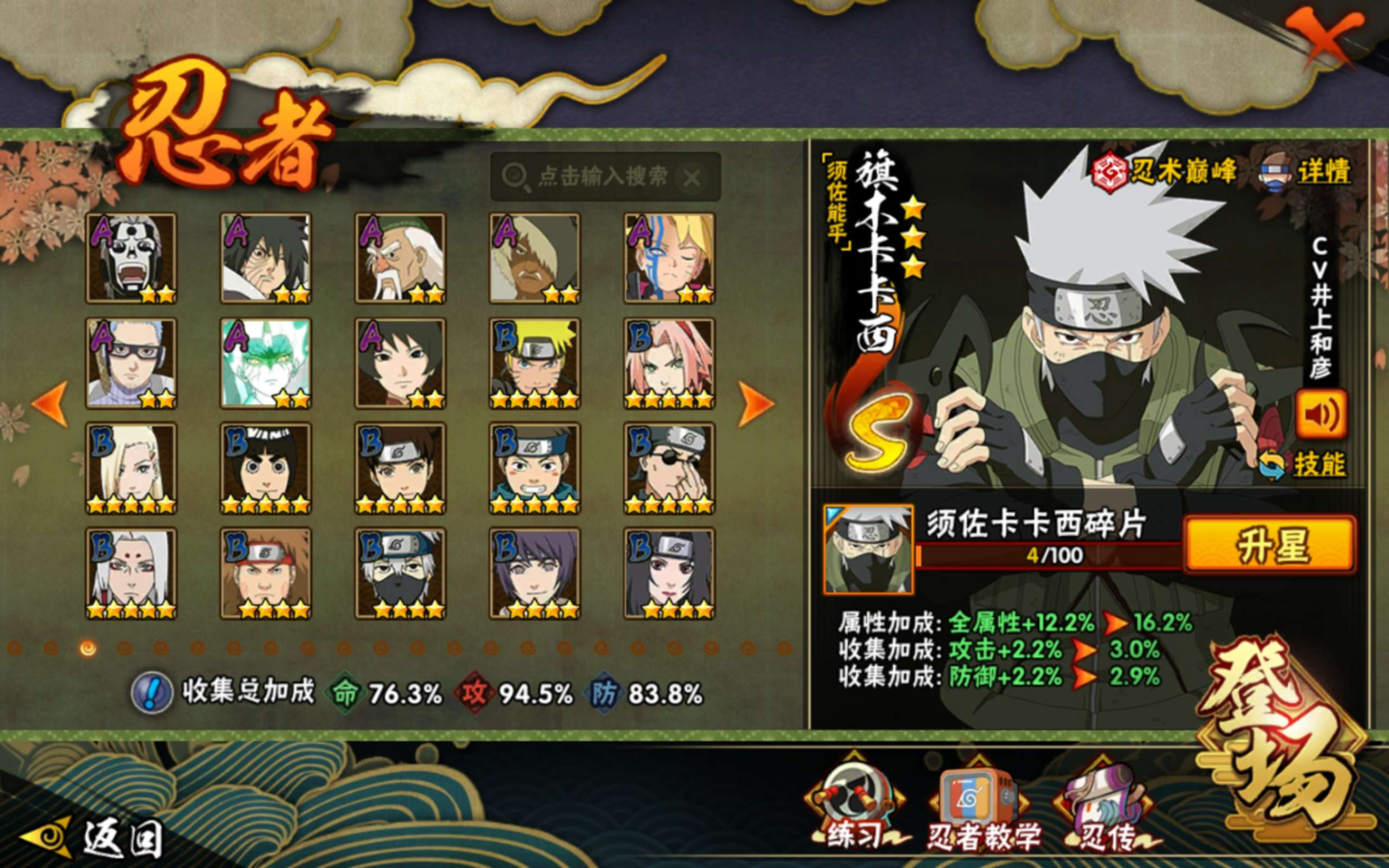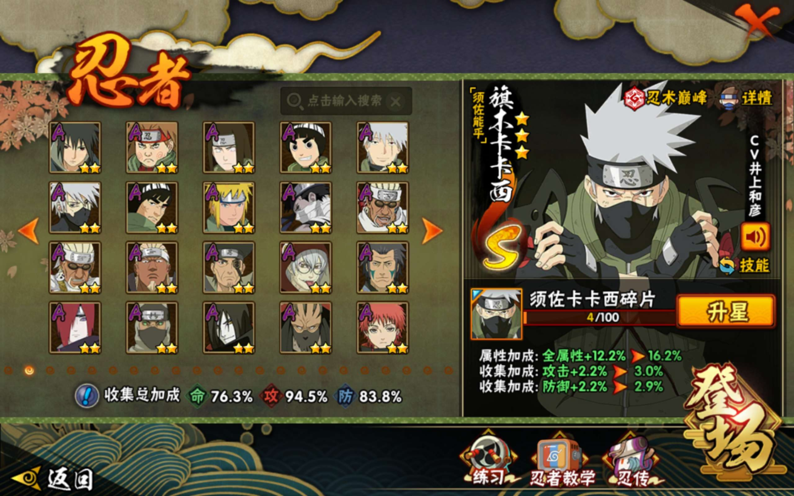 【S级忍者】迈特凯「死门」(3星),旗木卡卡西「须佐能乎」(3星),自来也「传说中的三忍」(3星),宇智波斑「秽土转生·解」(3星),艾「忍界大战」(3星),千手柱间「秽土转生」(3星),波风水门「九喇嘛连结」(3星),自来也「舞之豪杰」(3星),宇智波鼬「须佐能乎」(3星),佩恩「天道」