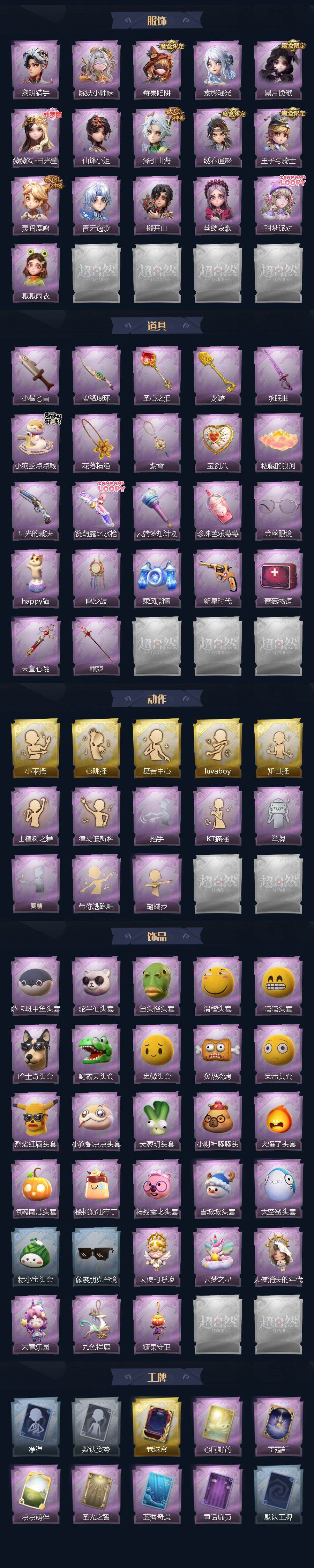 【紫色皮肤】:小黄-呱呱雨衣,逍遥-绣春逍影,逍遥-泽引山海,艾伦-黎明猎手,爱丽丝-丝缕哀歌,爱丽丝-甜梦派对,薇薇安-仙锋小姐,薇薇安-白光莹,薇薇安-黑月挽歌,零-搬开山,零-青云逸歌,巫铃儿-素影瑶光,阿念-王子与骑士,阿念-灵昭鹿鸣,莉莉-莓果陷阱,莉莉-除妖小师妹