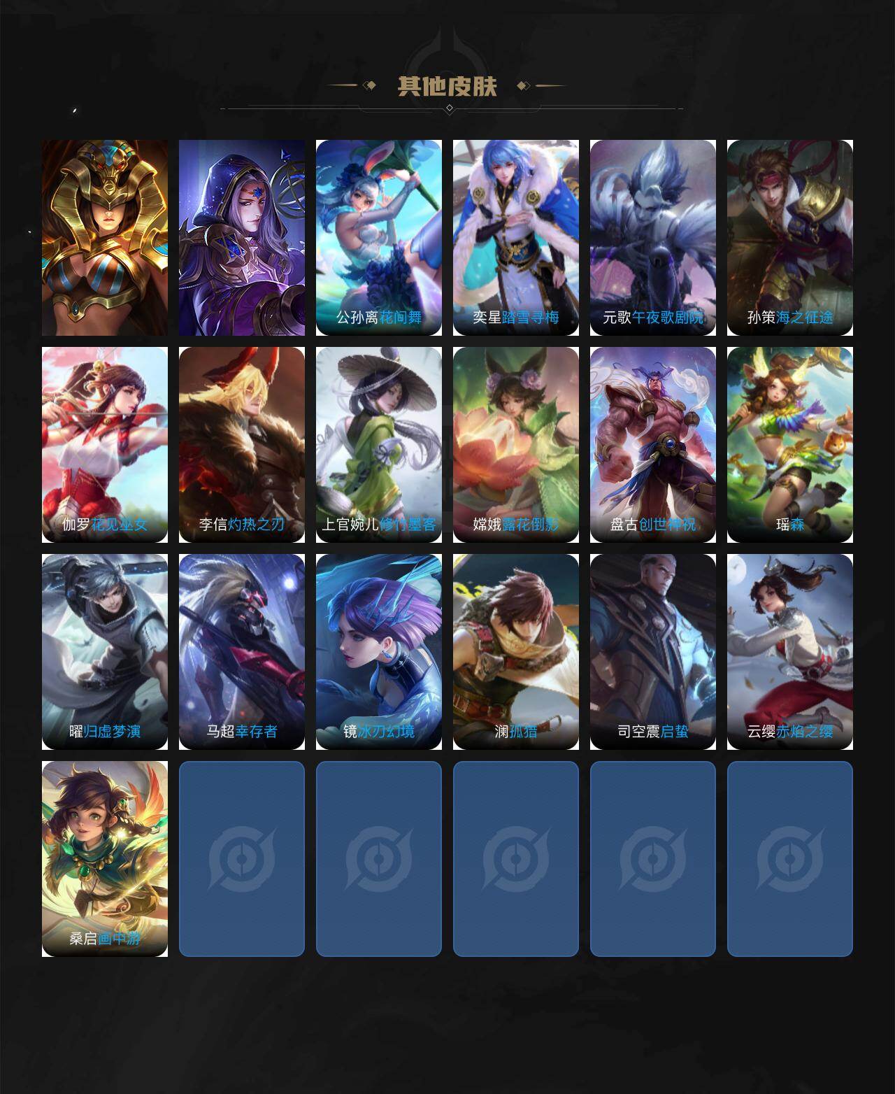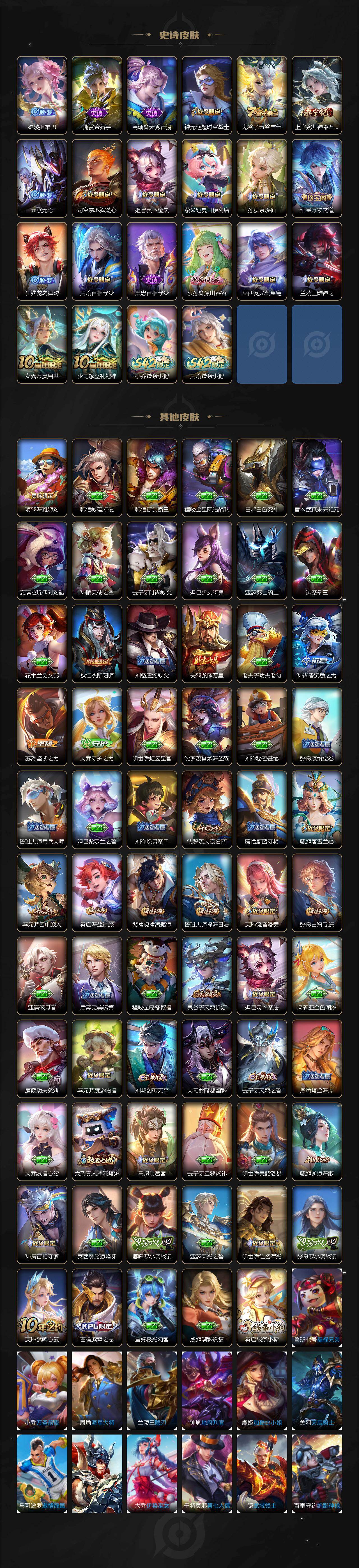 【传说皮肤】:后羿神树通天,公孙离云诺千山,司空震愿照山河定,妲己愿照众生和,澜愿照九州拓,澜逐花归海,澜电玩雷克斯,马超无双飞将,孙策挚爱之约,孙策末日机甲,铠绛天战甲,镜炽阳神光,李信一念神魔,花木兰冠军飞将