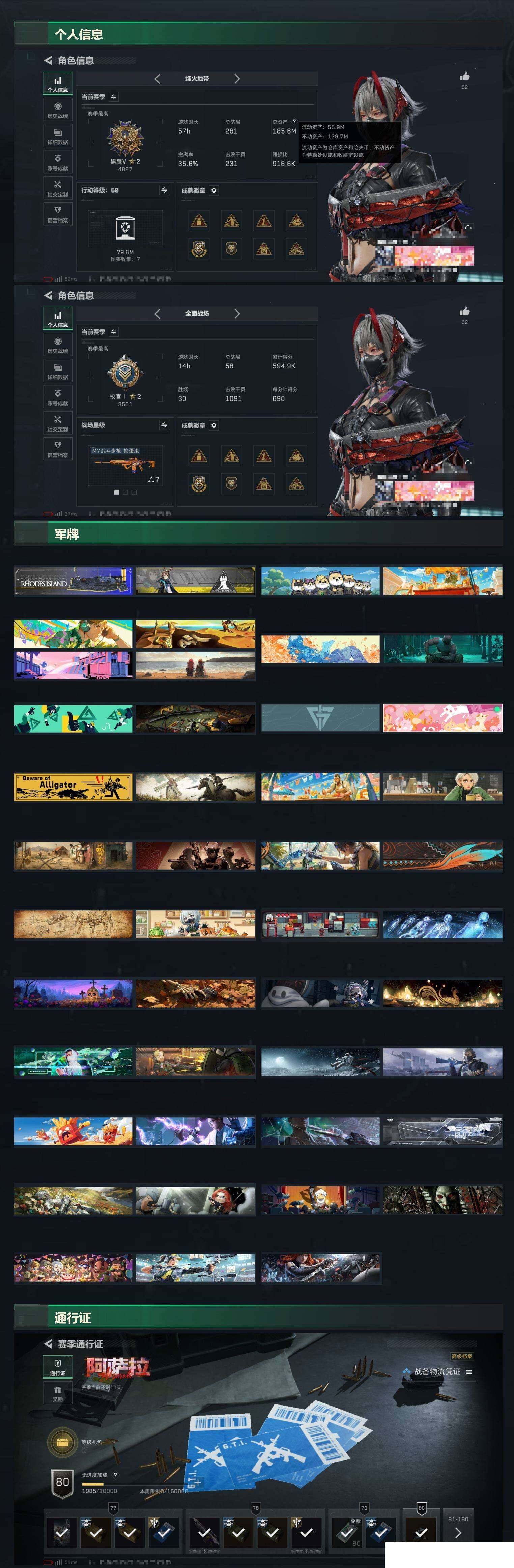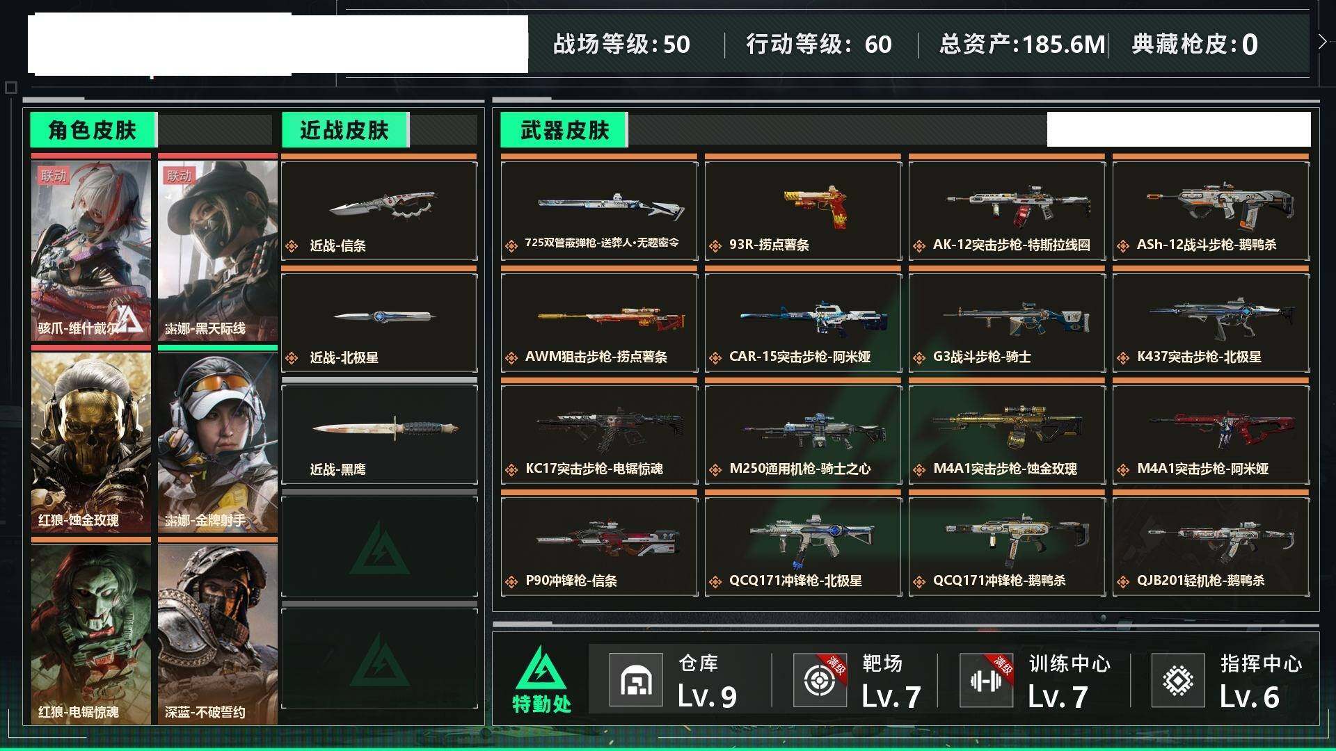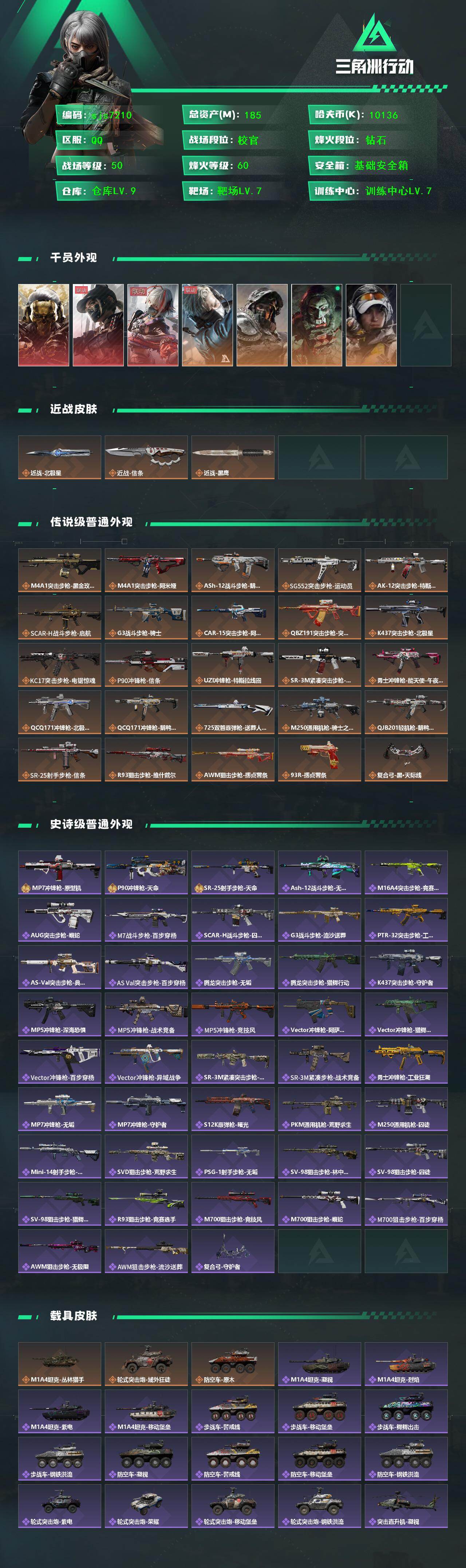 可二次 180M资产 维什戴尔 蚀金玫瑰 天际线 信条 北极星 烽火地带段位: 钻石 全面战场段位: 校官 总资产: 185000000 哈夫币: 10136000