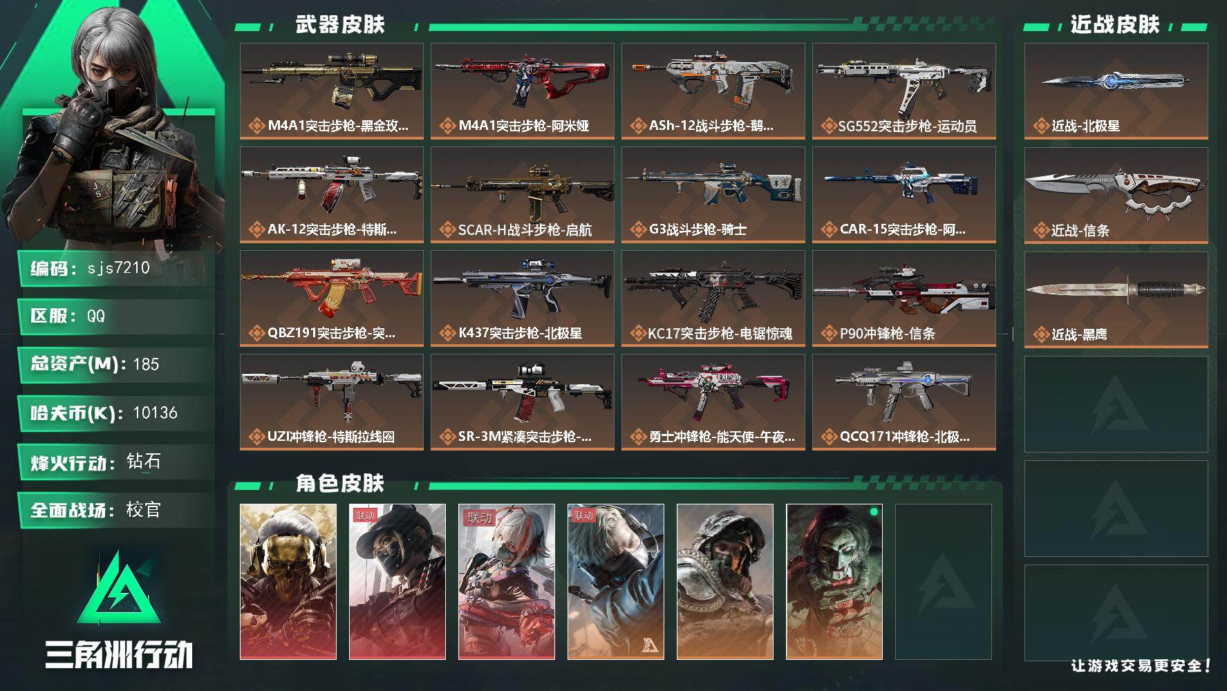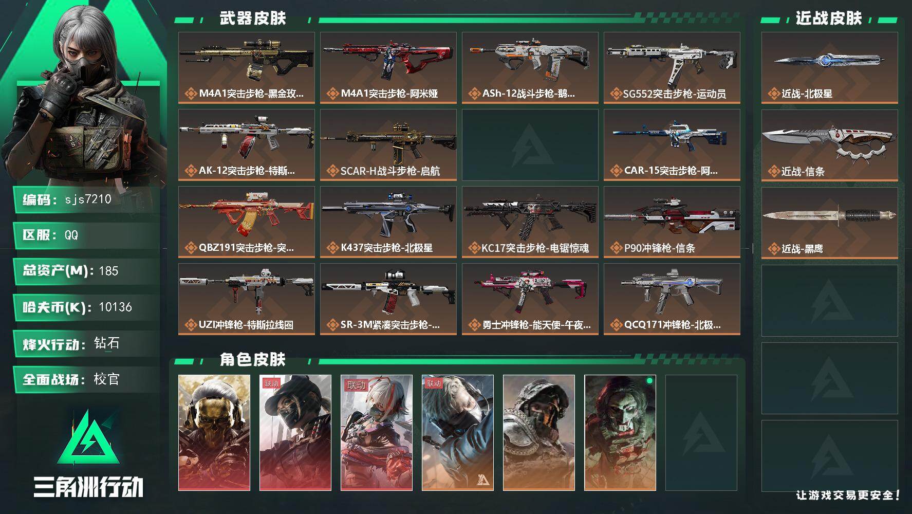 【sjs7210】可二次 180M资产 维什戴尔 蚀金玫瑰 天际线 信条 北极星 烽火地带段位: 钻石 全面战场段位: 校官 总资产: 185000000 哈夫币: 10136000 sjs7210 传说武器皮肤: M4A1突击步枪-蚀金玫瑰,近战-北极星,K437突击步枪-北极星,QCQ171冲锋枪-北极星,725双管霰弹枪-送葬人-无题密令,M4A1突击步枪-阿米娅,CAR-15突击步枪-阿米娅,复合弓-黑-天际线,AWM狙击步枪-捞点薯条,腾龙突击步枪-捞点薯条,93R-捞点薯条,AK-1