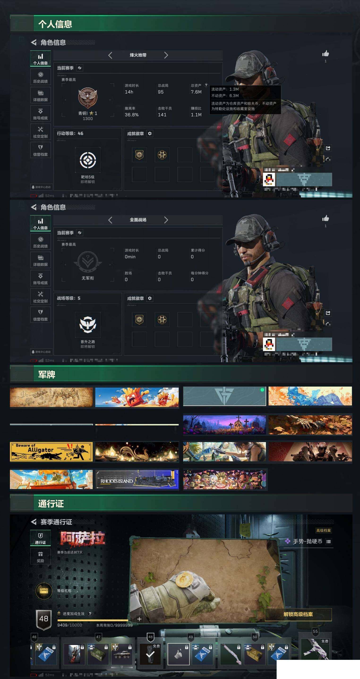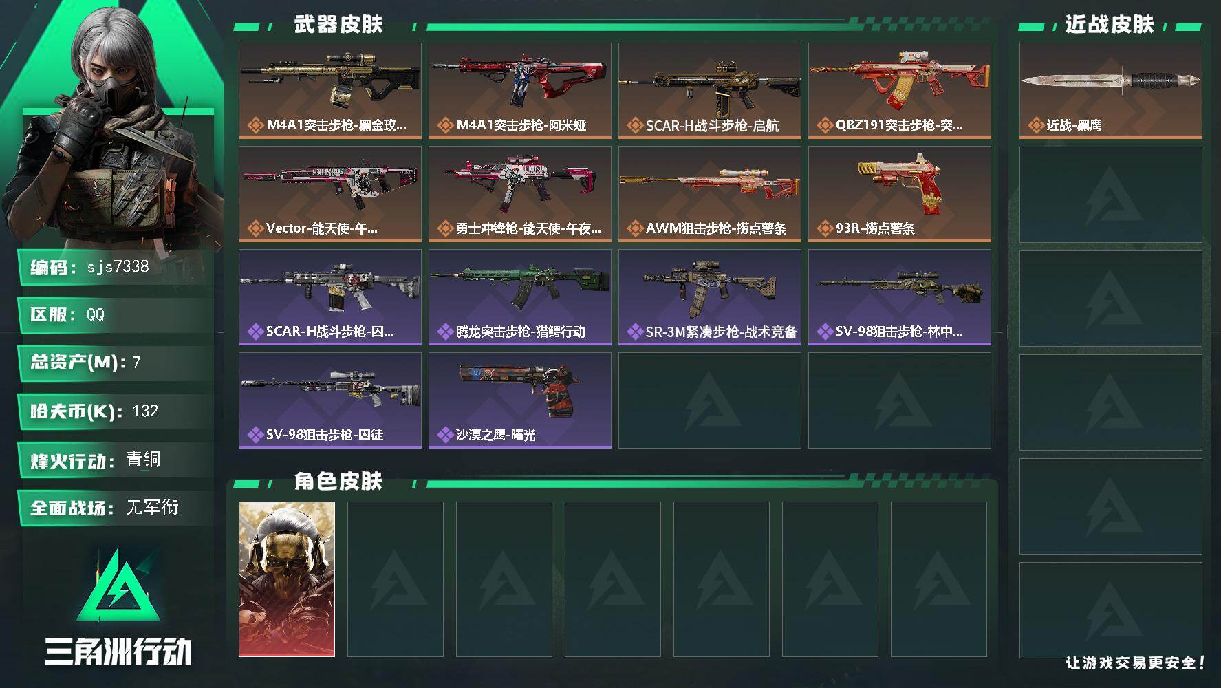 总资产7m 红狼 烽火地带段位: 青铜 全面战场段位: 无段位 总资产: 7000000 哈夫币: 132000