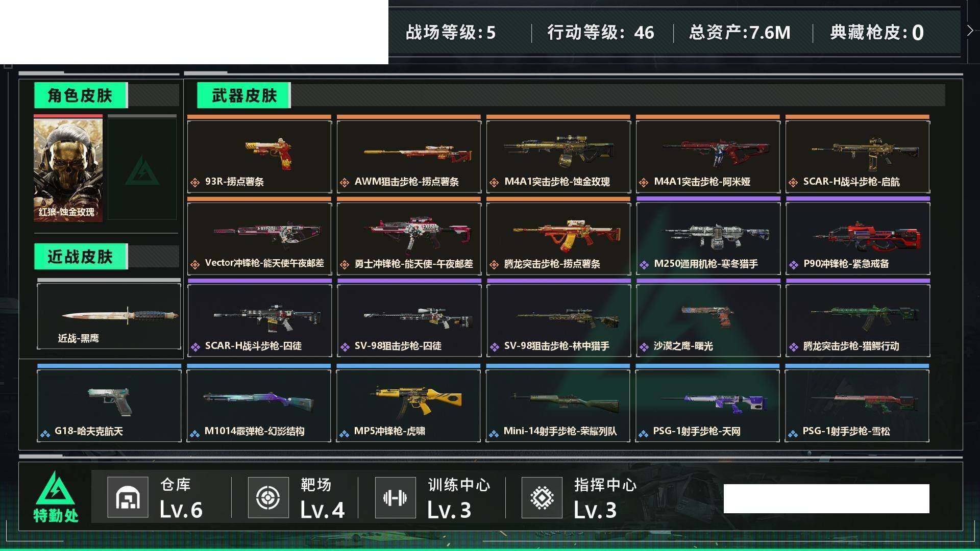 【sjs7338】总资产7m 红狼 烽火地带段位: 青铜 全面战场段位: 无段位 总资产: 7000000 哈夫币: 132000 sjs7338 干员外观: 红狼-蚀金玫瑰 传说武器皮肤: M4A1突击步枪-蚀金玫瑰,M4A1突击步枪-阿米娅,AWM狙击步枪-捞点薯条,腾龙突击步枪-捞点薯条,93R-捞点薯条,勇士冲锋枪-能天使-午夜邮差,Vector冲锋枪-能天使-午夜邮差,SCAR-H战斗步枪-启航 史诗武器皮肤: 沙漠之鹰-曙光,SV-98狙击步枪-林中猎手,SV-98狙击步枪-囚徒,S