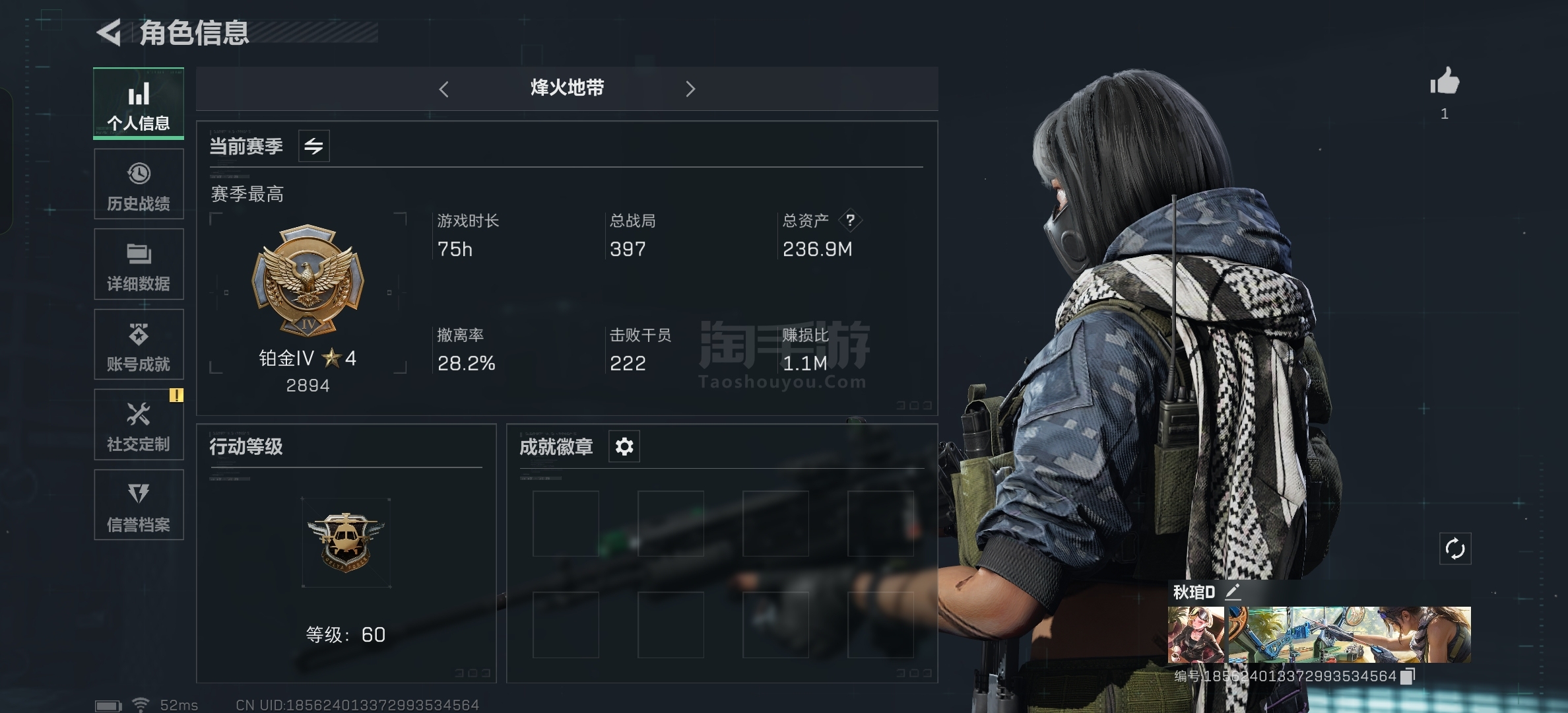 总资产 20m 红狼 怜悯 烽火地带段位: 三角洲巅峰 全面战场段位: 上等兵 总资产: 24000000 哈夫币: 701000
