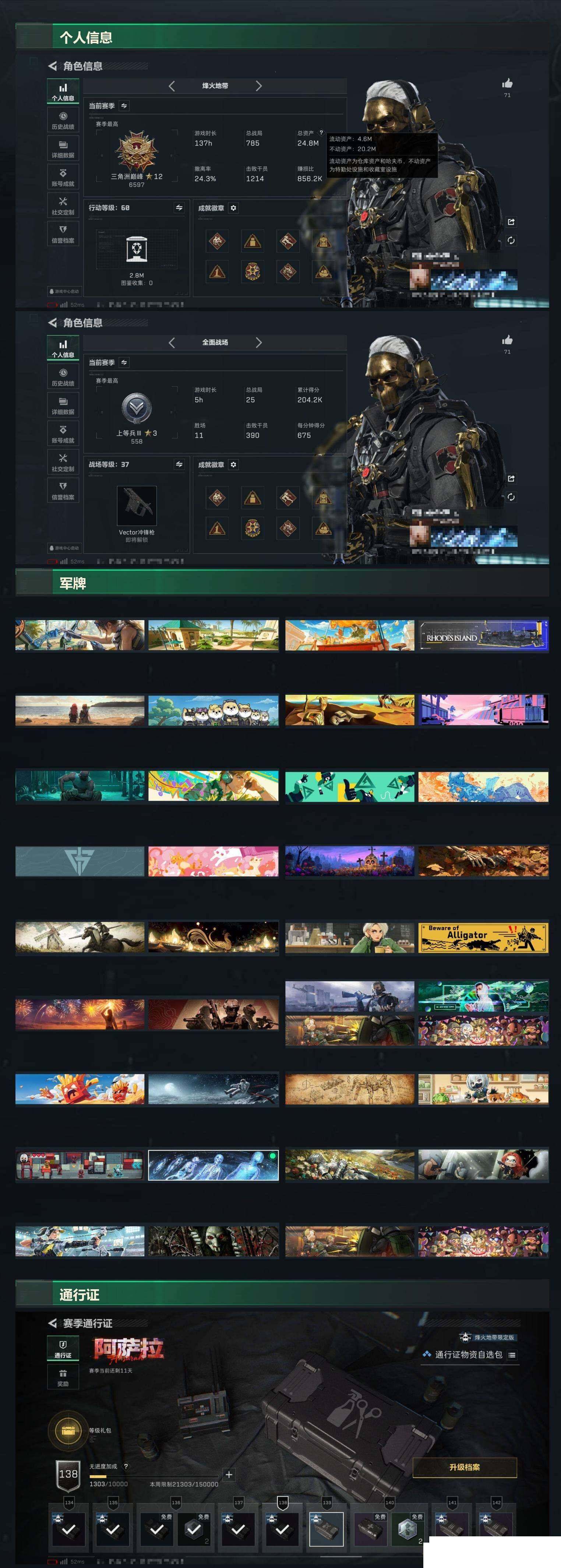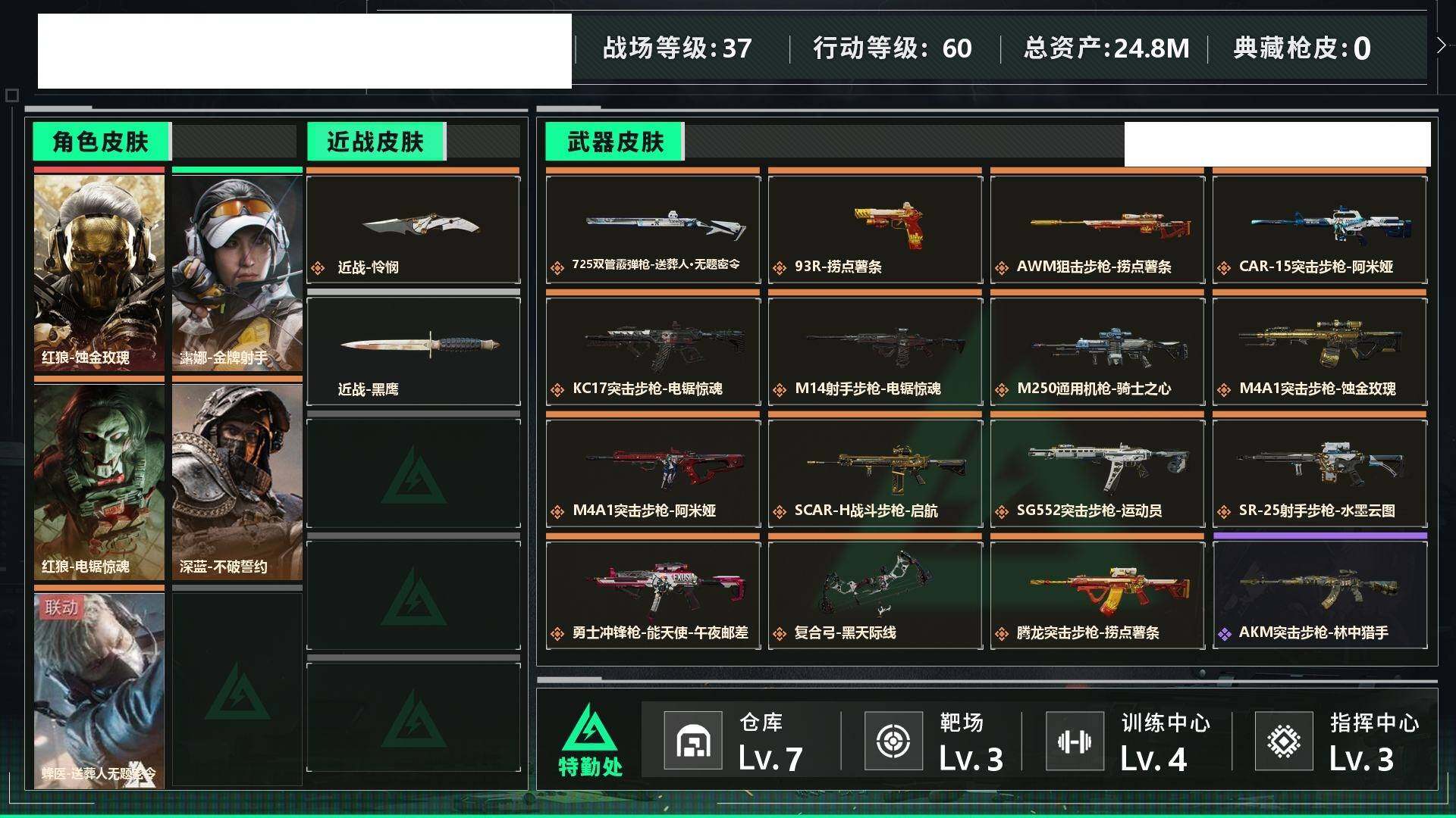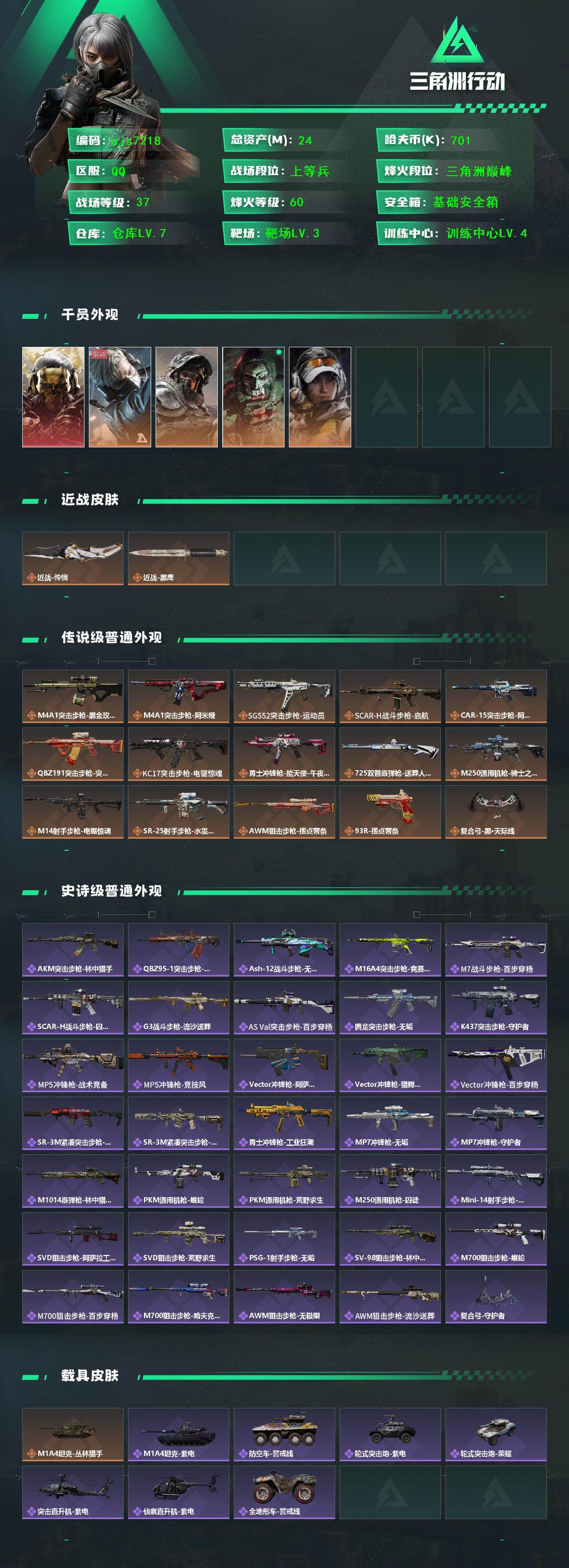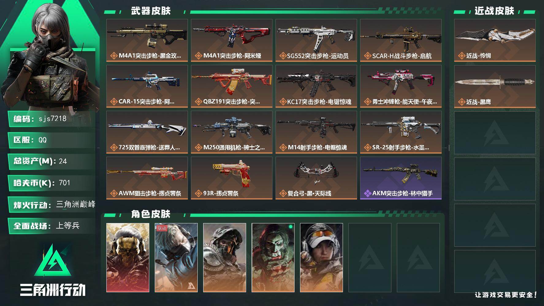【sjs7218】总资产 20m 红狼 怜悯 烽火地带段位: 三角洲巅峰 全面战场段位: 上等兵 总资产: 24000000 哈夫币: 701000 sjs7218 传说武器皮肤: M4A1突击步枪-蚀金玫瑰,近战-怜悯,SR-25射手步枪-水墨云图,725双管霰弹枪-送葬人-无题密令,M4A1突击步枪-阿米娅,CAR-15突击步枪-阿米娅,复合弓-黑-天际线,AWM狙击步枪-捞点薯条,腾龙突击步枪-捞点薯条,93R-捞点薯条,勇士冲锋枪-能天使-午夜邮差,M250通用机枪-骑士之心,M14射