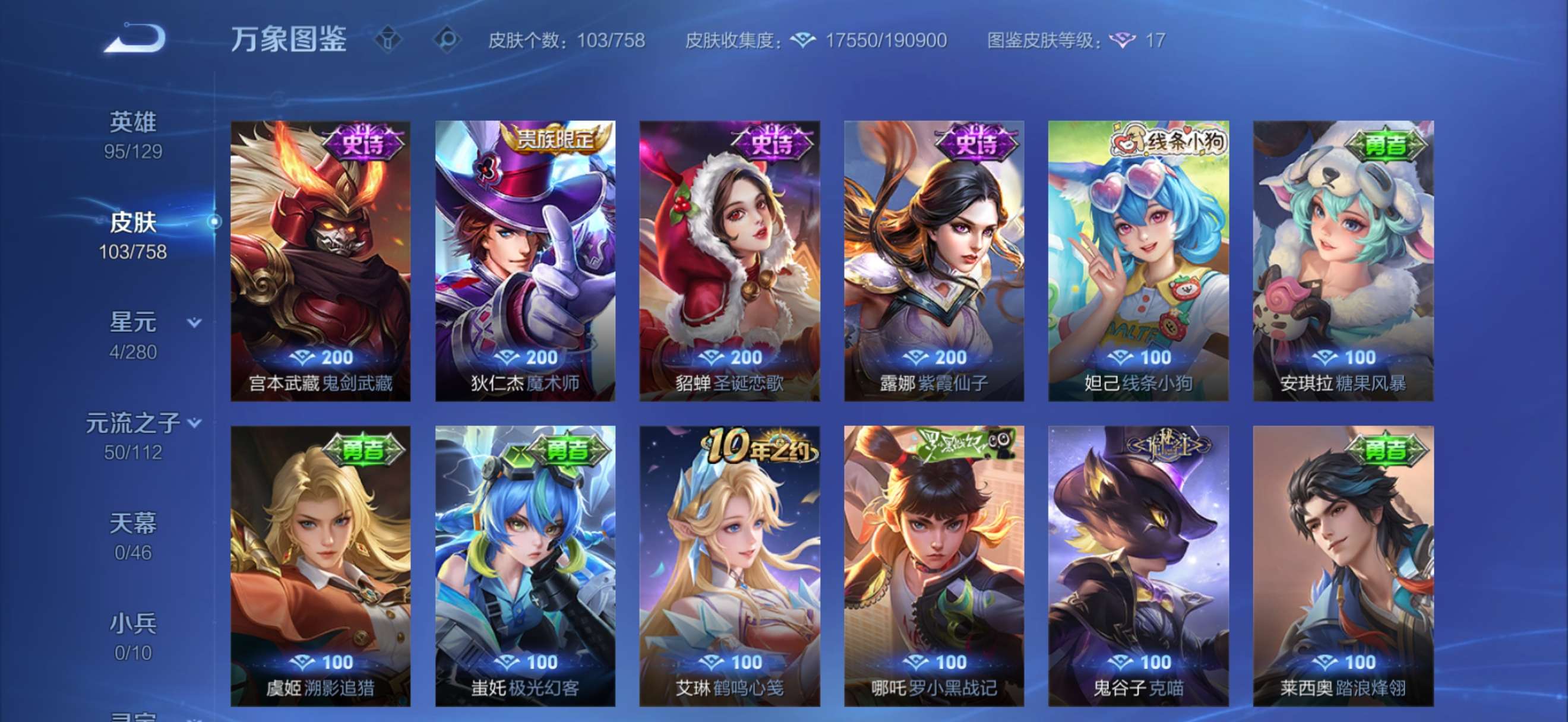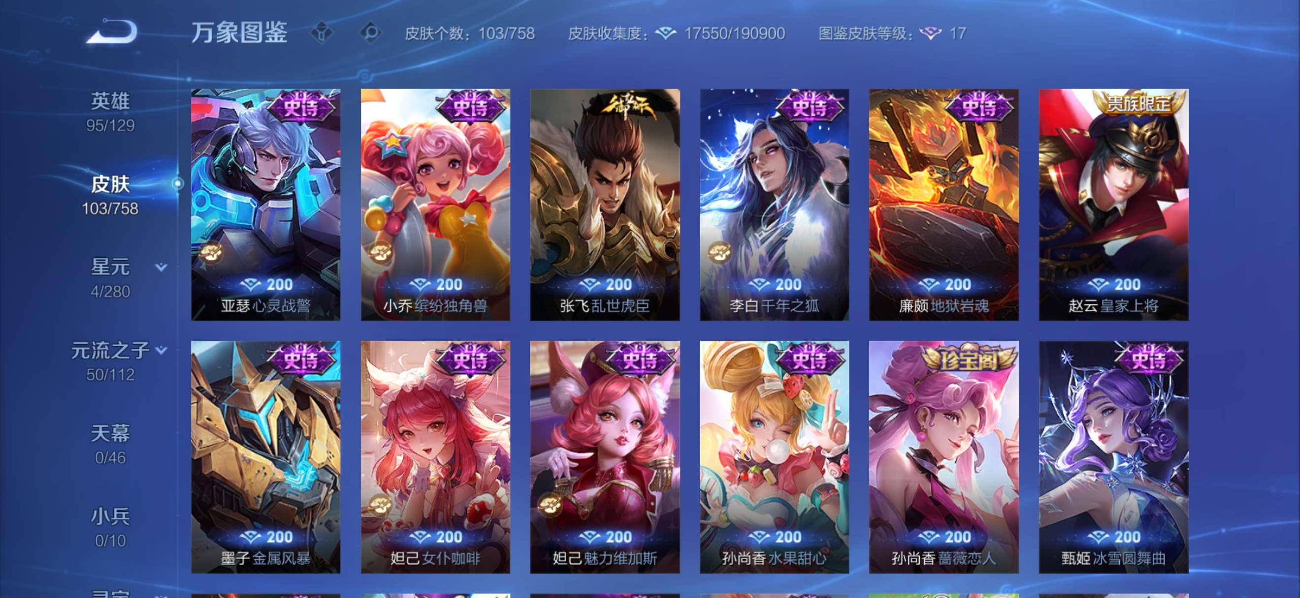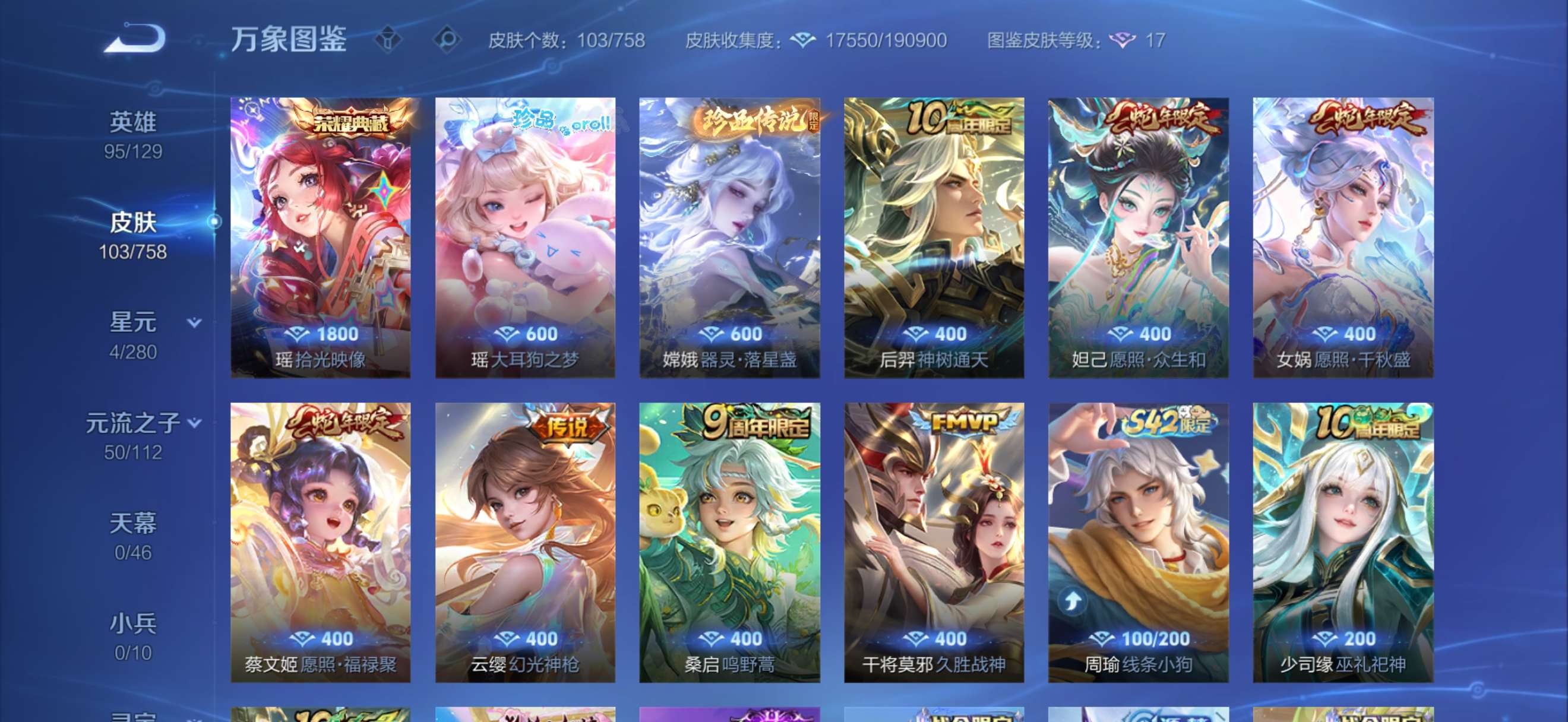 7个传说皮肤,2个珍品传说(瑶-大耳狗之梦,嫦娥-器灵落星盏),1个荣耀典藏(瑶拾光映像)