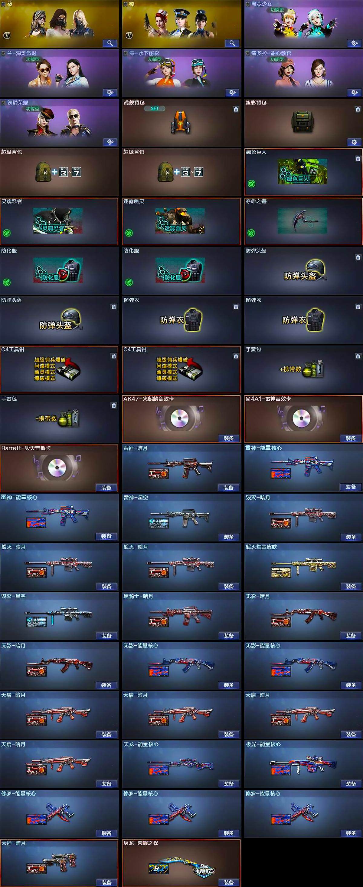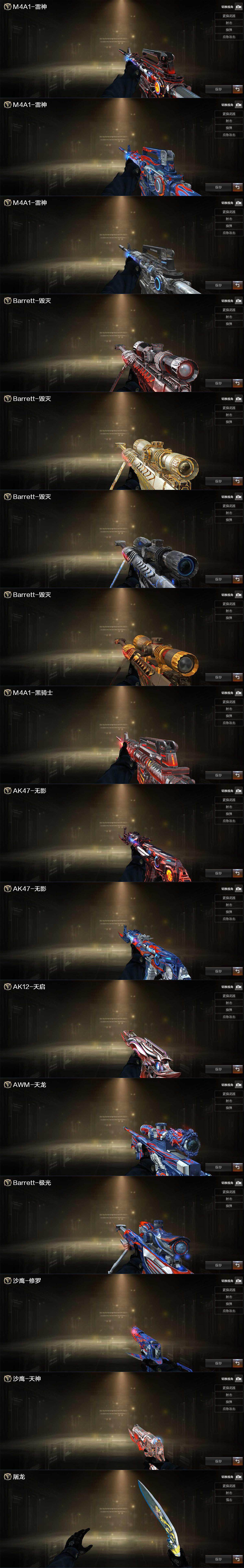 【热门武器】:QBZ03-金色蔷薇,死亡之眼,M4A1-黑骑士,汤姆逊-烈龙*8,RPK-盘龙*4,加特林-炼狱*6,沙鹰-修罗*3