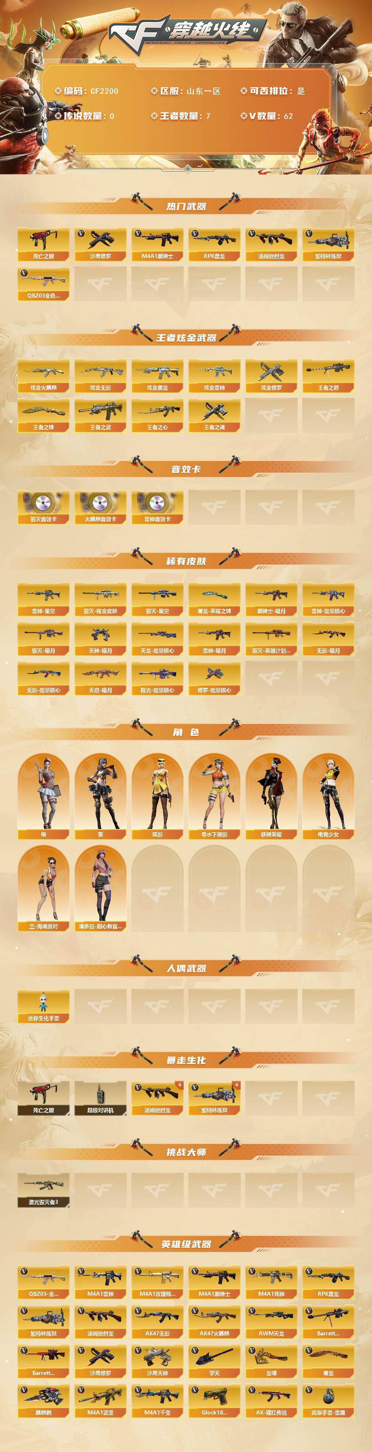 【双全号/QBZ03-金色蔷薇,死亡之眼,M4A1-黑骑士,汤姆逊-烈龙*8,RPK-盘龙*4,加特林-炼狱*6,沙鹰-修罗*3】山东一区-62V-7王者-5炫金