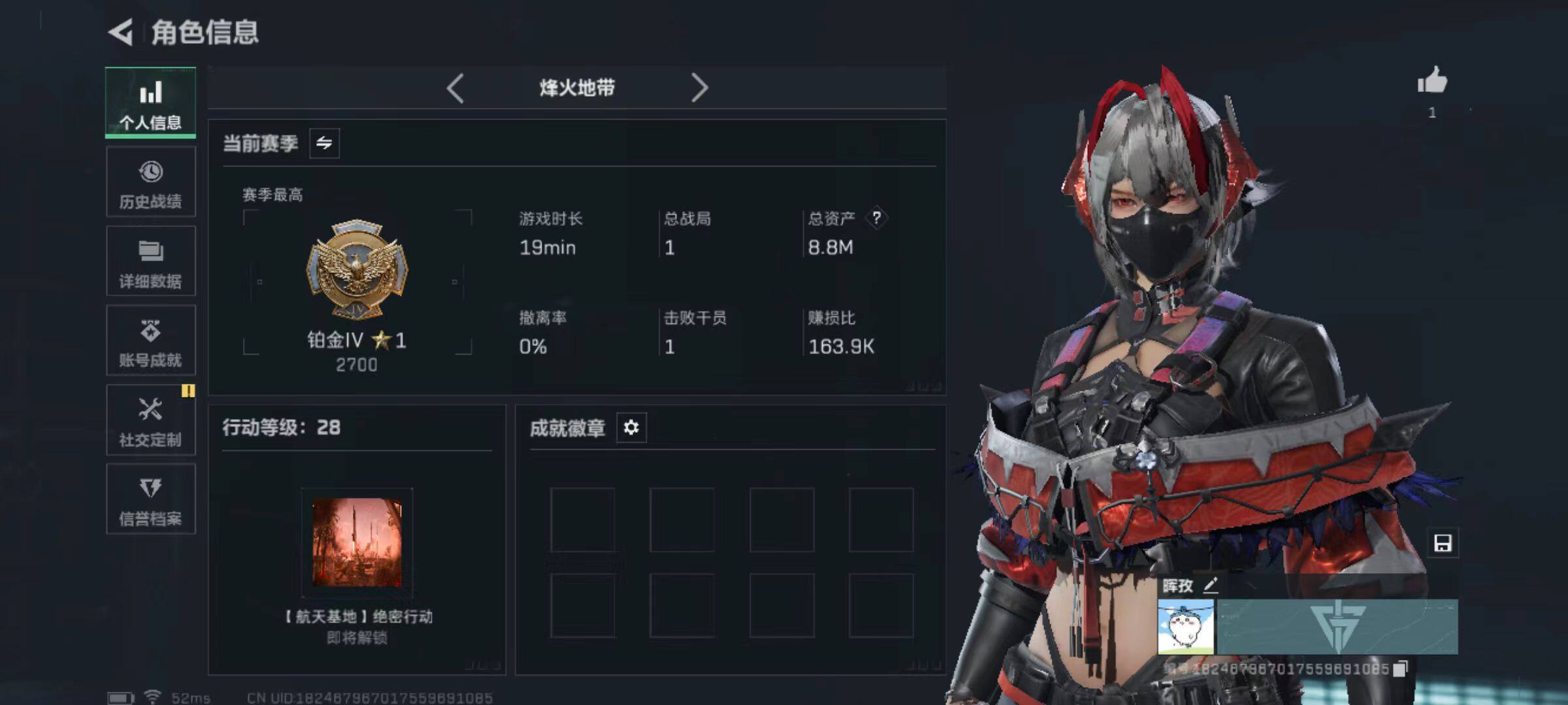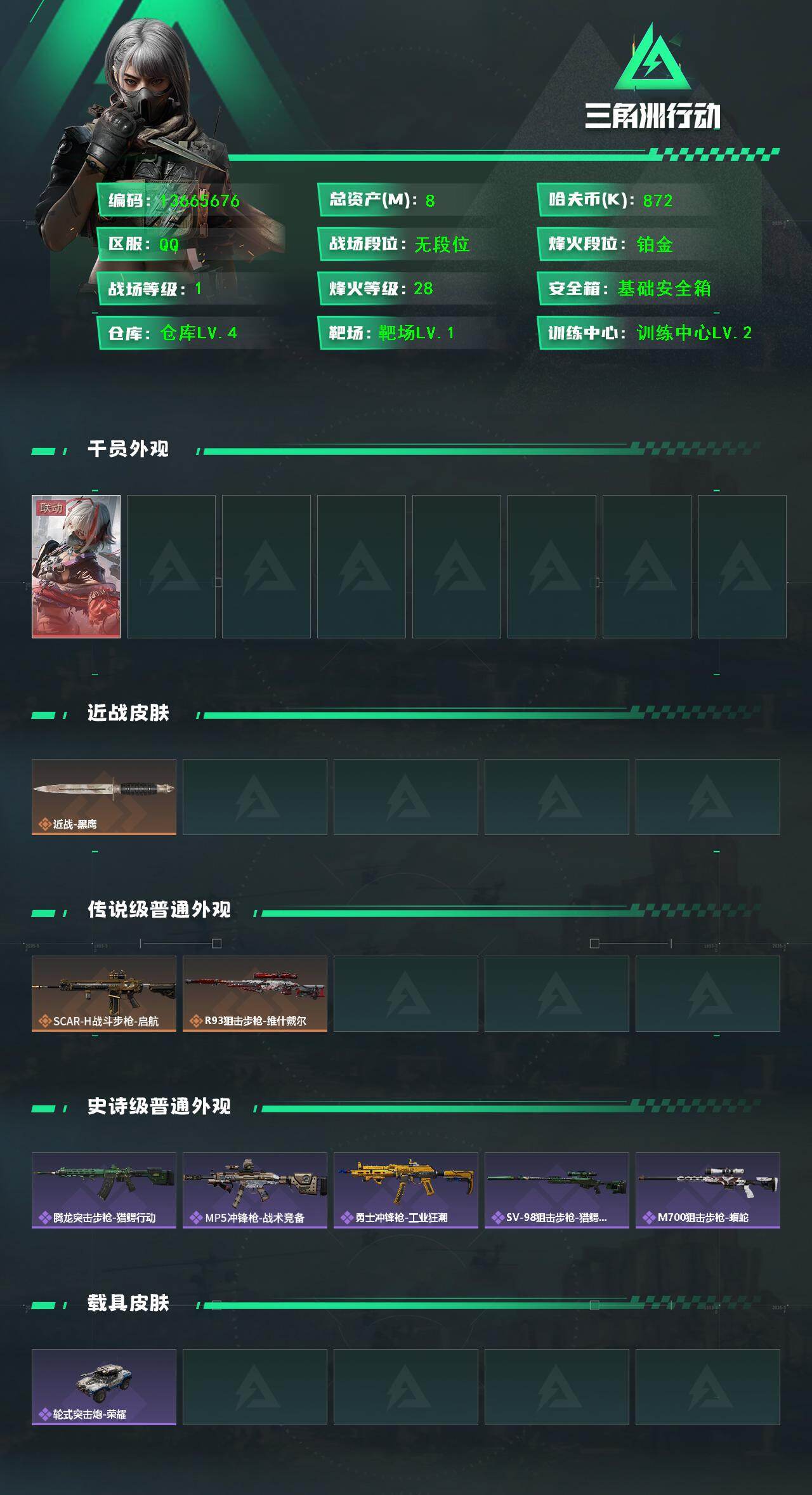 总资产(M):8M/哈夫币(K):872K/哈夫币(K):872K/传说枪皮数:2/全面战场等级:1_段位:无段位/烽火地带等级:28_段位:铂金/骇爪-维什戴尔/近战-黑鹰/SCAR-H战斗步枪-启航/R93狙击步枪-维什戴尔/腾龙突击步枪-猎鳄行动/MP5冲锋枪-战术竞备/勇士冲锋枪-工业狂潮/SV-98狙击步枪-猎鳄行动/M700狙击步枪-蝮蛇/AS Val突击步枪-地平线/M4A1突击步