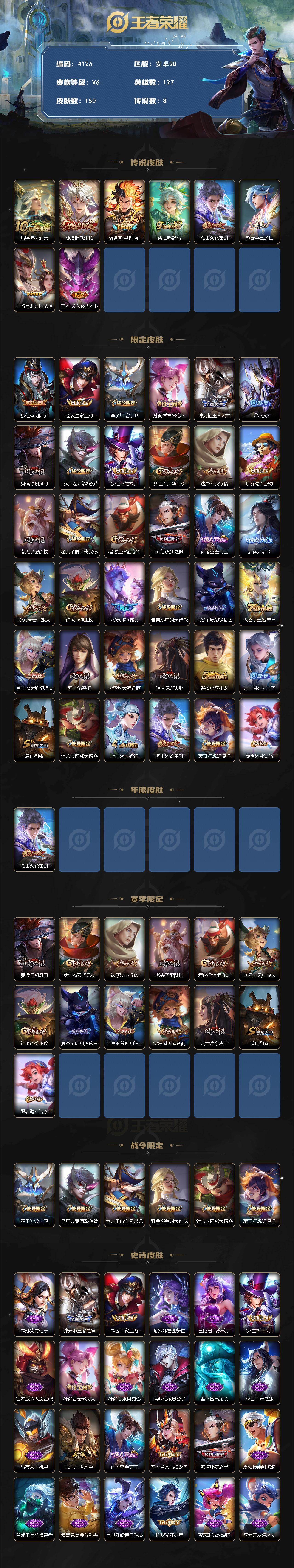 安卓Q-V6-永恒钻石I段位-127英雄-150皮肤-8传说-50史诗【英雄