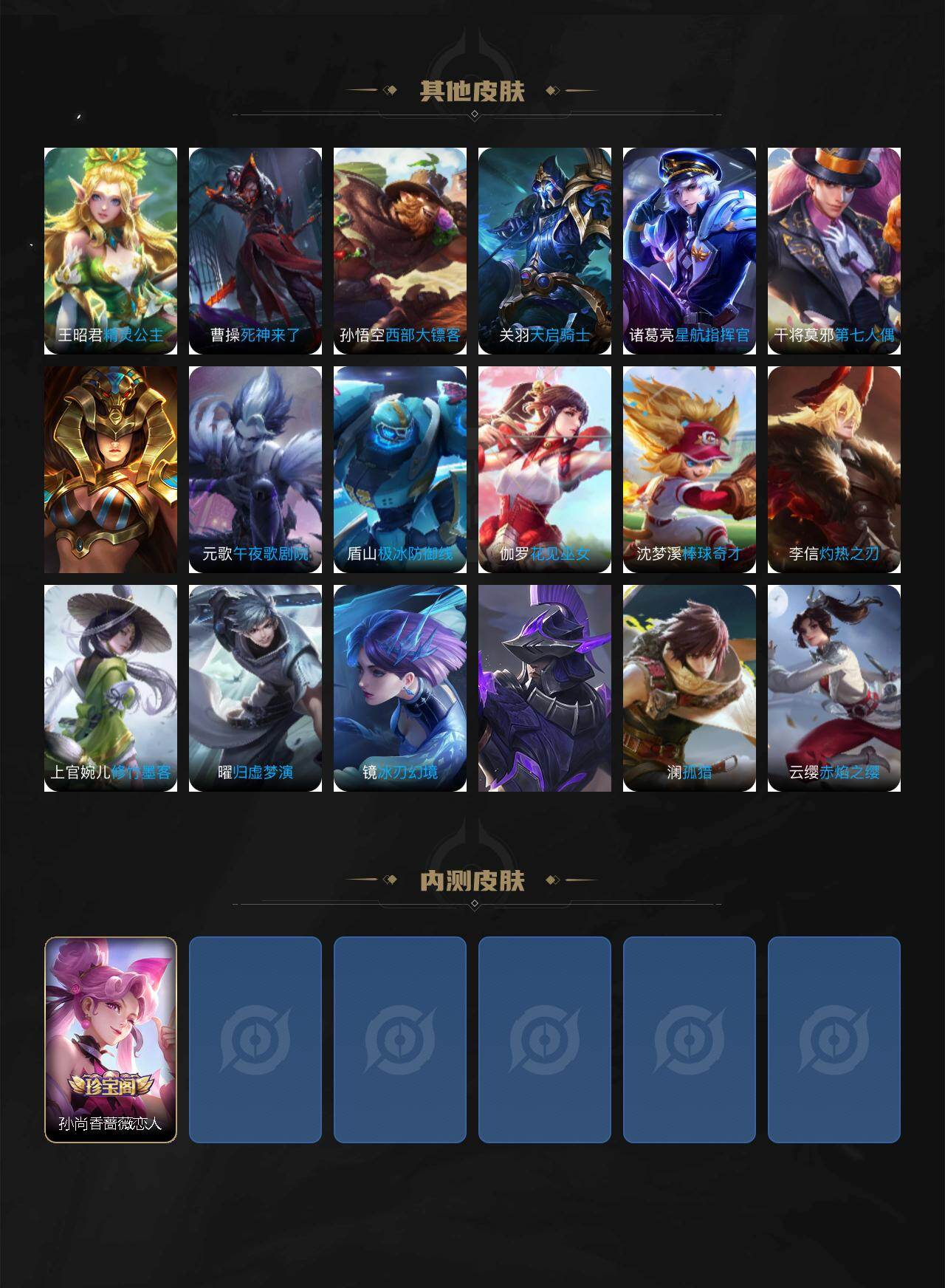 【传说皮肤】:后羿神树通天,澜愿照九州拓,裴擒虎祥瑞亨通,桑启鸣野蒿,曜山海苍雷引,赵云淬星耀世,干将莫邪久胜战神,宫本武藏地狱之眼