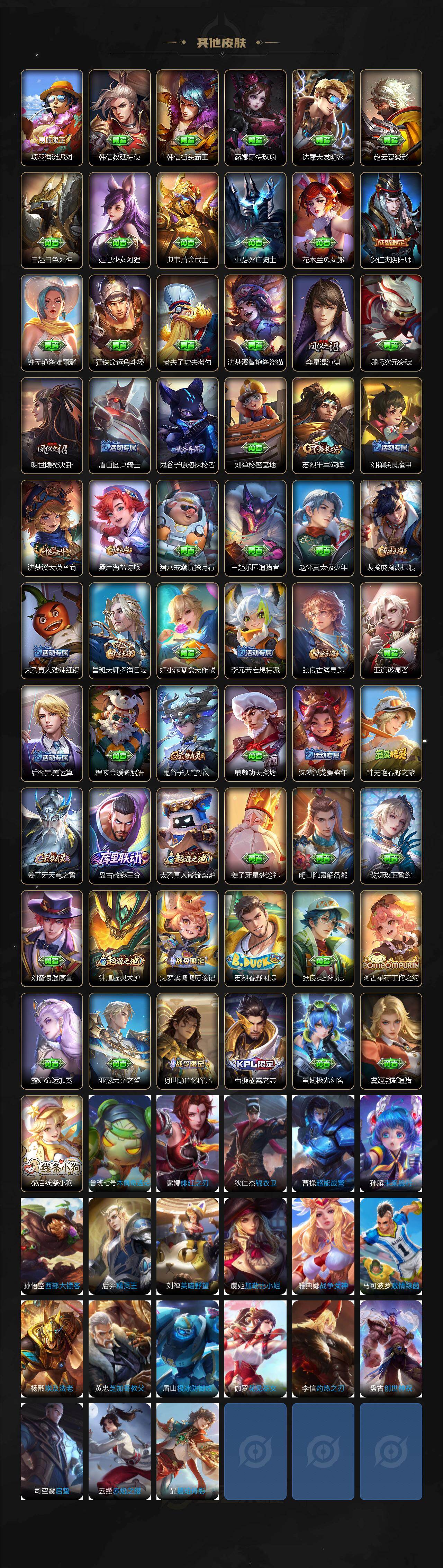 【限定皮肤】:姜子牙天穹之誓,狄仁杰阴阳师,赵云皇家上将,庄周高山流水,狄仁杰魔术师,项羽海滩派对,鬼谷子原初探秘者,鬼谷子五谷丰年,苏烈千军破阵,弈星混沌棋,沈梦溪大漠名商,明世隐疑决卦,裴擒虎李
