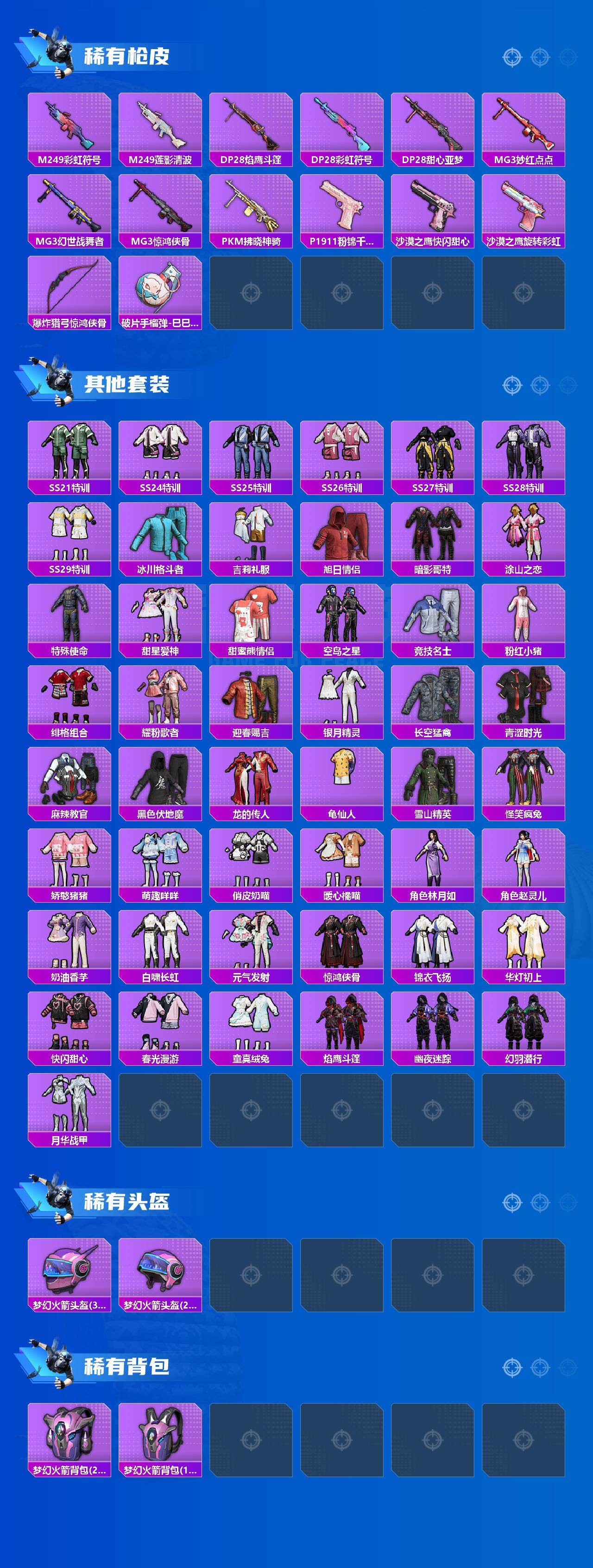 【HPN1644】72套装/枪械6/装备138/载具1/战备78/王牌印记1/热力值37587/五级AKM-绿萝繁花/五级SCAR-L-锦绣绵绵/七级M416-心之恋语/四级Kar98K-巳巳如意/四级M249-彩虹甜喵/五级DP-28-豹影疾电/粉装-梦幻火箭/套装-龟仙人/套装-暗影哥特/套装-粉红小猪/梦幻火箭/彩虹甜喵/暗夜鎏金/第五大道/拂晓神骑/辉耀战甲/迈凯伦570S(天际蓝)/AKM-绿萝繁华/SCAR-L-锦绣绵绵/M416-心之恋语/Kar98K-巳巳如意/M249-彩虹甜喵