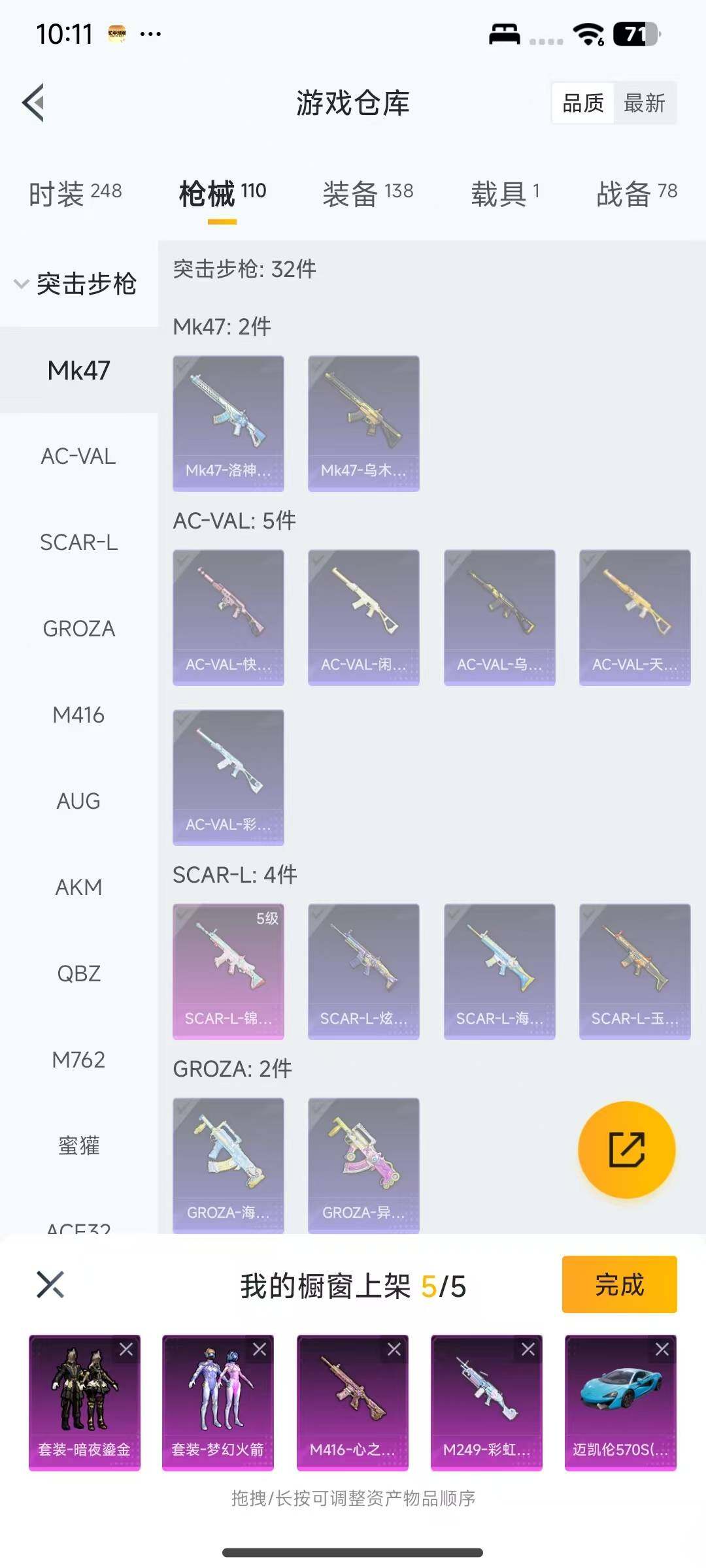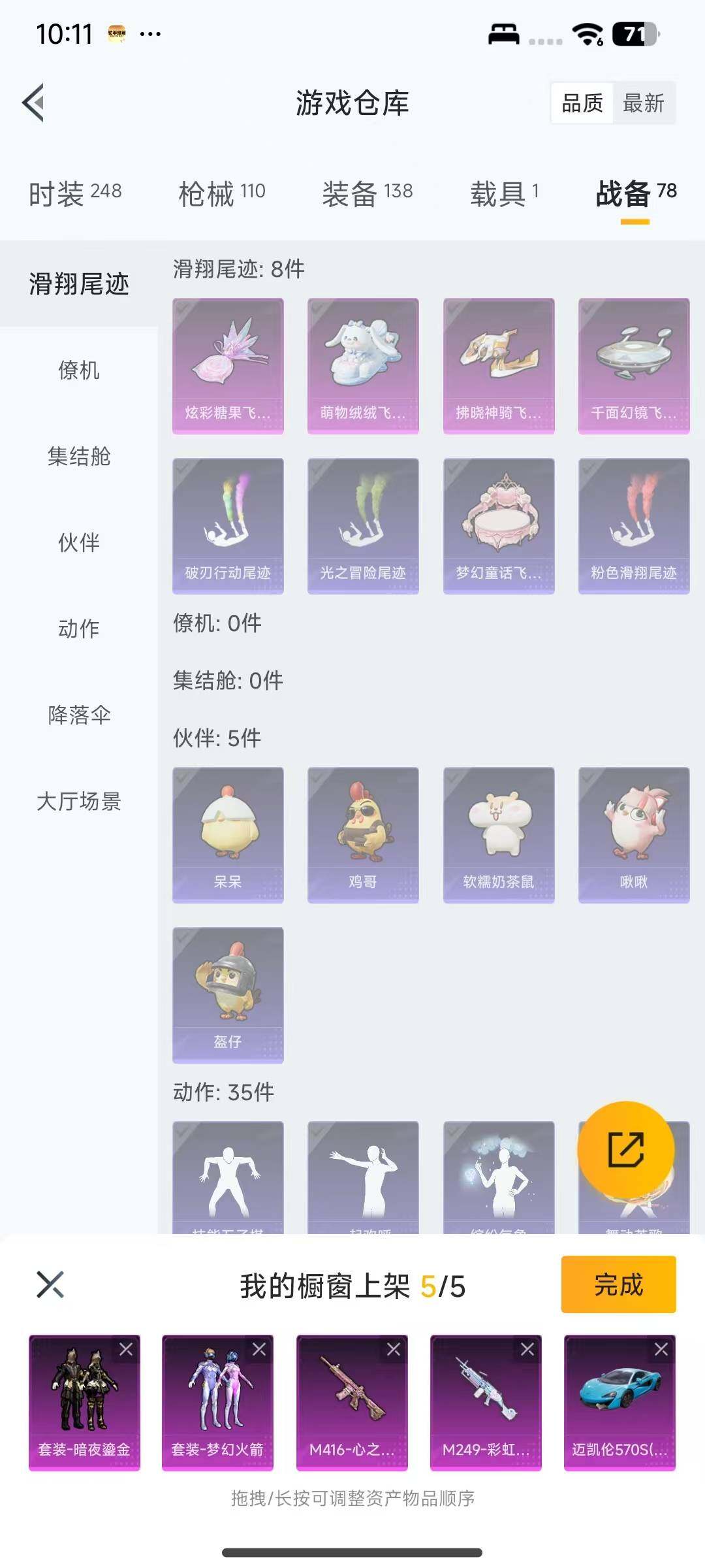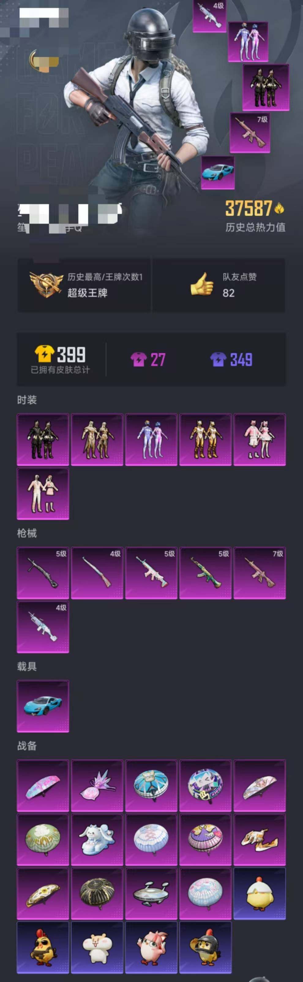 72套装/枪械6/装备138/载具1/战备78/王牌印记1/热力值37587/