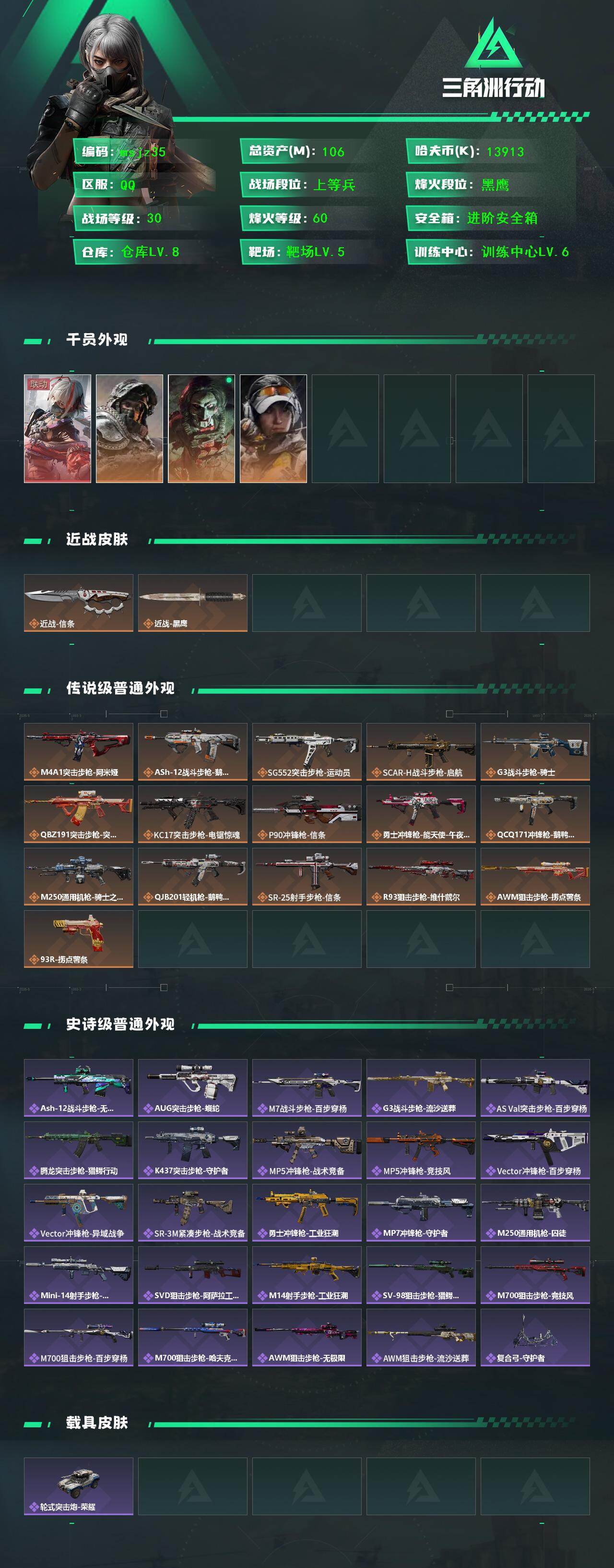 106m总资产-13913k哈伏币-60烽火等级-黑鹰-30战场等级-上等兵
