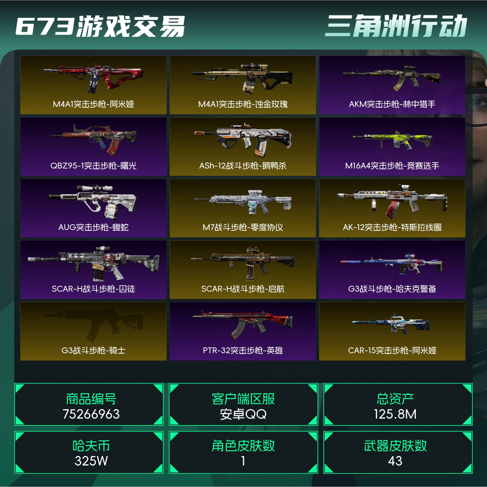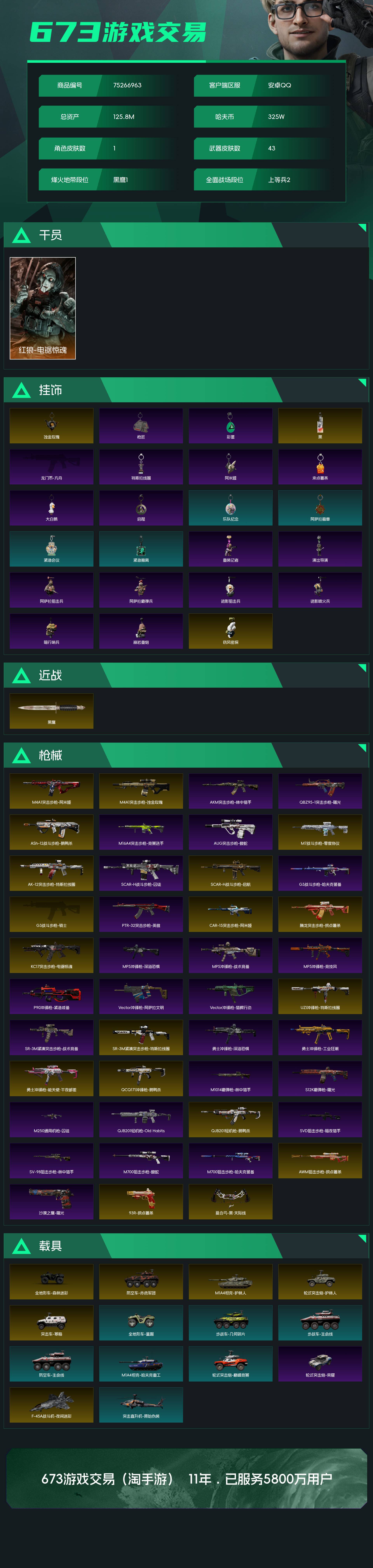 烽火段位黑鹰1 战场段位上等兵2 总资产125.8M 哈夫币325W 干员1 挂饰23 近战1 枪械43 载具14