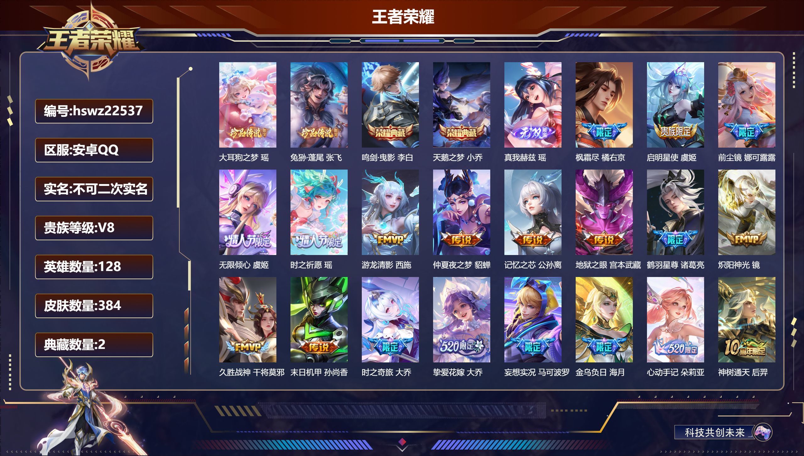 安卓QQ/永恒钻石/384皮肤/128英雄/2典藏/0珍品无双/1无双/2珍品传说/22传说/111