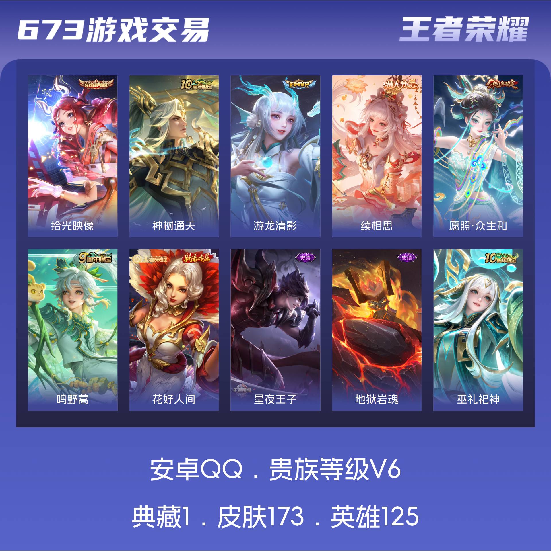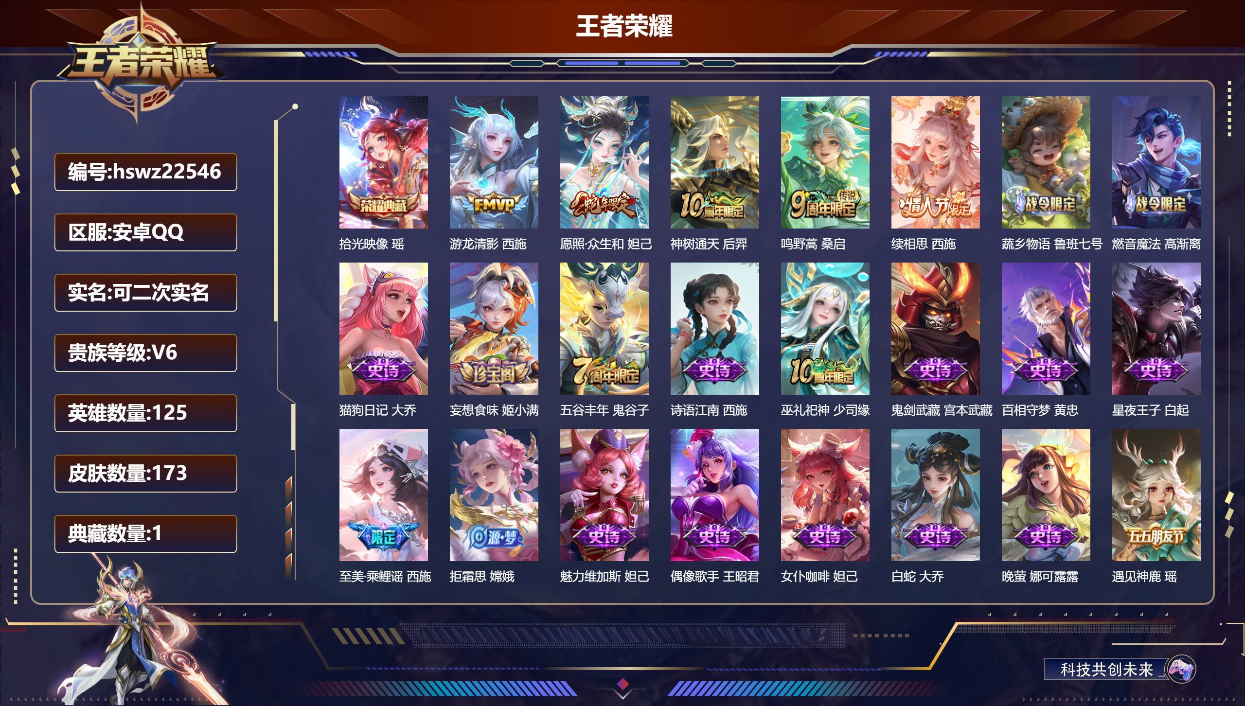 安卓QQ/尊贵铂金/173皮肤/125英雄/1典藏/0珍品无双/0无双/0珍品传说/5传说/55史诗