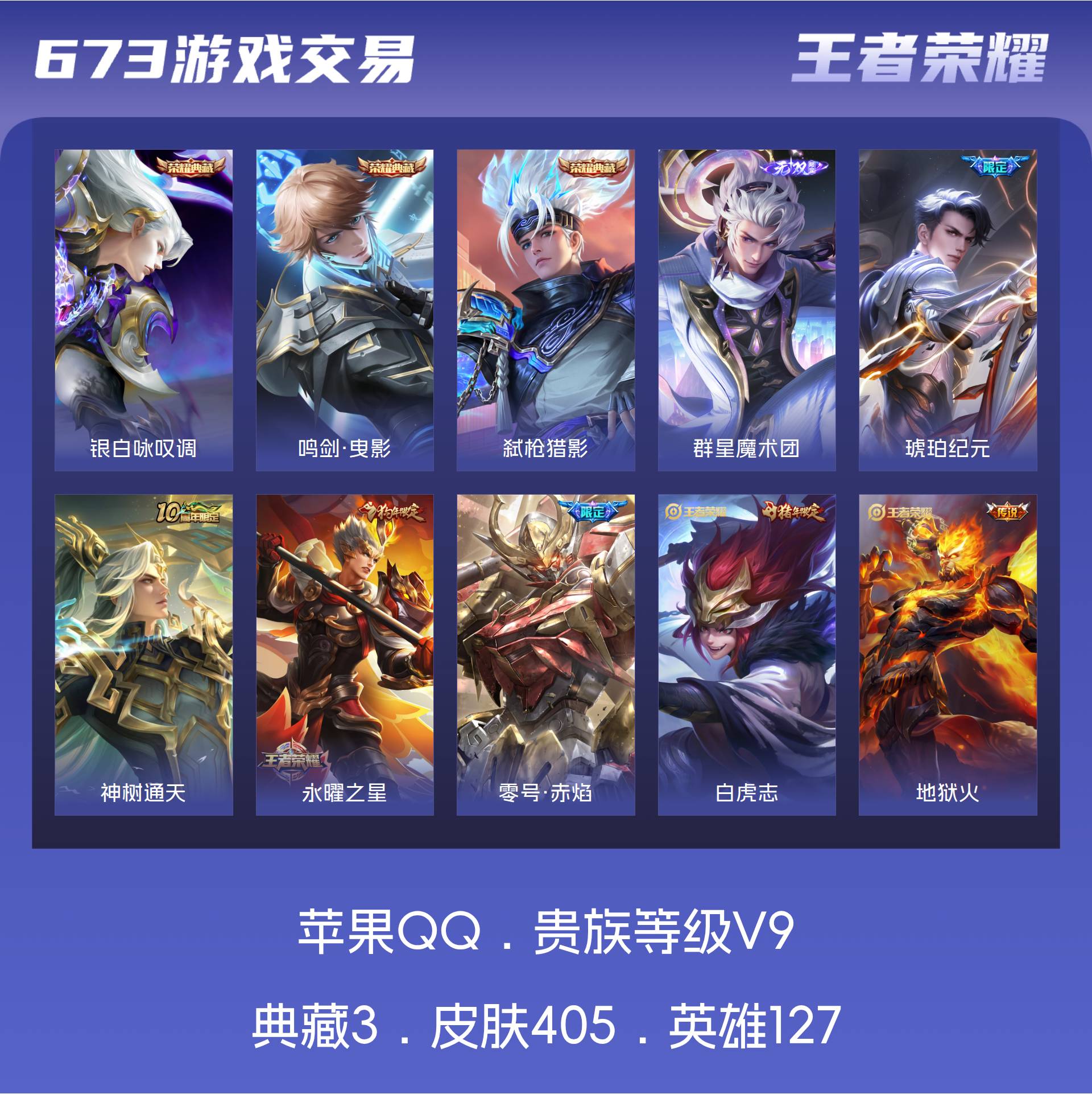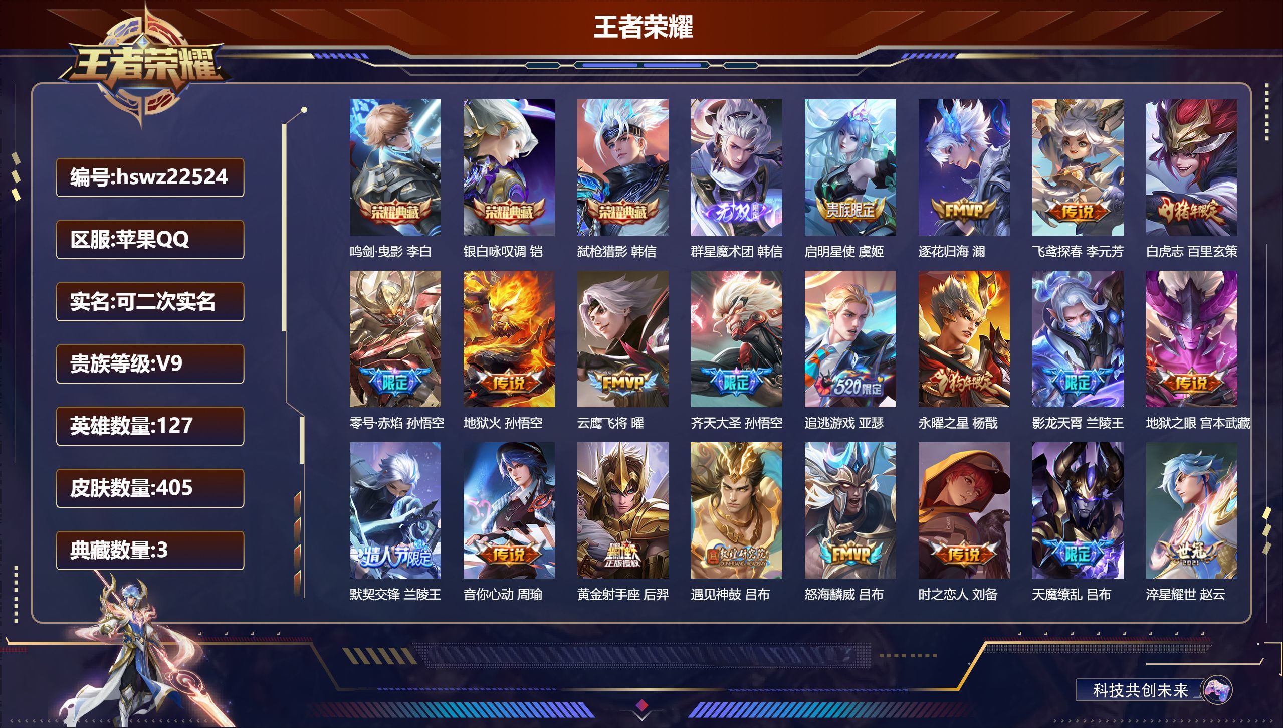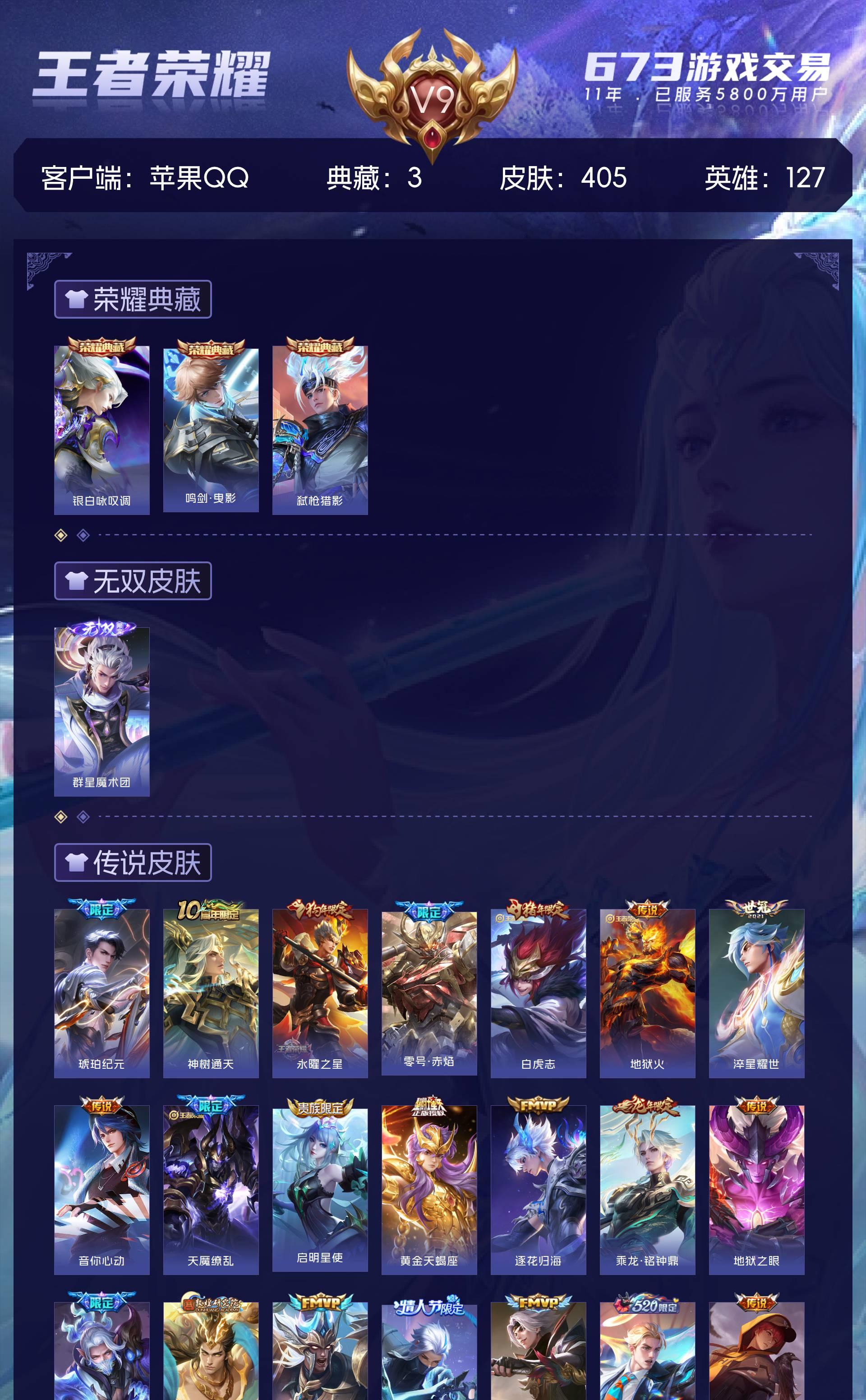 苹果QQ/绝世王者/405皮肤/127英雄/3典藏/0珍品无双/1无双/0珍品传说/28传说/125