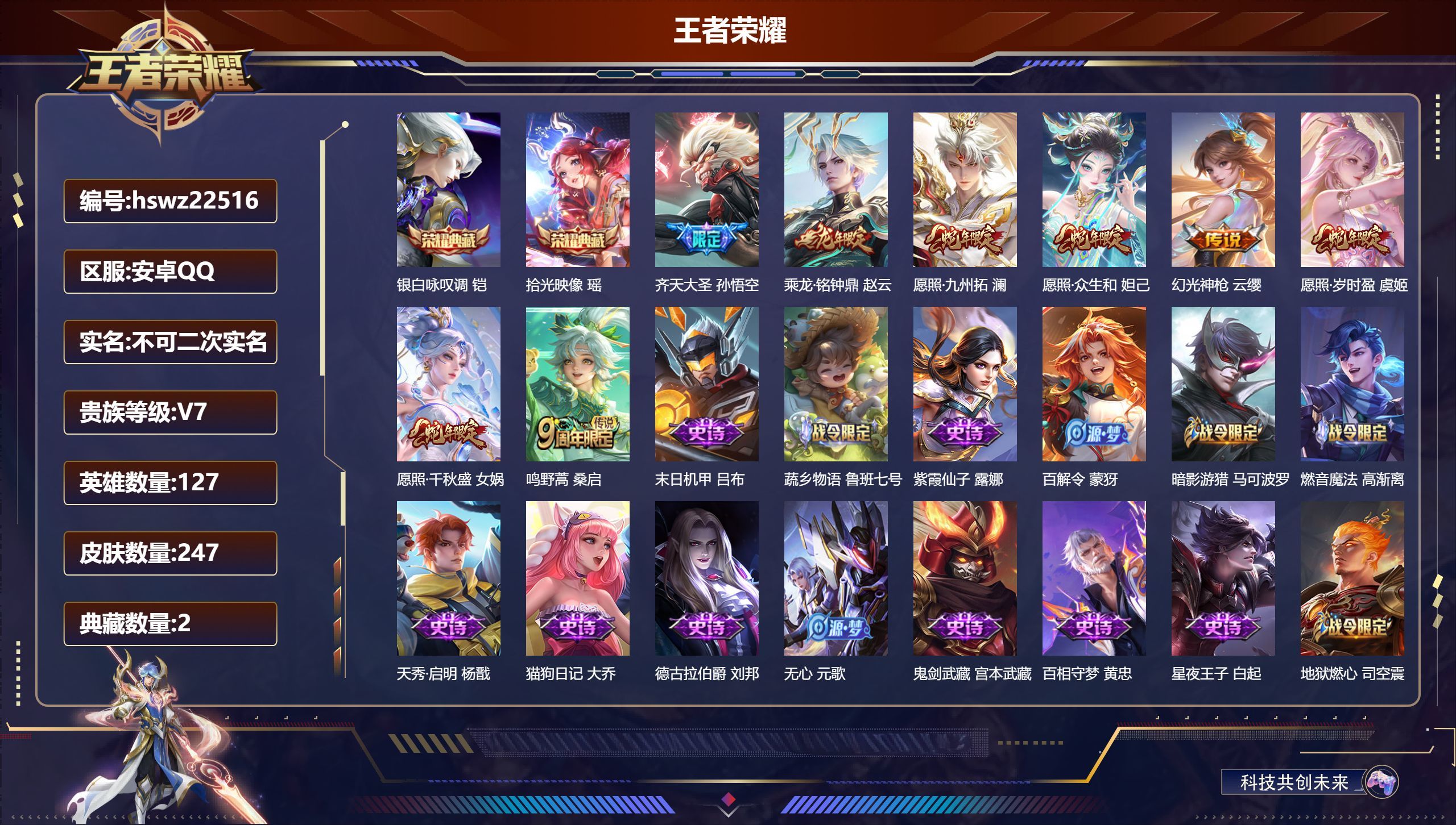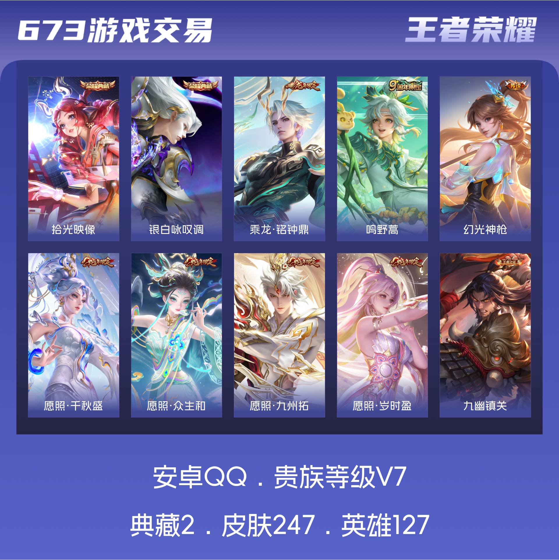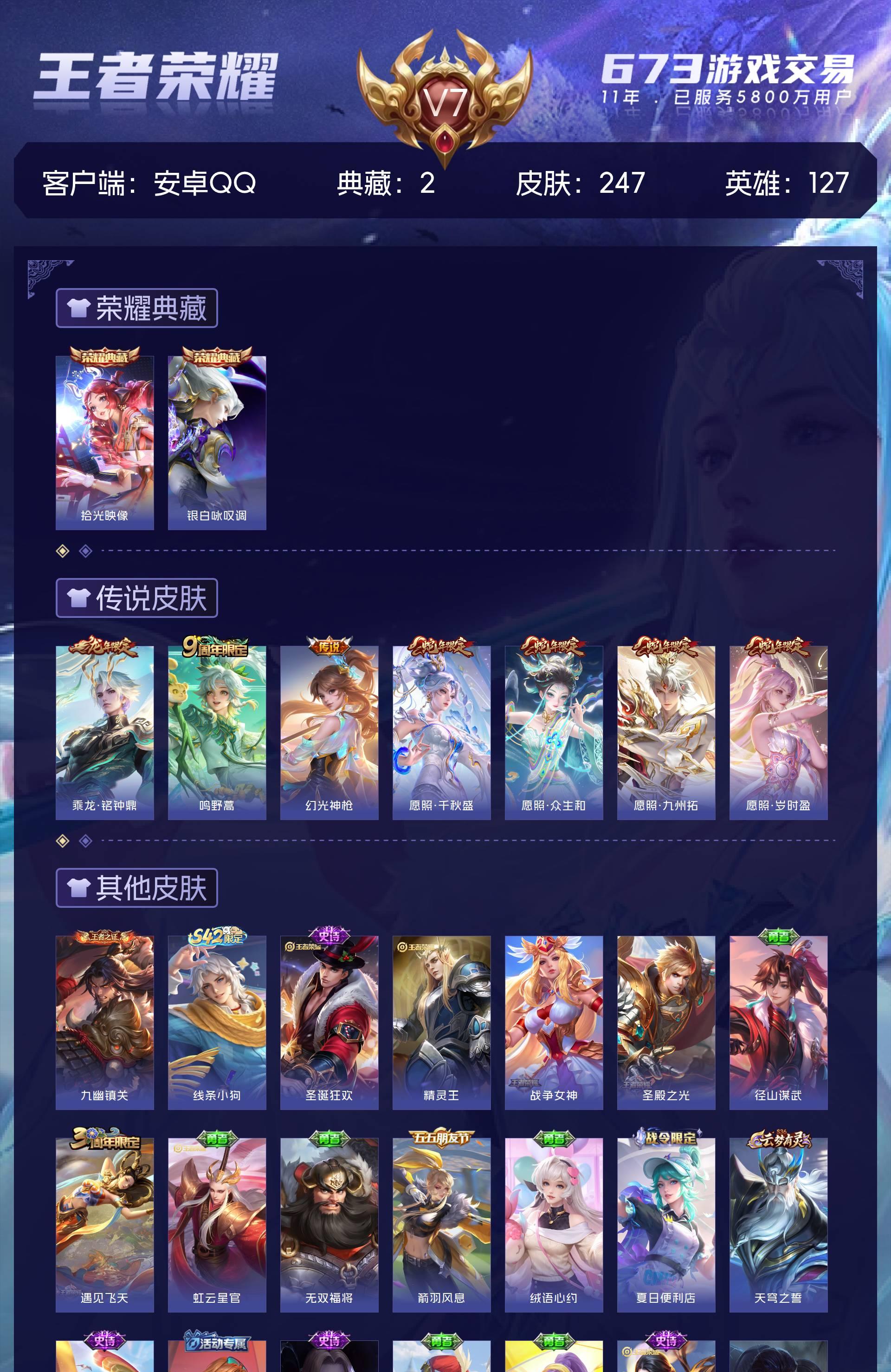 安卓QQ/永恒钻石/247皮肤/127英雄/2典藏/0珍品无双/0无双/0珍品传说/8传说/74史诗