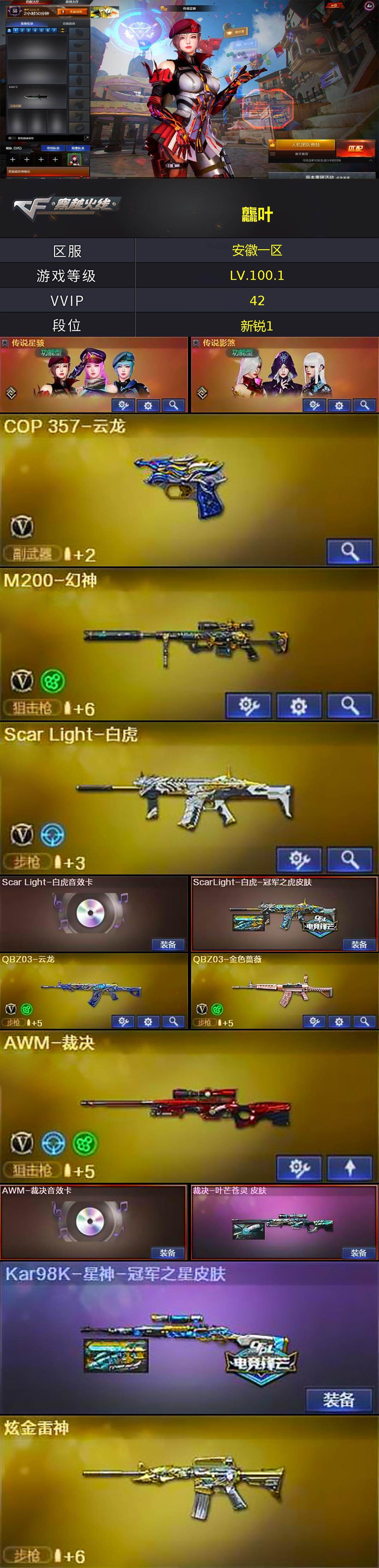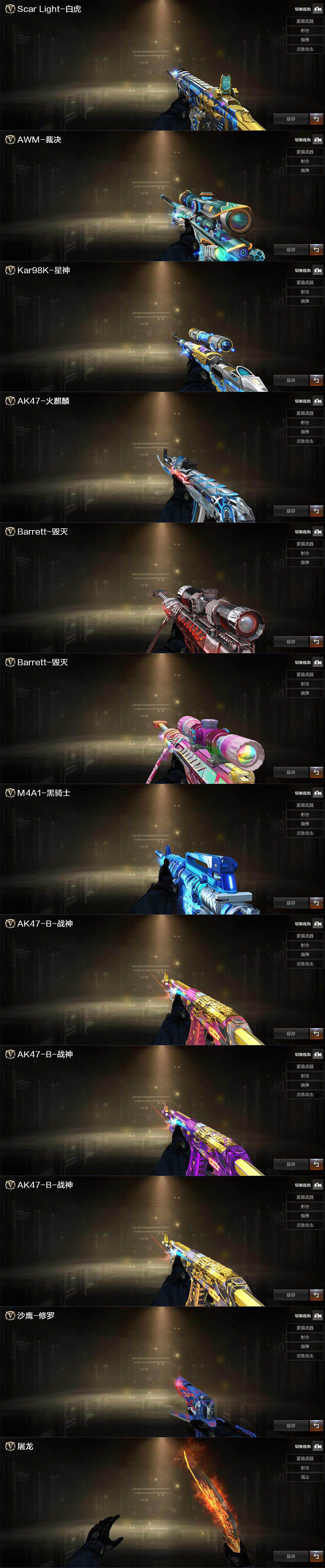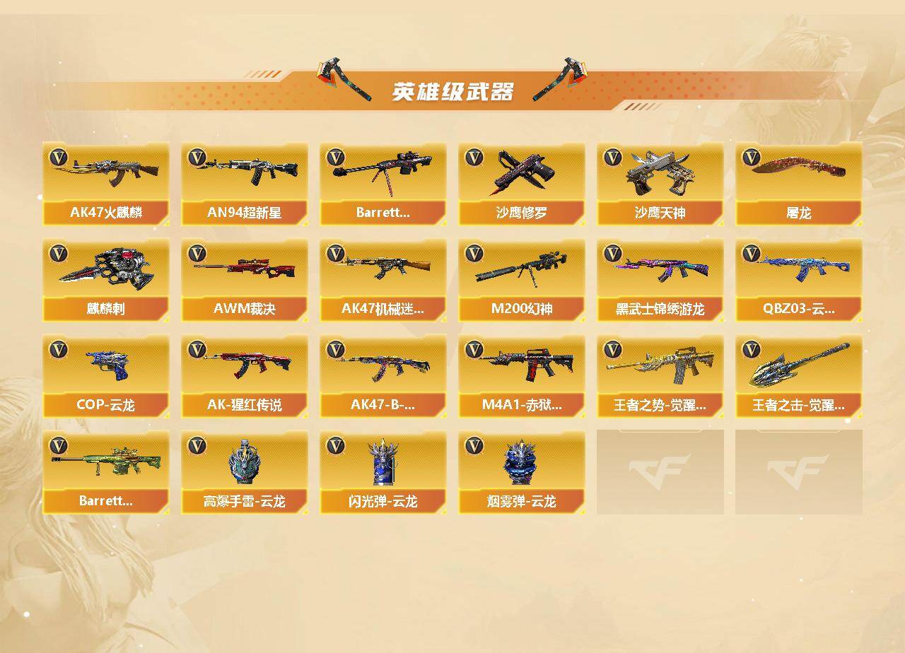 【热门武器】:QBZ03-金色蔷薇,Scar Light-白虎,HK417-朱雀,M200-幻神,死亡之眼,金色小号,Cat-刀锋,牛牛-AK47,M4A1-黑骑士,加特林-炼狱,MK5-炽火炎龙,火麒麟-绝迹,沙鹰-修罗*2