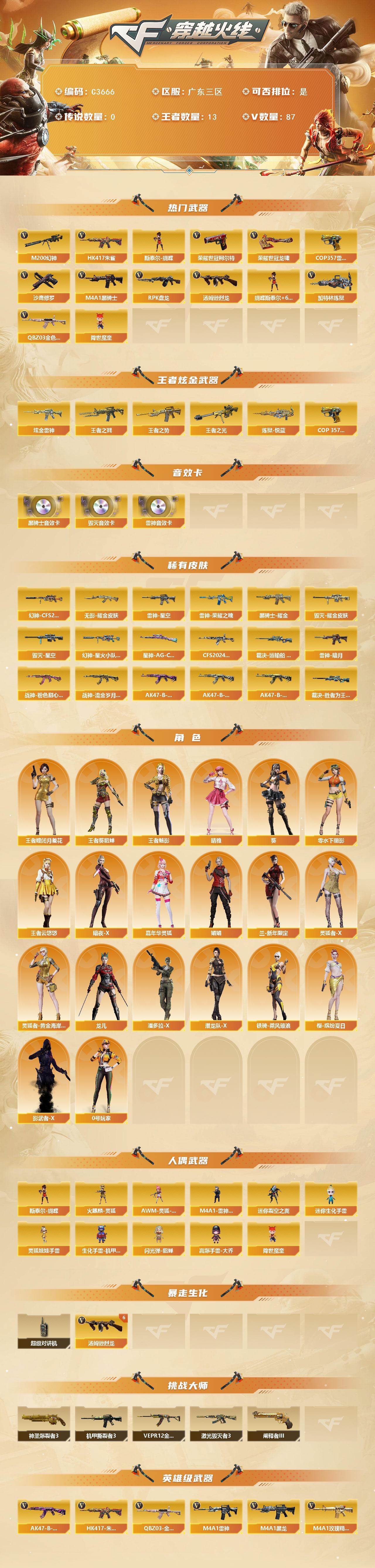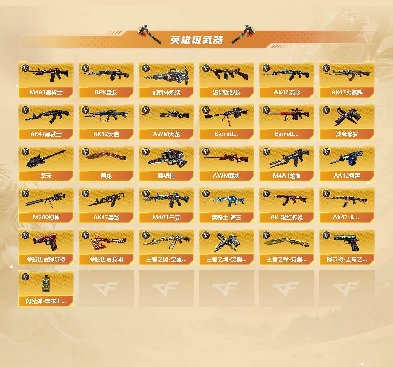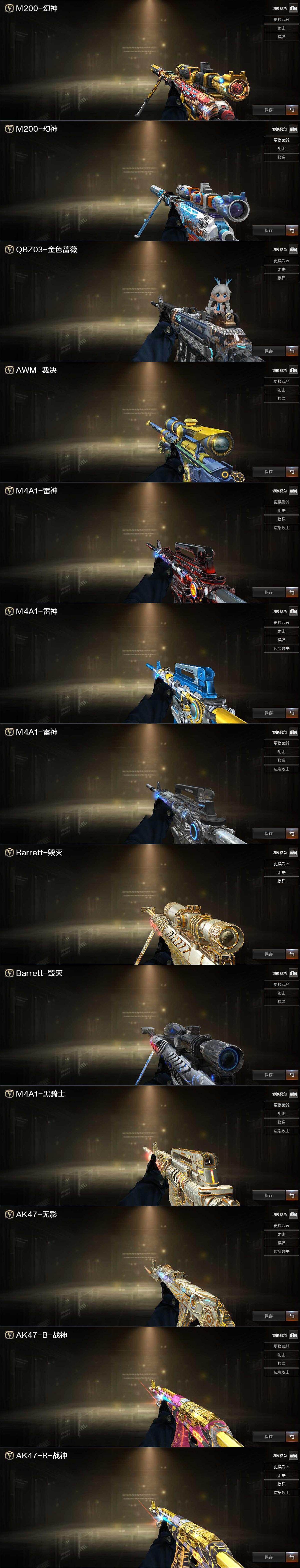 【热门武器】:QBZ03-金色蔷薇,HK417-朱雀,M200-幻神,荣耀世冠-柯尔特,M4A1-黑骑士*5,汤姆逊-烈龙*8,RPK-盘龙*3,加特林-炼狱,斯泰尔-蝴蝶,降世魔童,COP 357-雷霆王者,沙鹰-修罗*6,荣耀世冠-龙啸