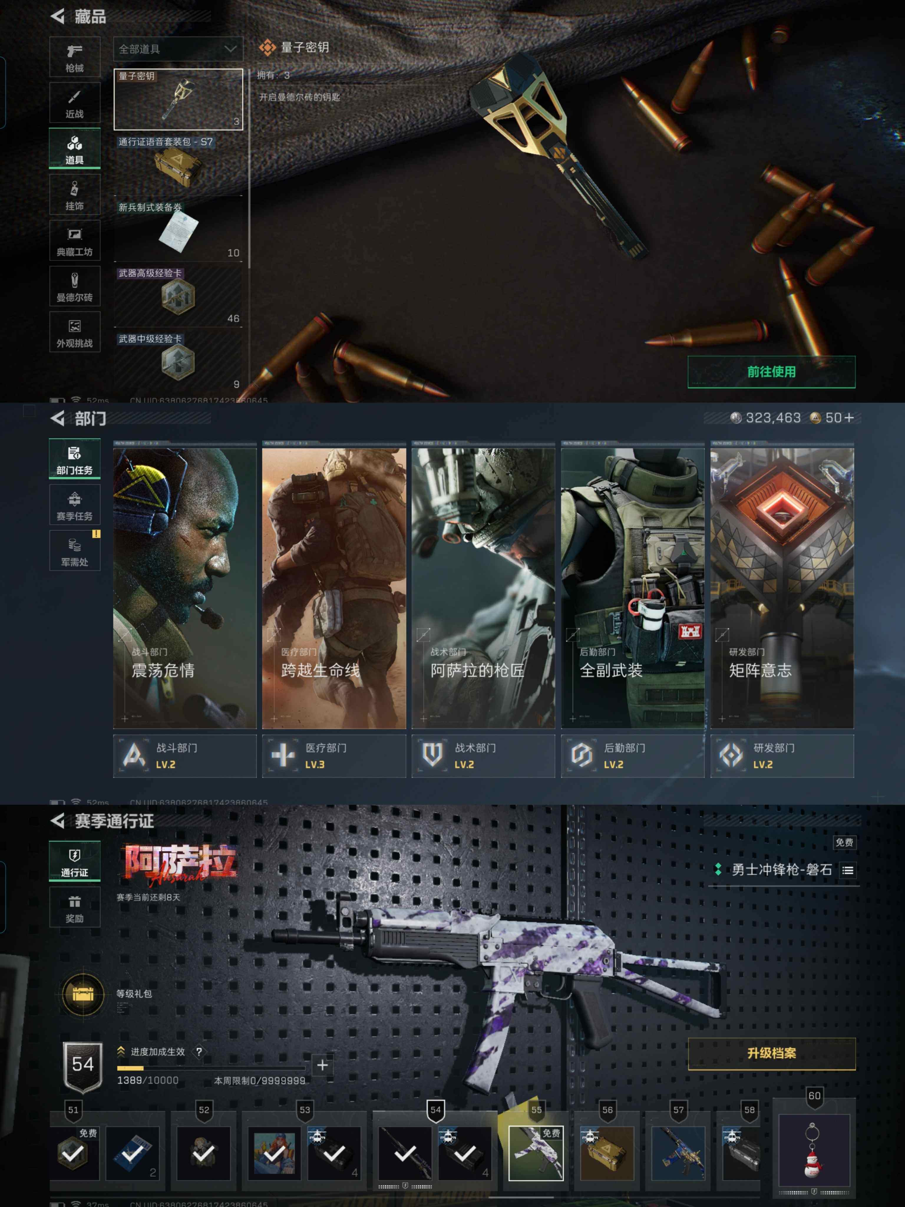 zl18,三端互通58级,总资产4.1M,1橙皮枪突击步枪运动员,3x2,1金挂饰