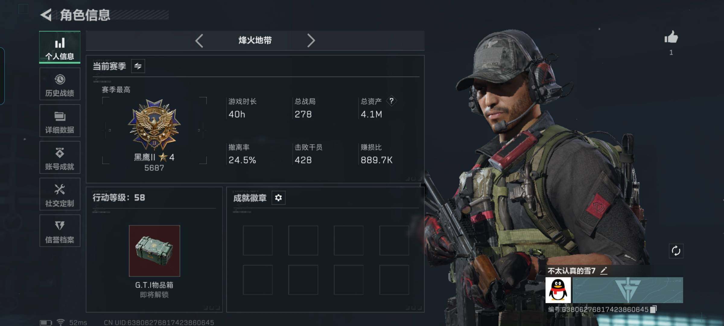 zl18,三端互通58级,总资产4.1M,1橙皮枪突击步枪运动员,3x2,1金