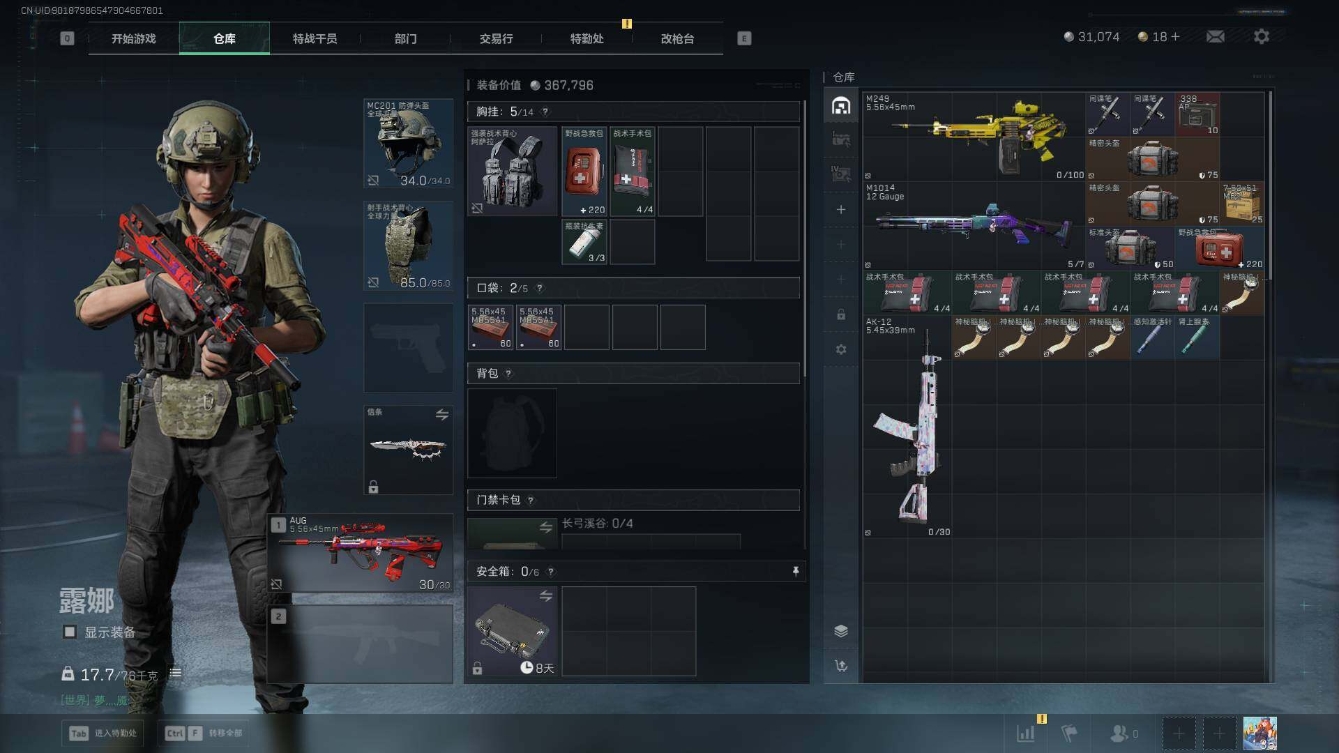 总资产(M):12M/哈夫币(K):31K/传说枪皮数:3/全面战场等级:1_段位:无段位/烽火地带等级:35_段位:铂金/