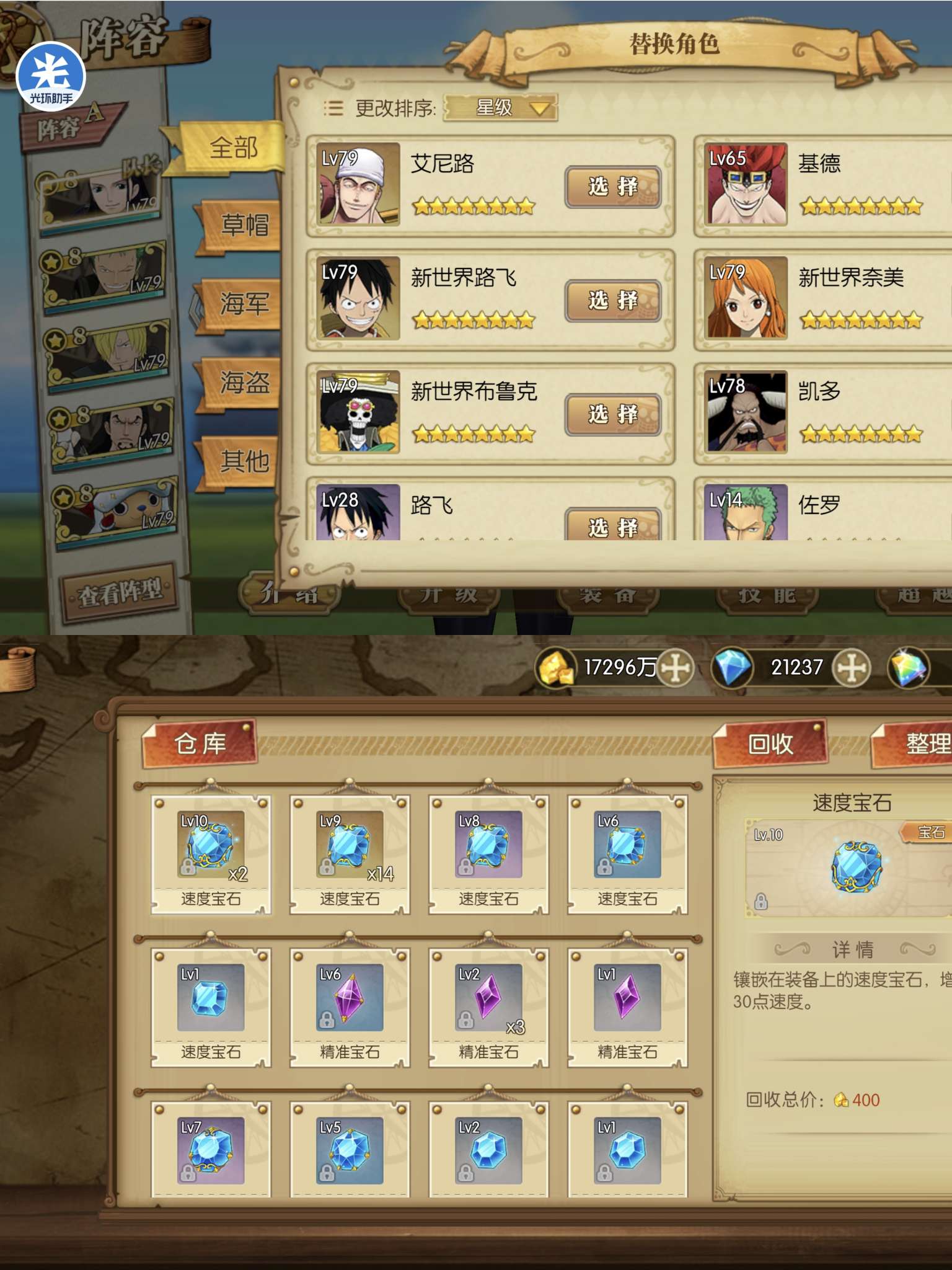 10级草帽pve船 宝石半套10 3套半9 看图400w战力后面是同号不同区