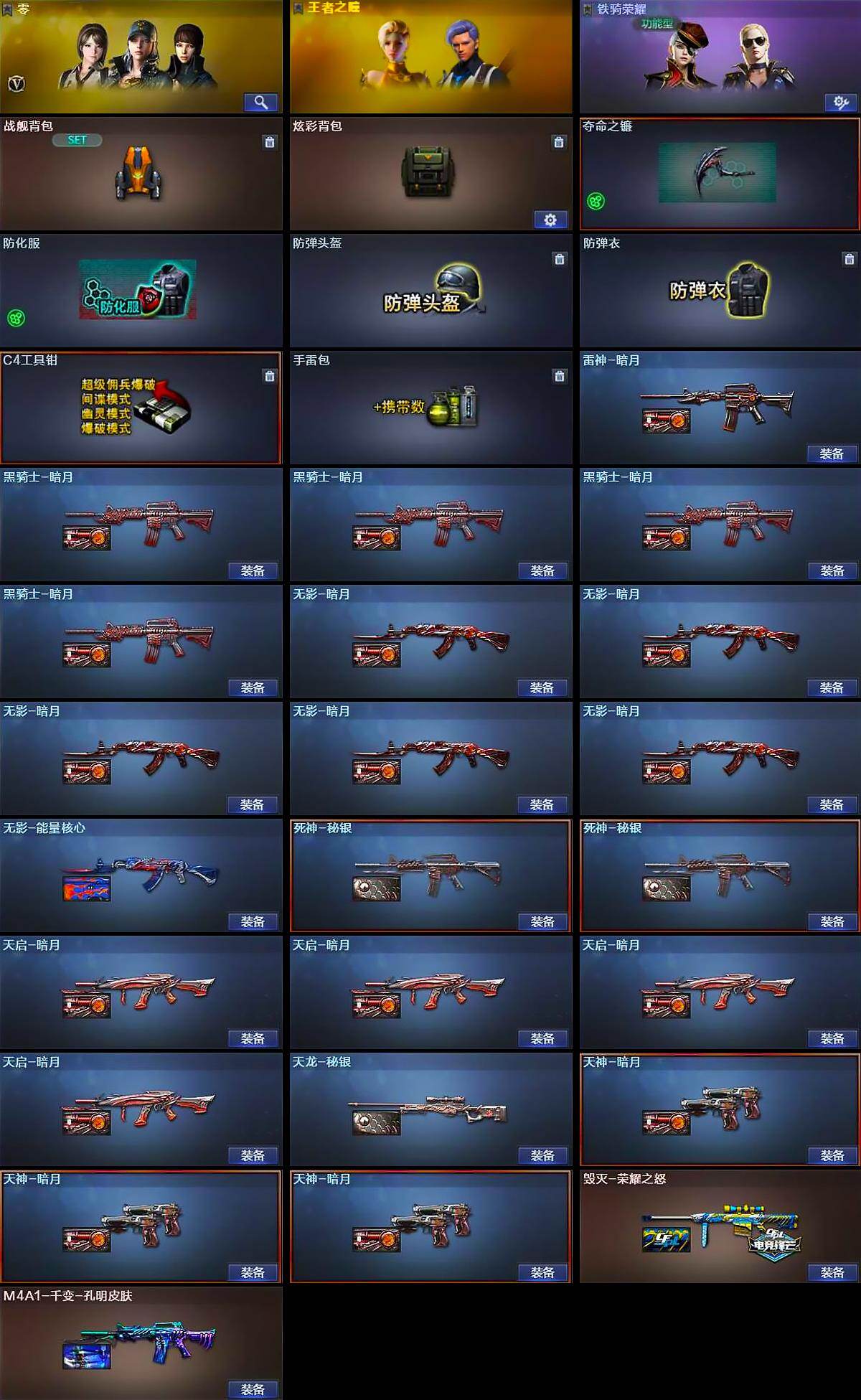 【皮肤】:雷神-暗月,毁灭-荣耀之怒,M4A1-千变-孔明皮肤,黑骑士-暗月*4,无影-暗月*5,无影-能量核心,死神-秘银*2,天启-暗月*4,天龙-秘银,天神-暗月*3