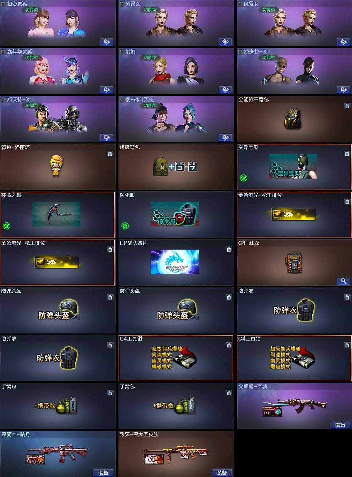 【道具】:全能枪王背包,背包-洛丽塔,超级背包,变异宝贝,夺命之镰,防化