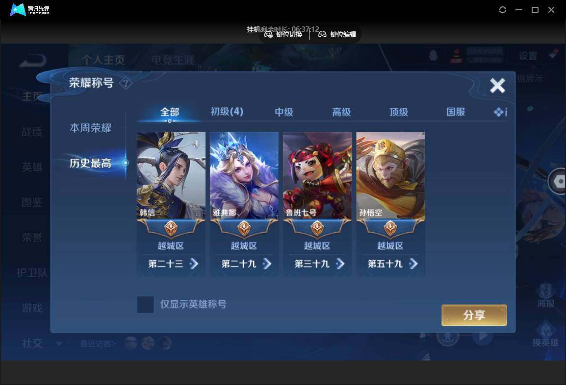 【W4995】【8.7k场次】营地ID:357268384【爆款臻稀皮肤:鸣剑曳影,凤求凰,太华,武陵仙君,异界灵契,挚爱之约】苹果q-有二次-贵7-127英雄-187皮肤-1典藏-2星元-13传说-58限定-1天幕-1按键-贵族积分3.4w