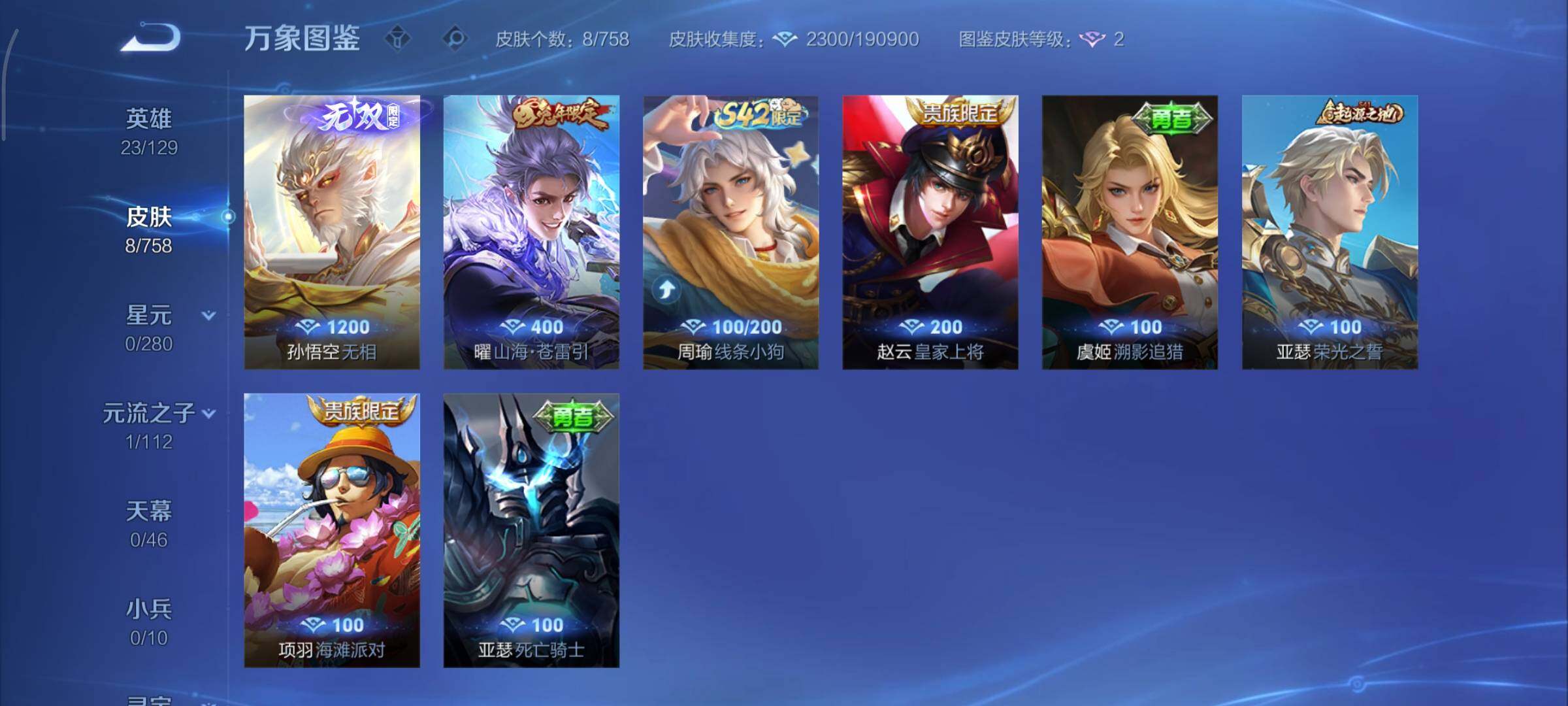 可换绑 1按键 五级铭文4 可二次CD16299 安卓Q-V5-8皮肤-1无双-1传说-1史诗【无双皮肤】:孙悟空无相【传说皮肤】:曜山海苍雷引【限定皮肤】:赵云皇家上将,项羽海滩派对,曜山海苍雷引【年限皮肤】:曜山海苍雷引【史诗皮肤】:赵云皇家上将,周瑜线条小狗【其他皮肤】:项羽海滩派对,亚瑟死亡骑士,亚瑟荣光之誓,虞姬溯影追猎