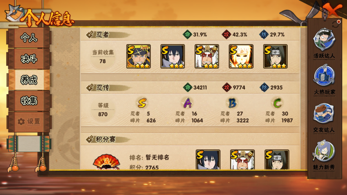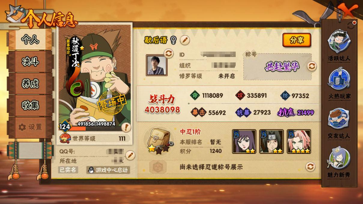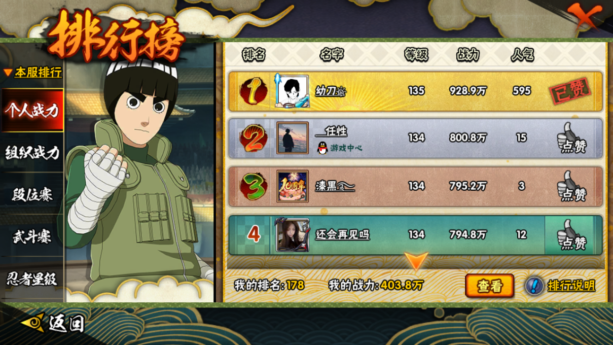 403w战力紫狗金水5S+卑留呼16A战力403忍者总数78