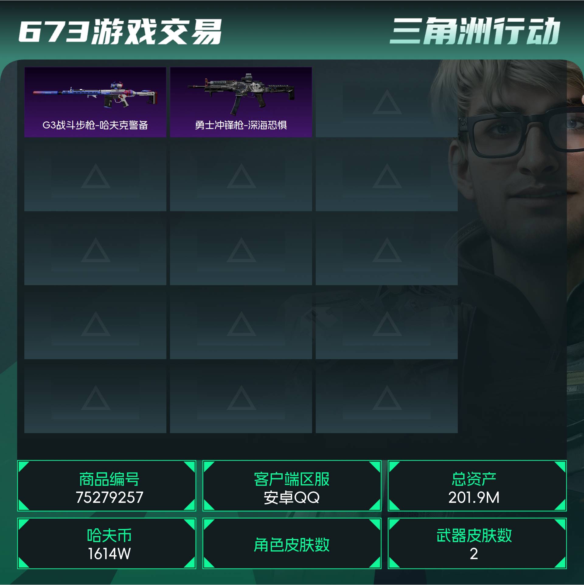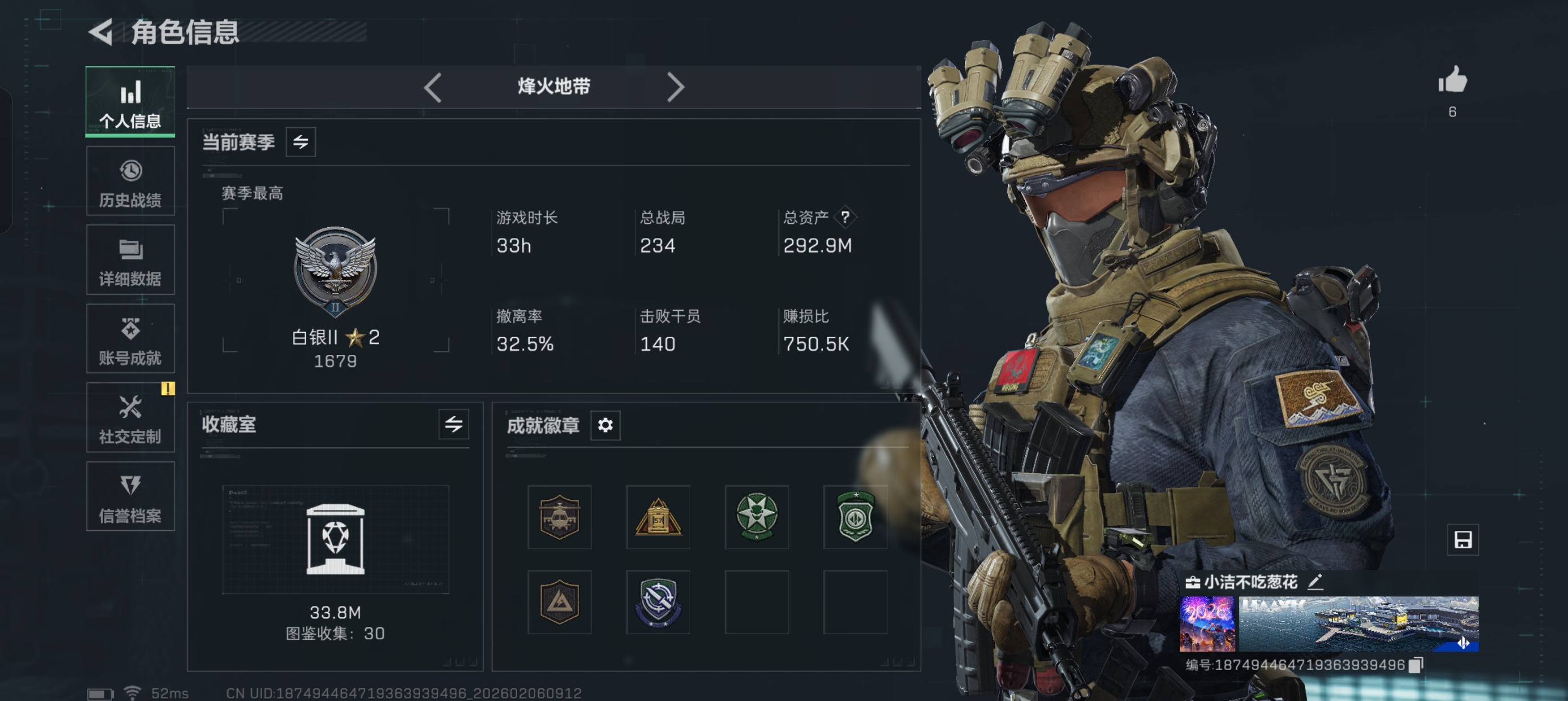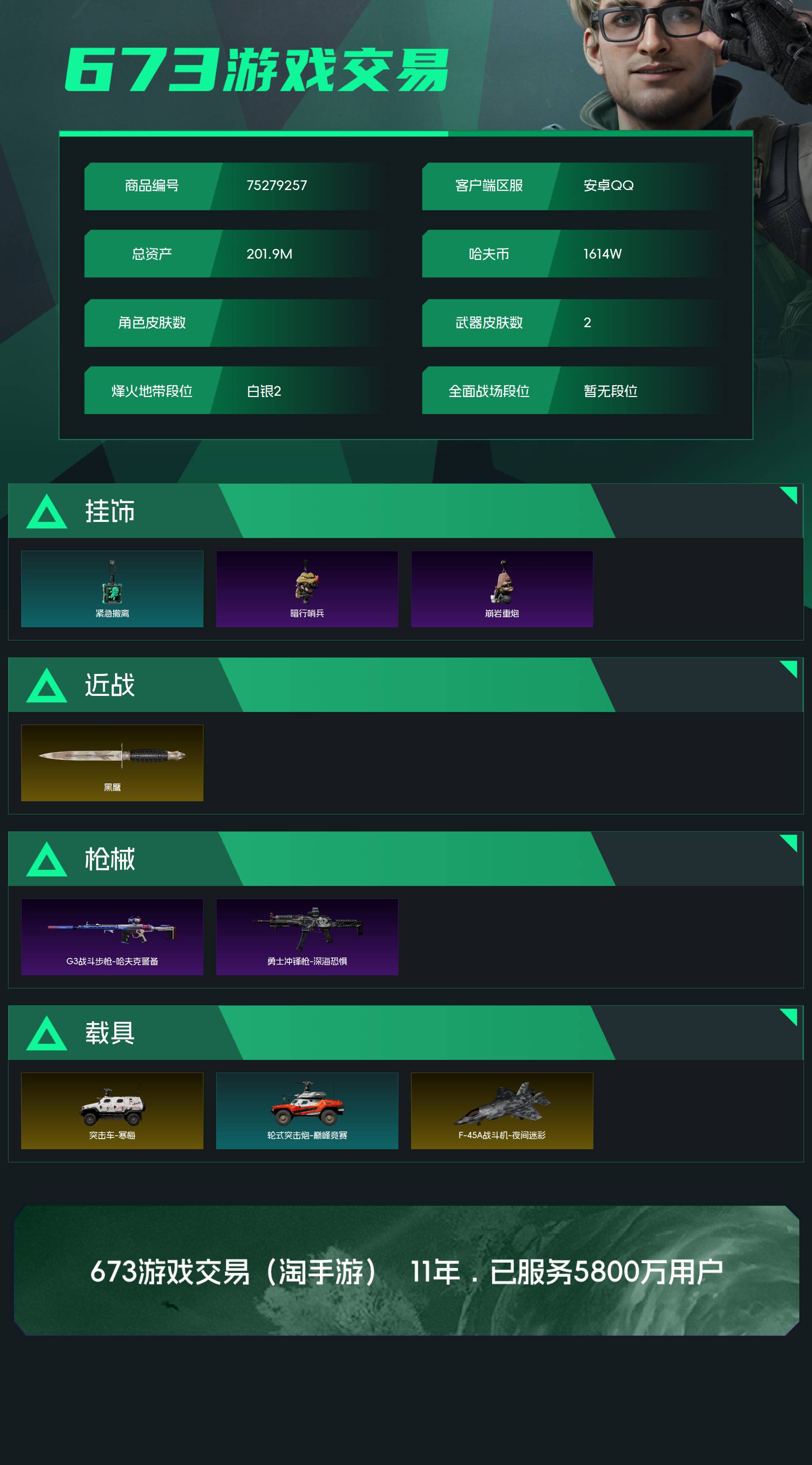 烽火段位白银2 战场段位暂无段位 总资产201.9M 哈夫币1614W 挂饰3 近战1 枪械2 载具