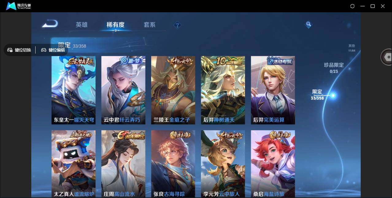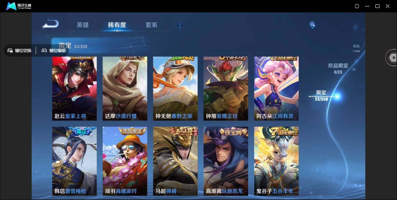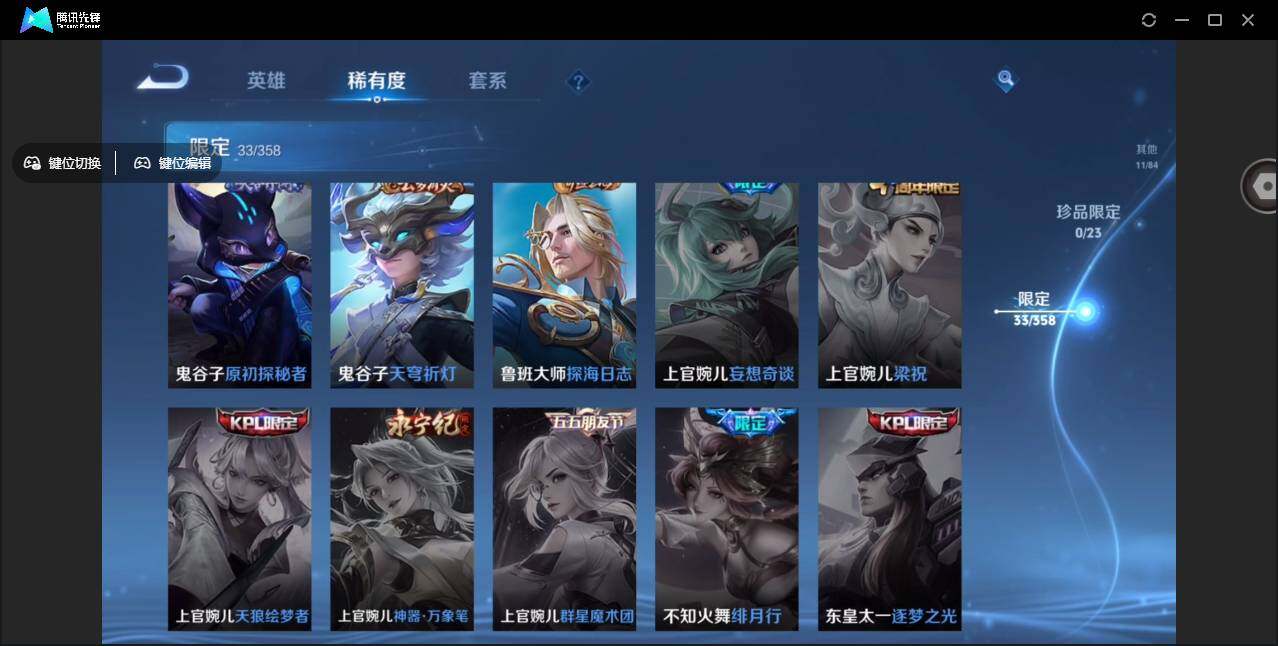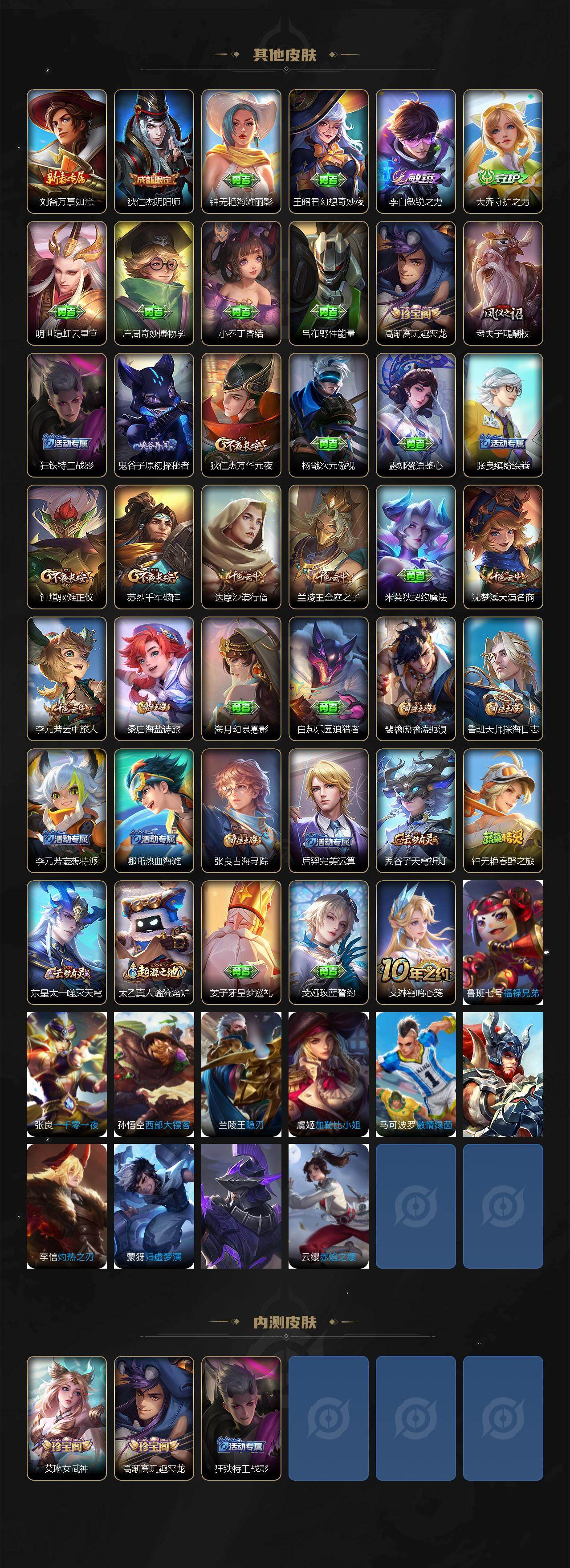 【限定皮肤】:狄仁杰阴阳师,赵云皇家上将,庄周高山流水,高渐离玩趣恶龙,甄姬游园惊梦,狄仁杰万华元夜,达摩沙漠行僧,项羽海滩派对,老夫子醍醐杖,韩信傲雪梅枪,兰陵王金庭之子,李元芳云中旅人,钟馗驱傩正仪,鬼谷子原初探秘者