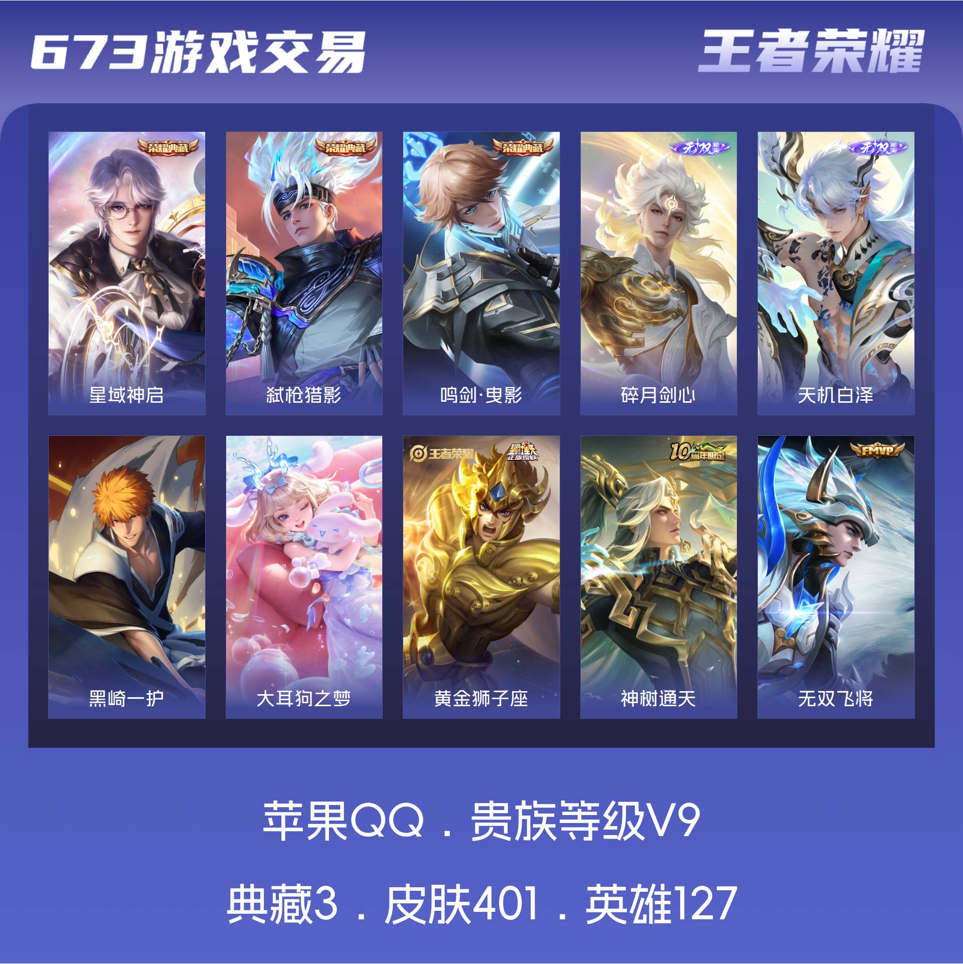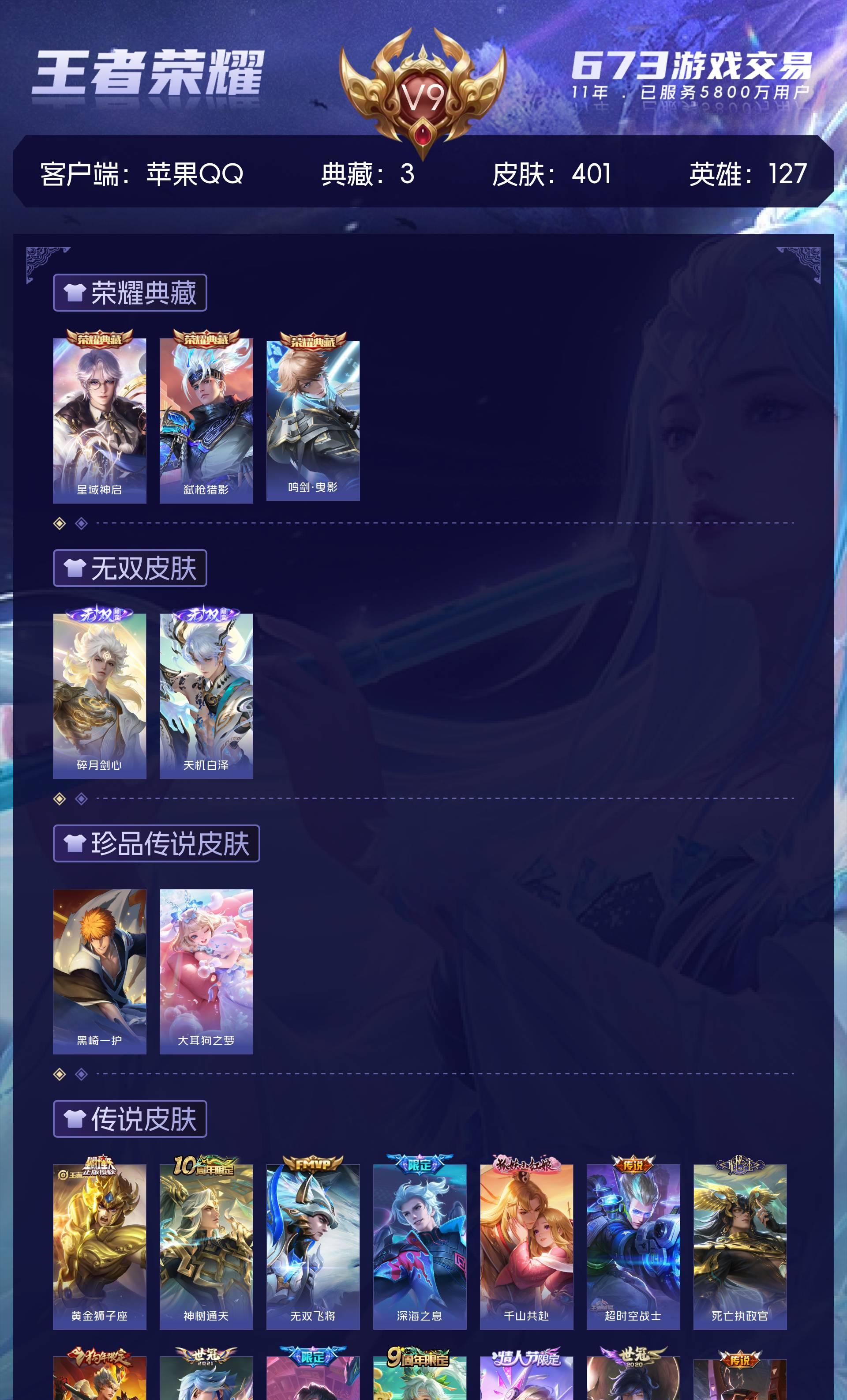 苹果QQ/非凡王者/401皮肤/127英雄/3典藏/0珍品无双/2无双/2珍品传说/17传说/117