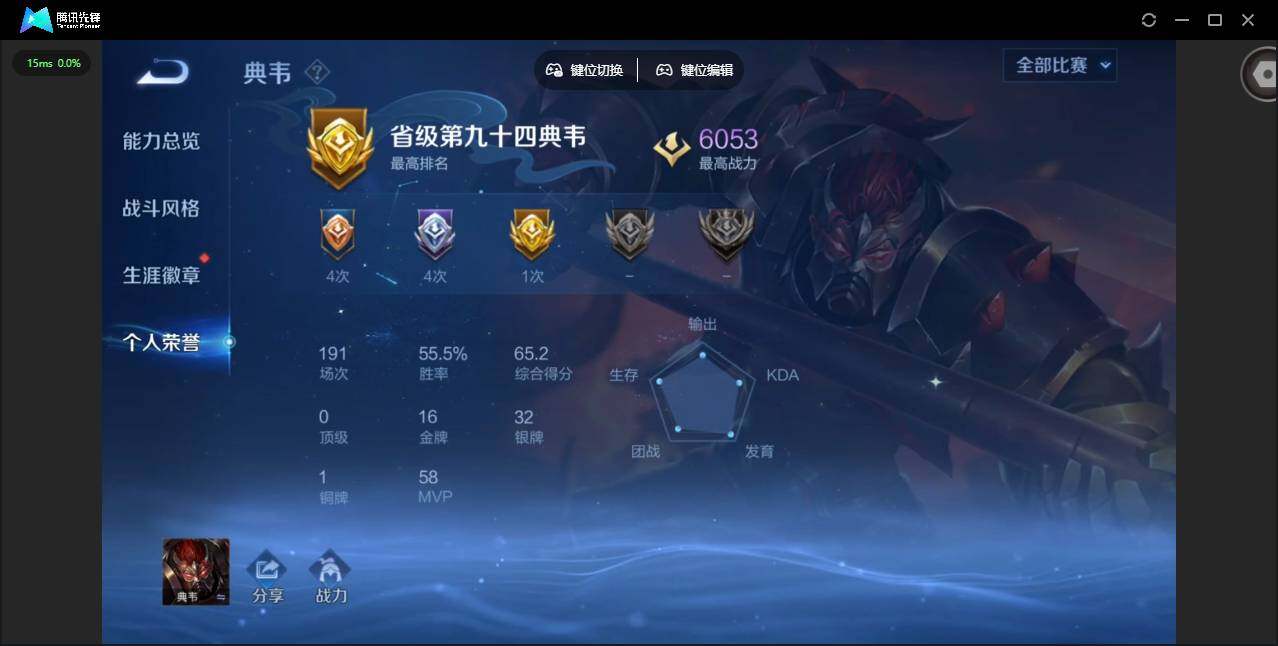 【金标典韦】实名: 可修改 贵族等级: V8 英雄数: 124 皮肤数: 21