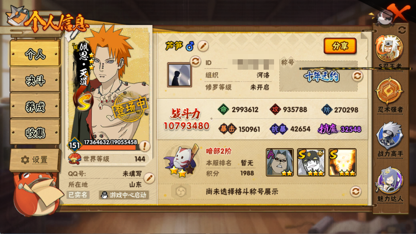 1079W战力 白破超 创斑 五影斑35S+298点券鸡翅+面麻 漂泊再不斩4个198直购43A+熊猫二尾通灵
